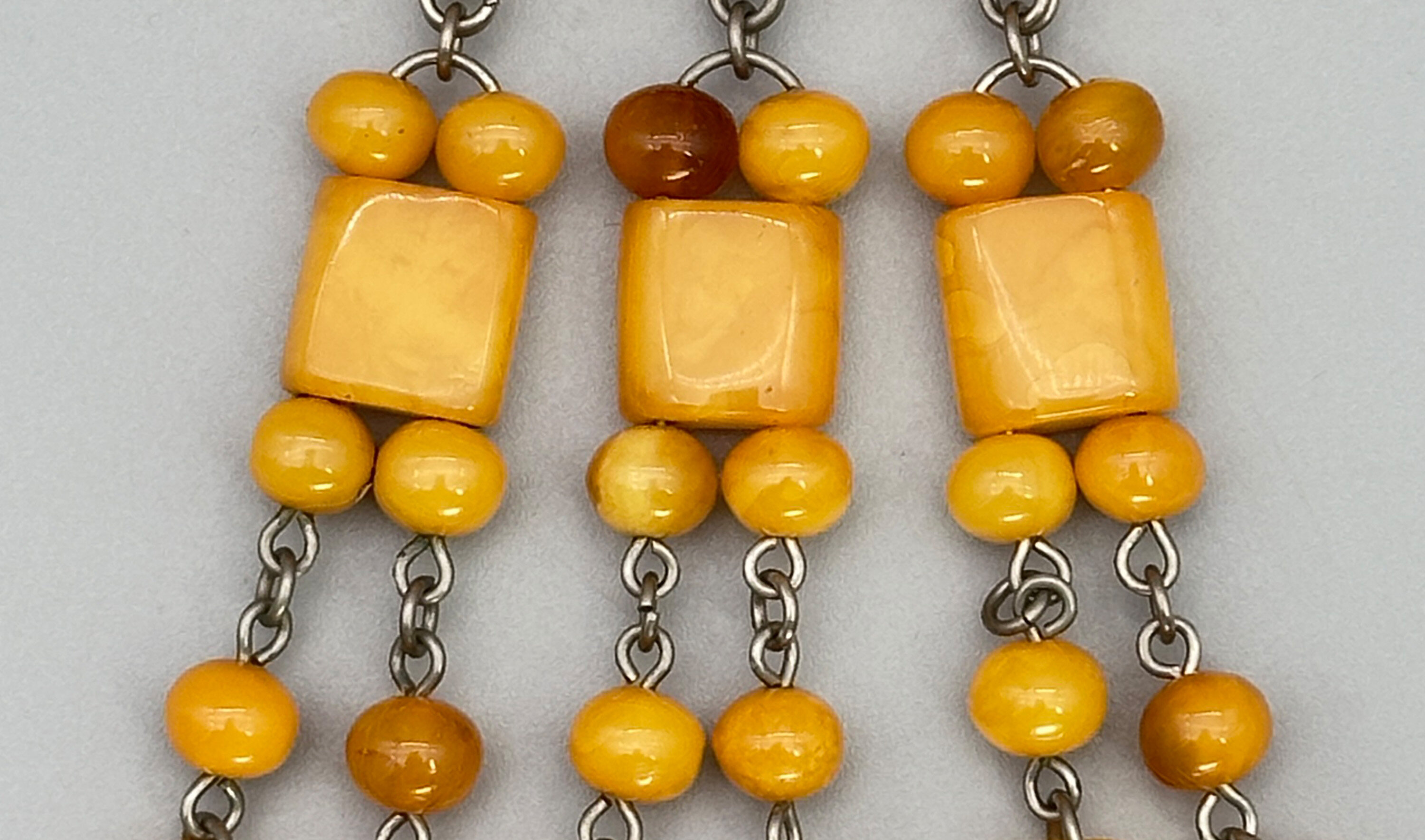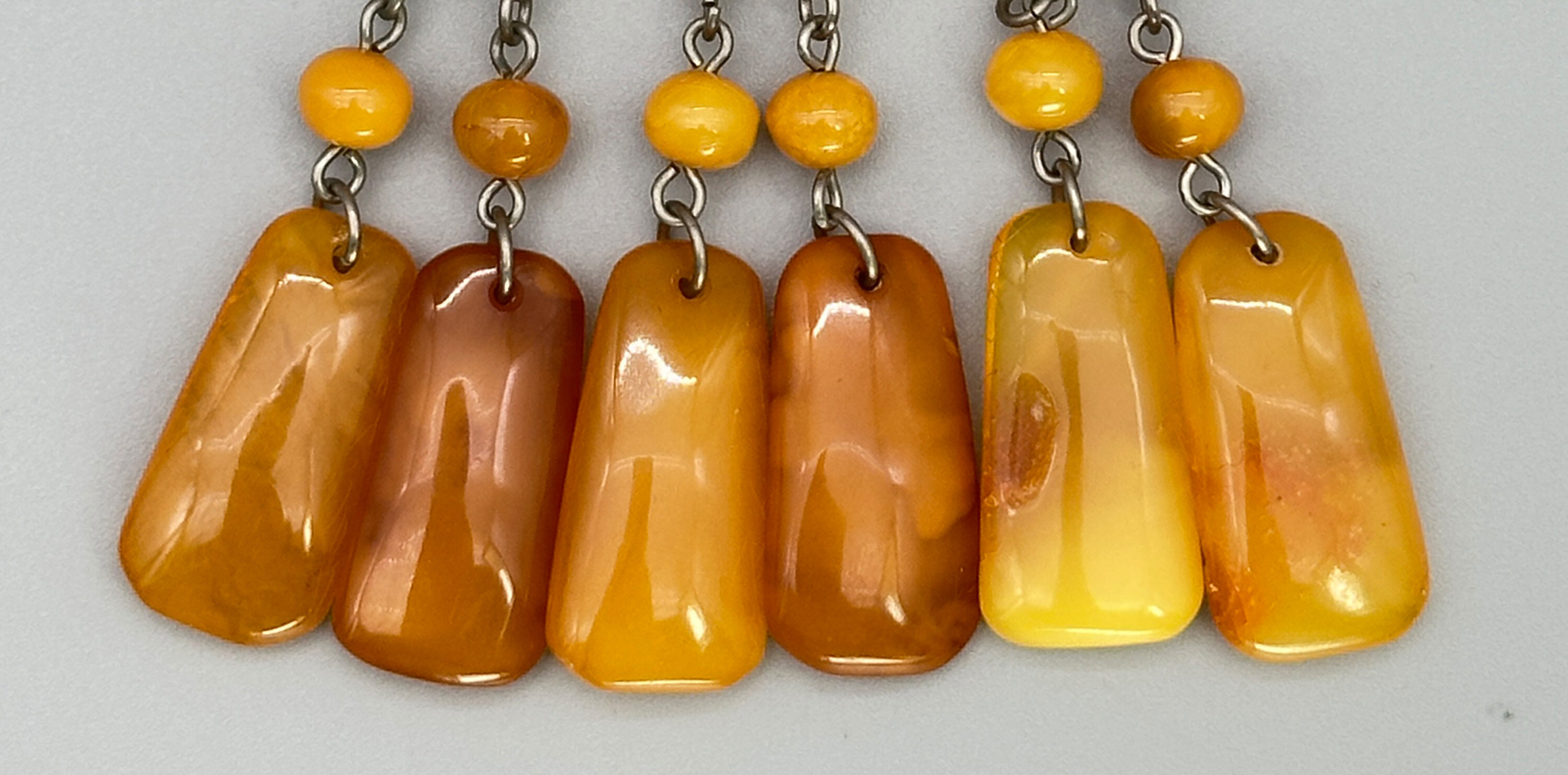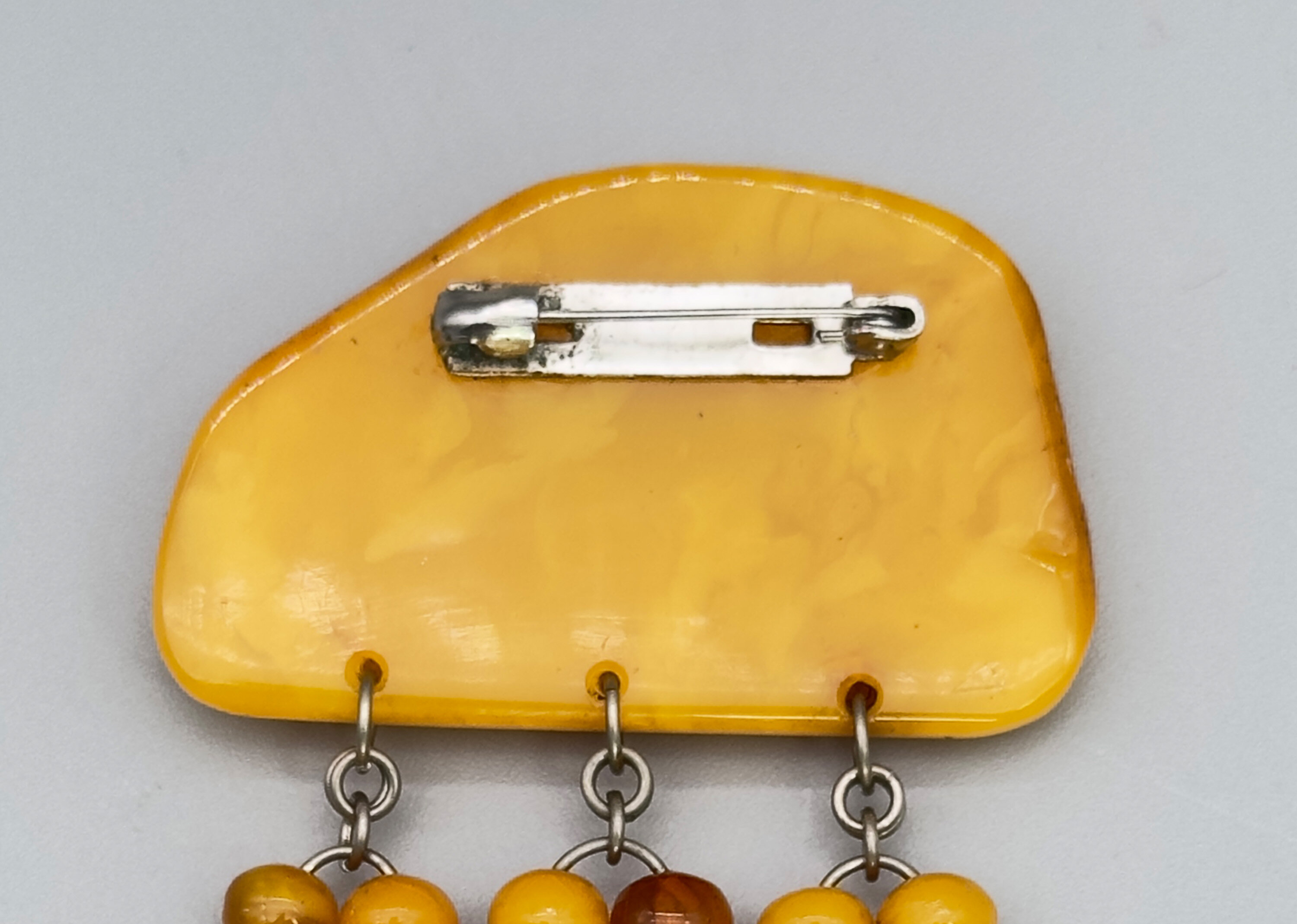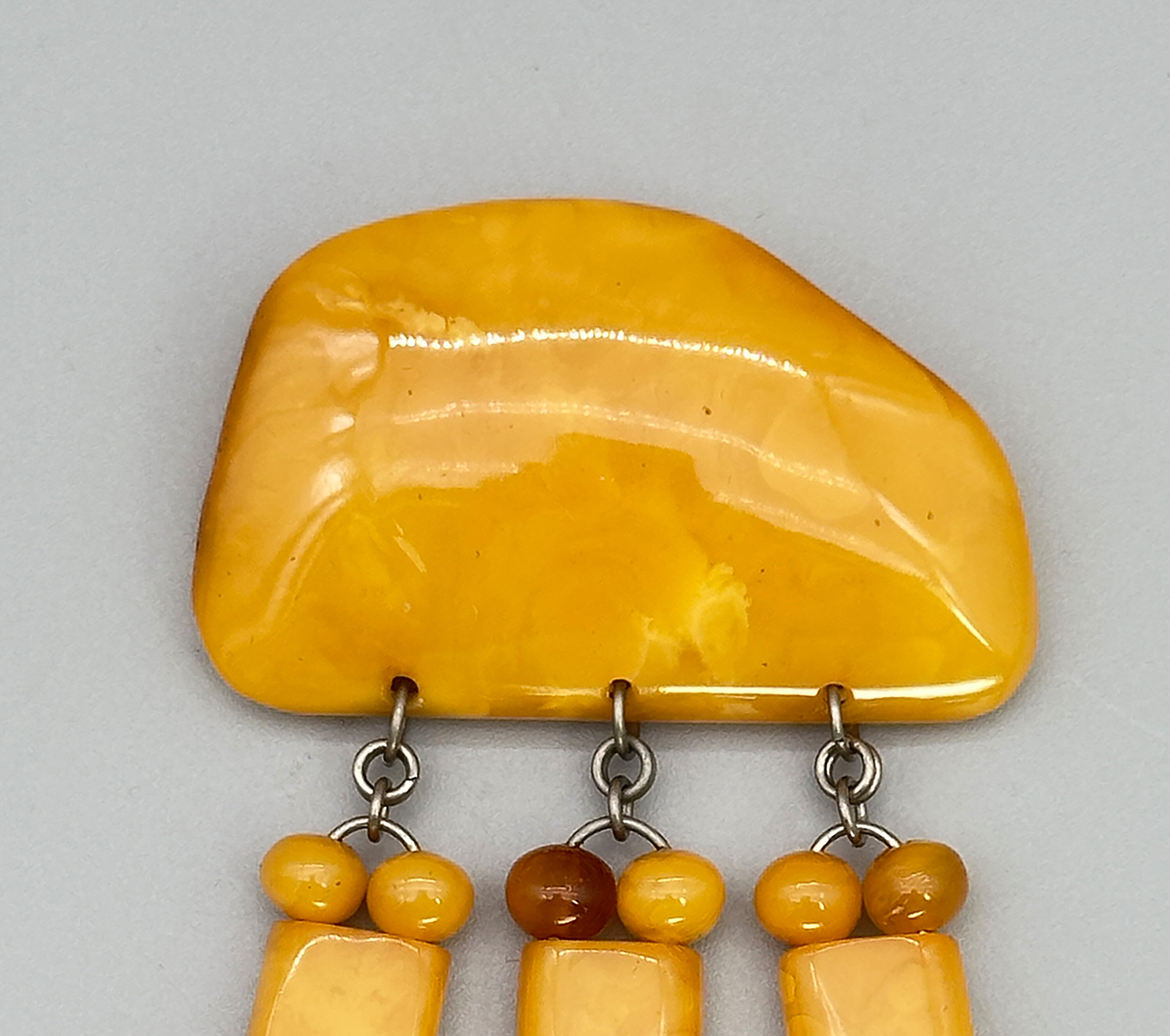 This is a massive statement brooch that comprises the most beautiful amber stones. It has a large main stone and there are three dangling elements.| Size: | 52 x 105.6 mm |