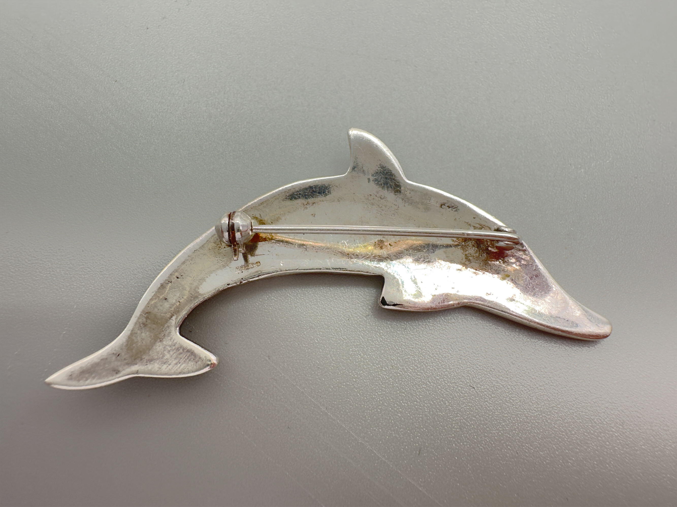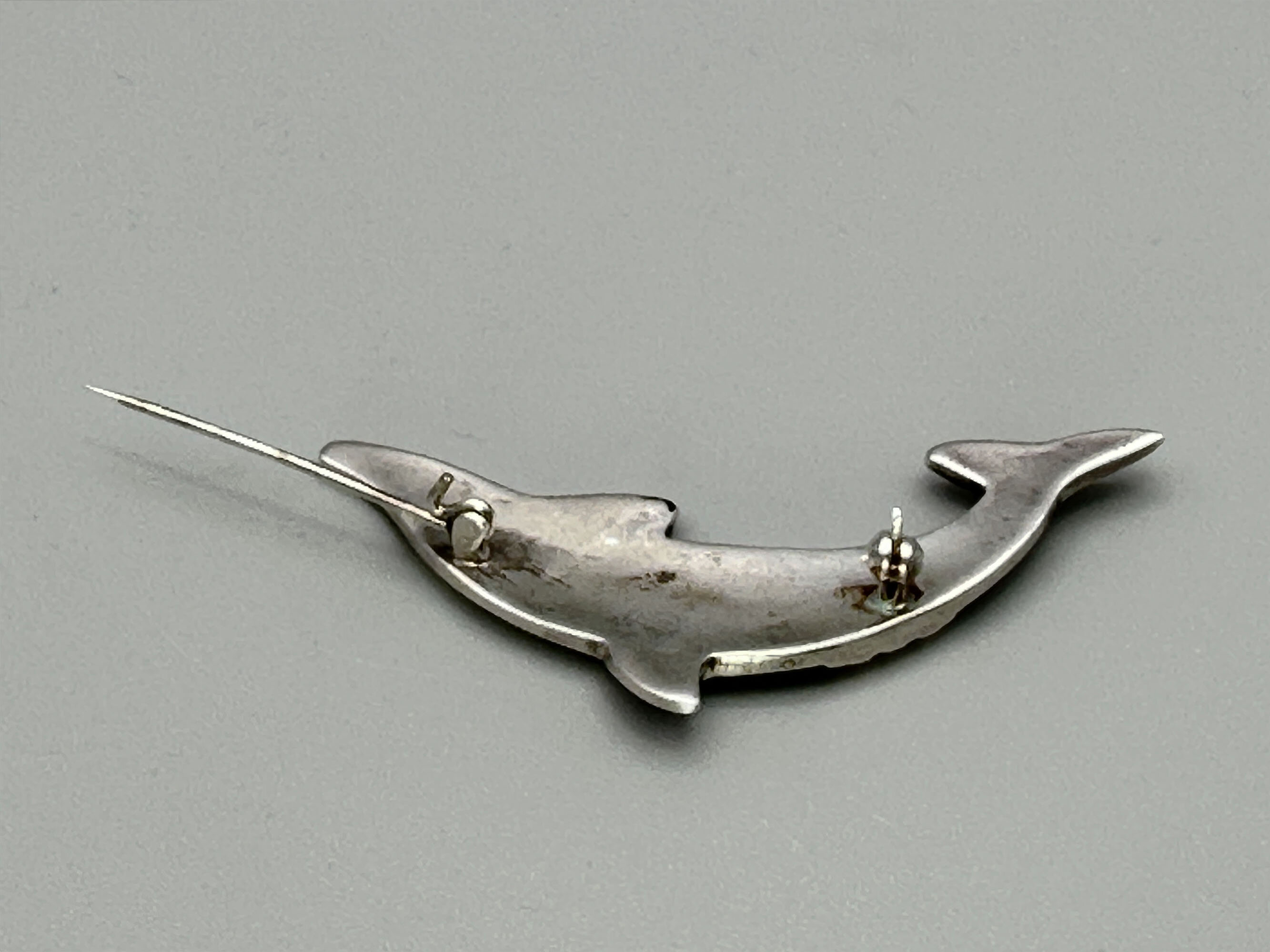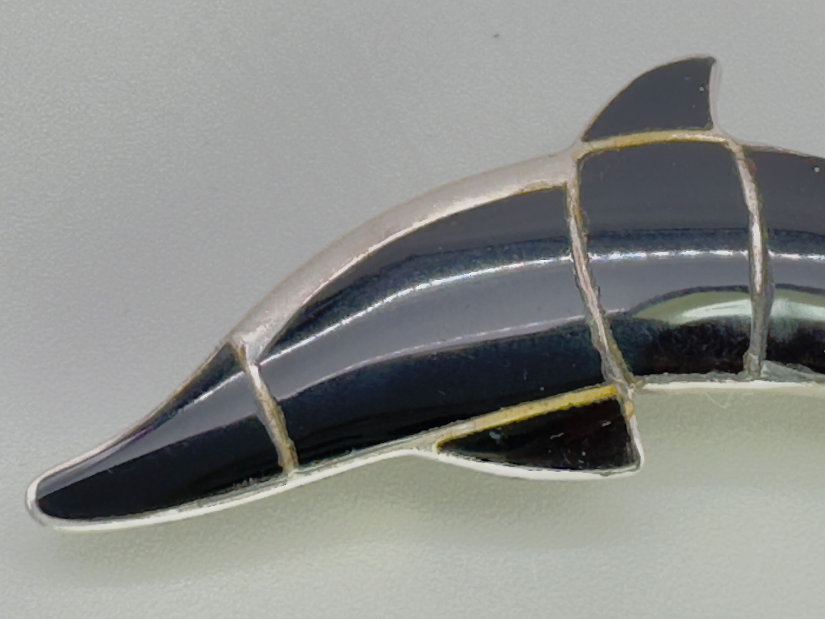 Modernist silver and onyx dolphin brooch, London 1991