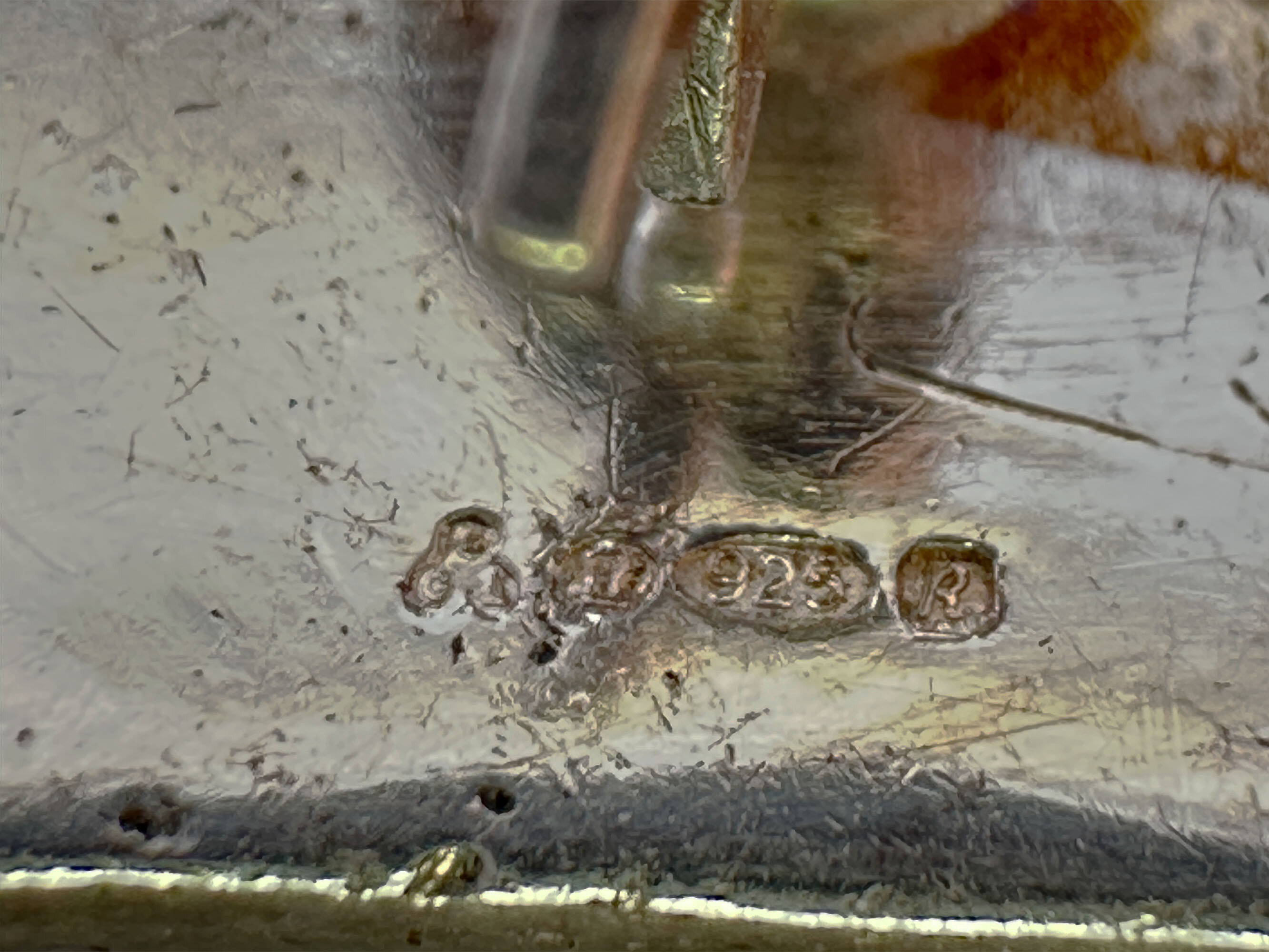 This is a strking brooch in a modernist design that depicts a jumping dolphin. It is silver set with onyx or agate stones. It is hallmarked London 1991 with a makers mark that is three circles.| Size: | 61.8 x 32.4 mm |