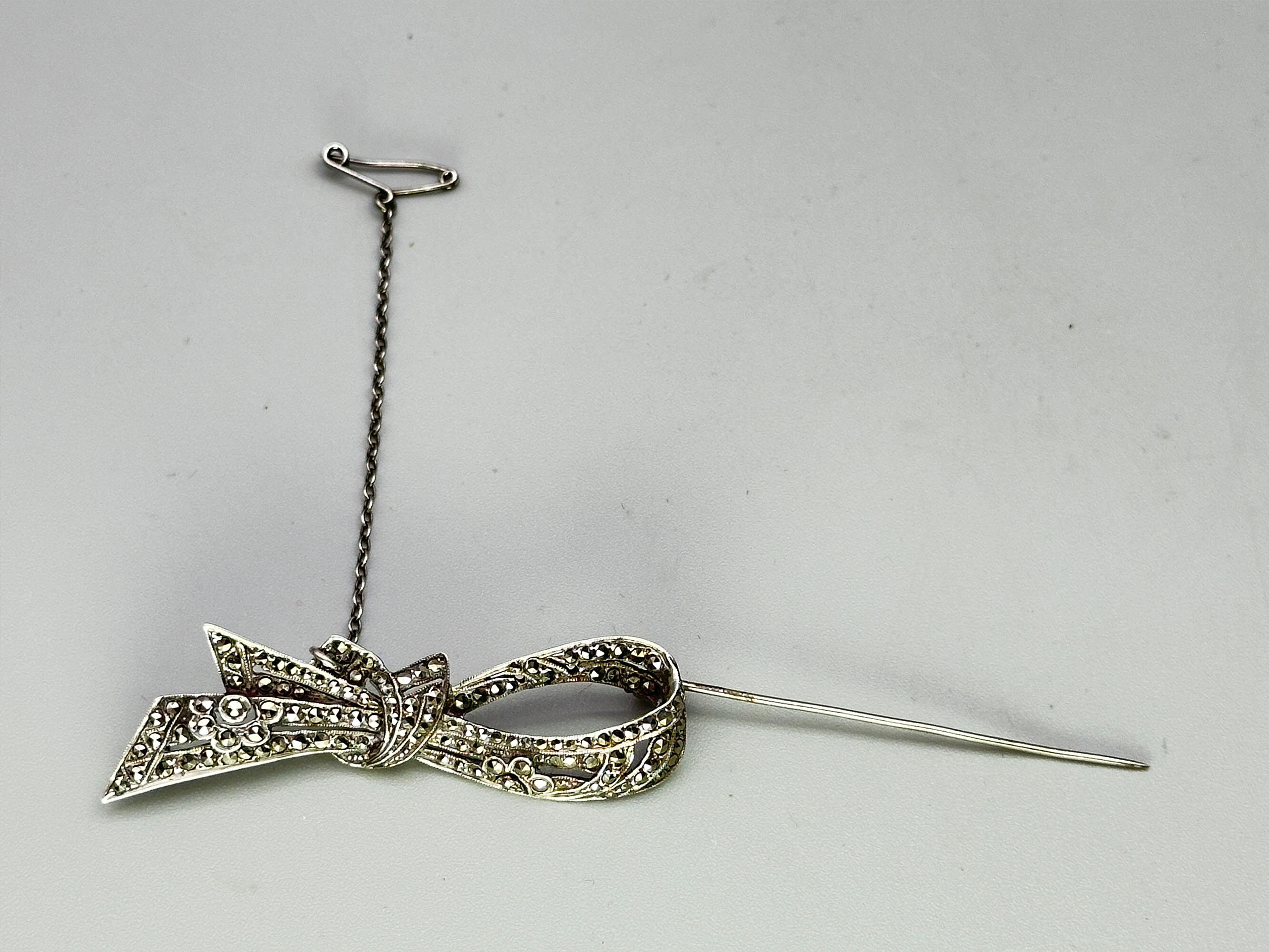 This is an excellent quality brooch in a riboon design set with bright marcasite stones. It bears a makers mark for T. M. & Co, Birmingham 1955| Size: | 58.3 x 16.6 mm |