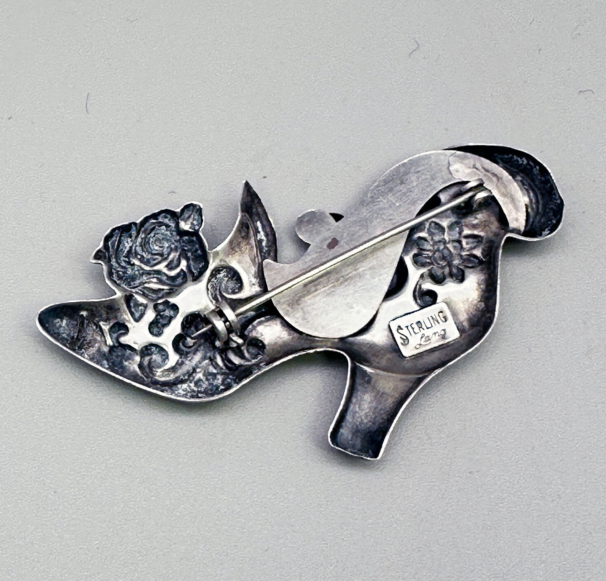 This is a very fun brooch that is in the shape of a decorative shoe. It is marked Sterling Lang. Lang was a well known American company that produced mainly costume jewellery but also has some silver pieces.| Size: | 44.9 x 52.6 mm |