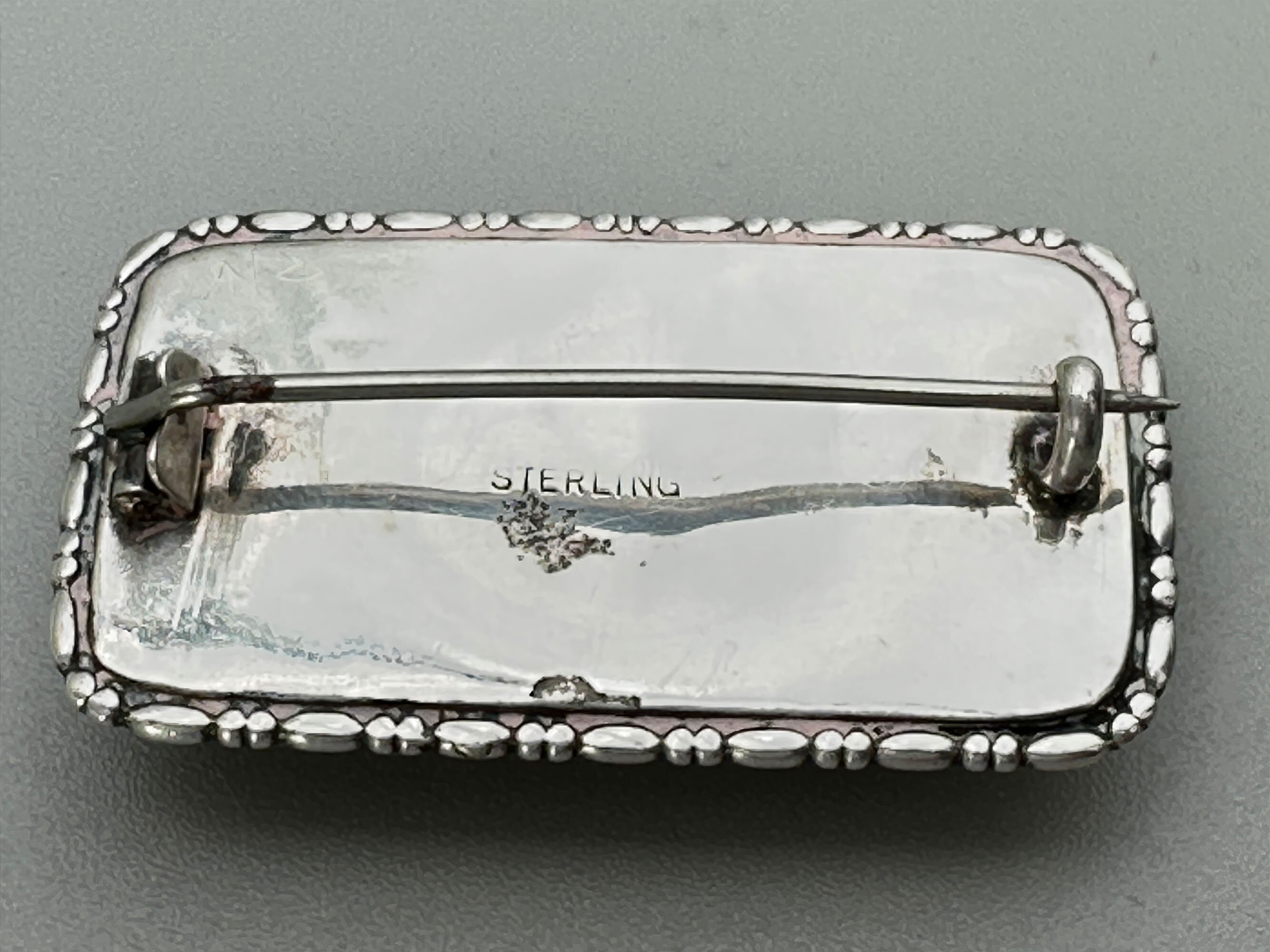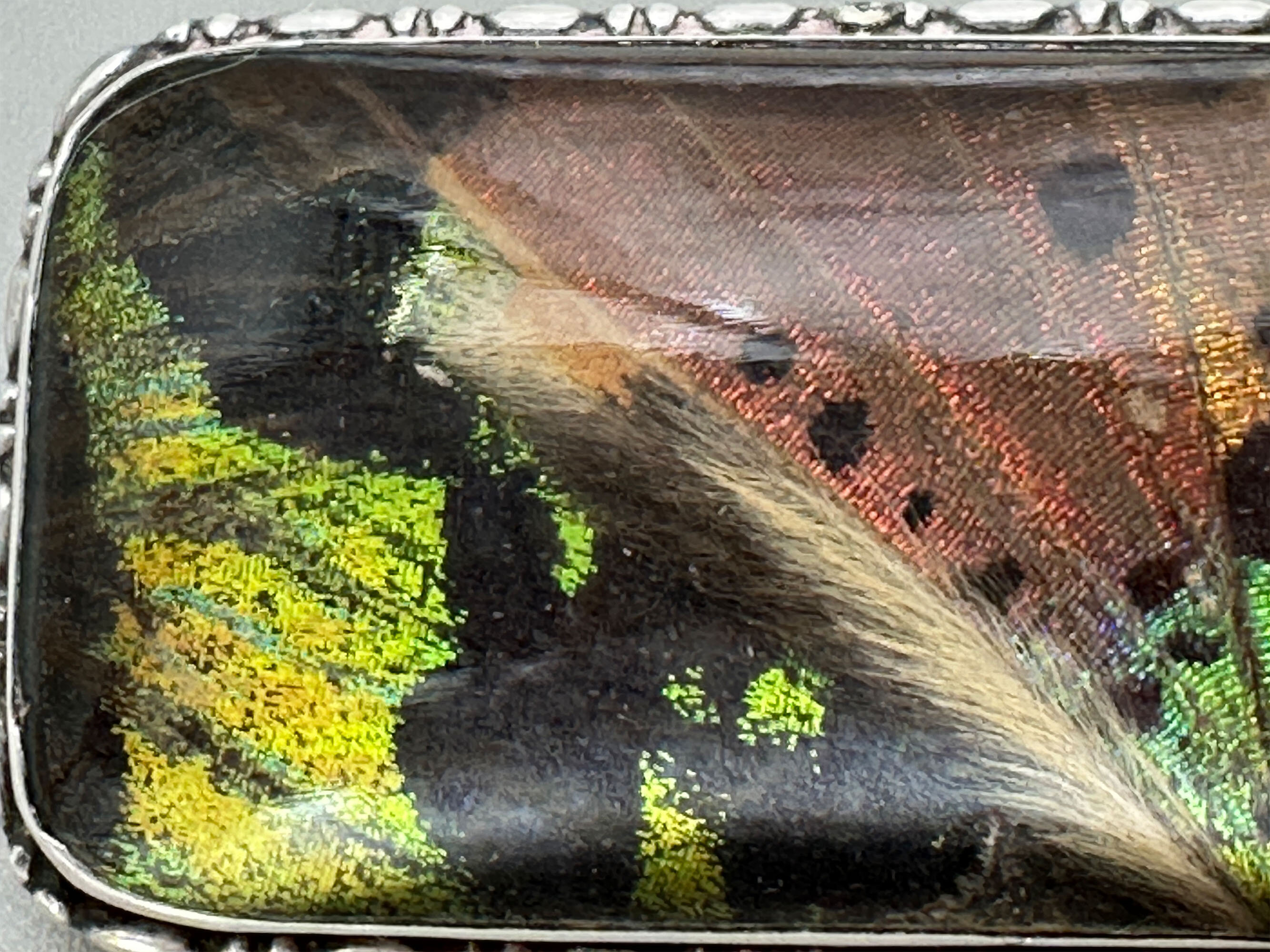 This is a lovely brooch that features a very unusual type ot butterfly wing. It is unusual that it is just showing the wing without an image over it but it is much more beautiful than those. It is covered with a glass cabachon stone and it is mounted in silver. It is marked Sterling so most likely it is American.| Size: | 40.7 x 22.6 mm |