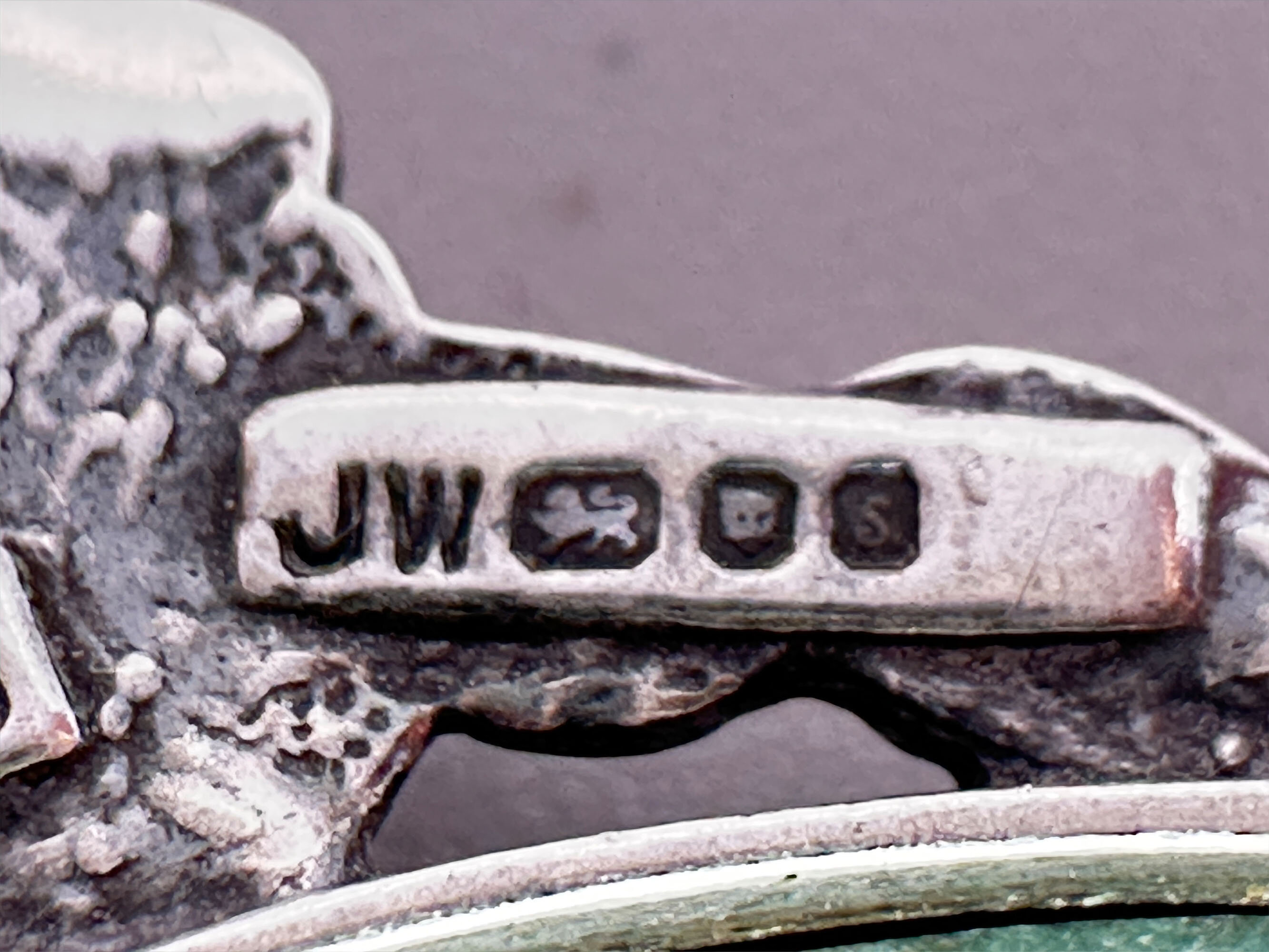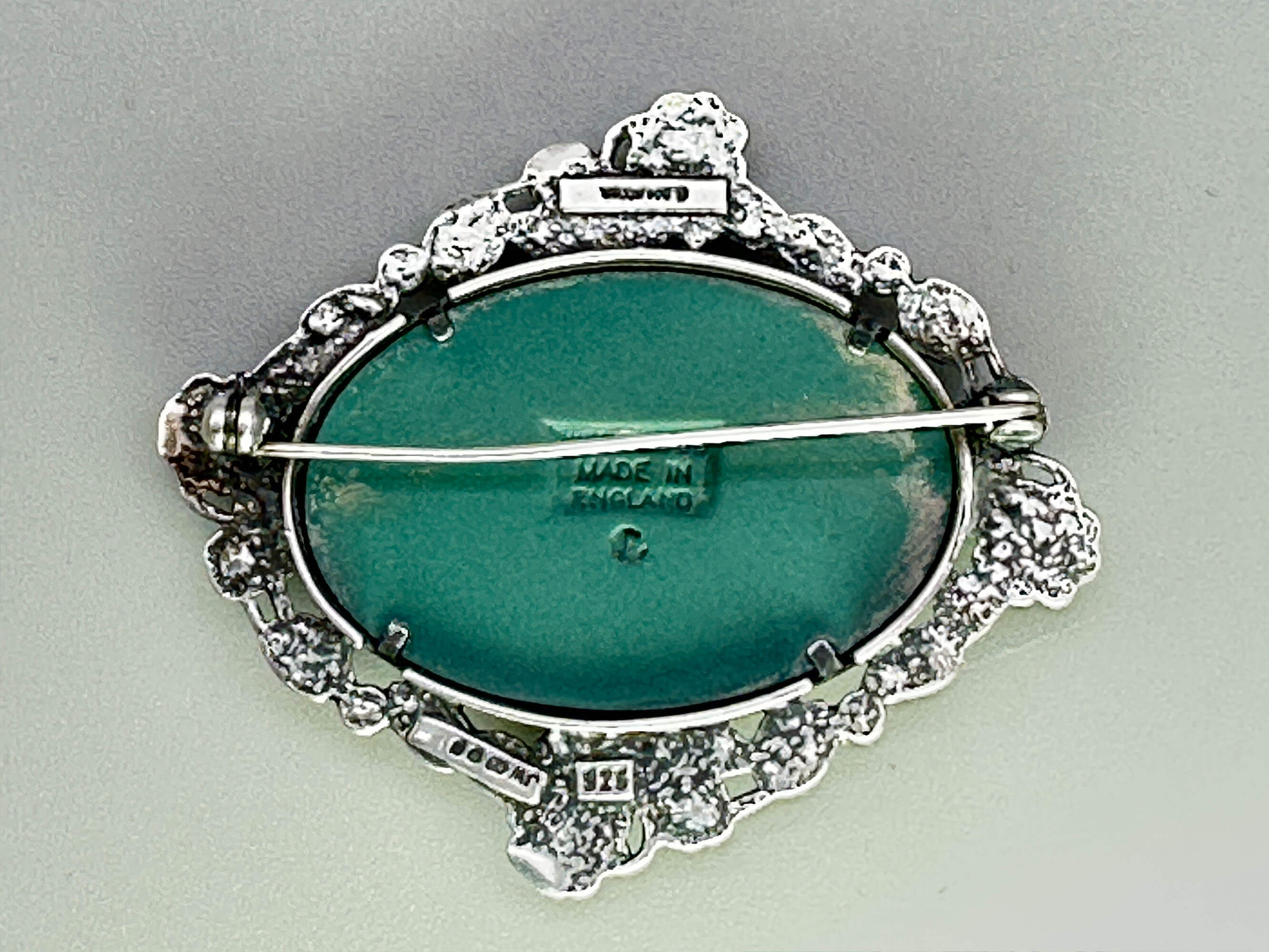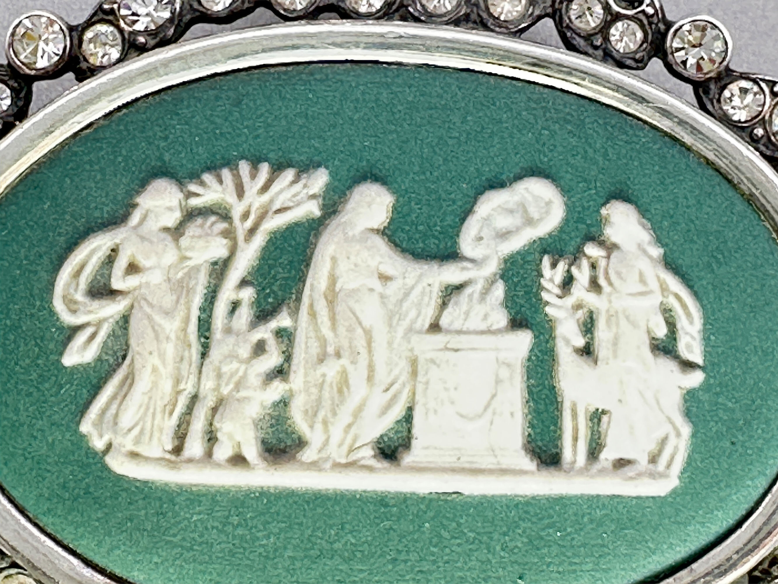 This is a very unusual brooch that comprises an excellent quality neoclassical Wedgwood plaque that is mounted in silver with paste stones. It is hallmarked JW with London hallmarks that date it to 1973. JW stands for Josiah Wedgwood & Sons Ltd. Wedgwood had their own silver workshop where they created many pieces set in sterling silver mainly in the 1970s and 1980s.| Size: | 56 x 45.7 mm |