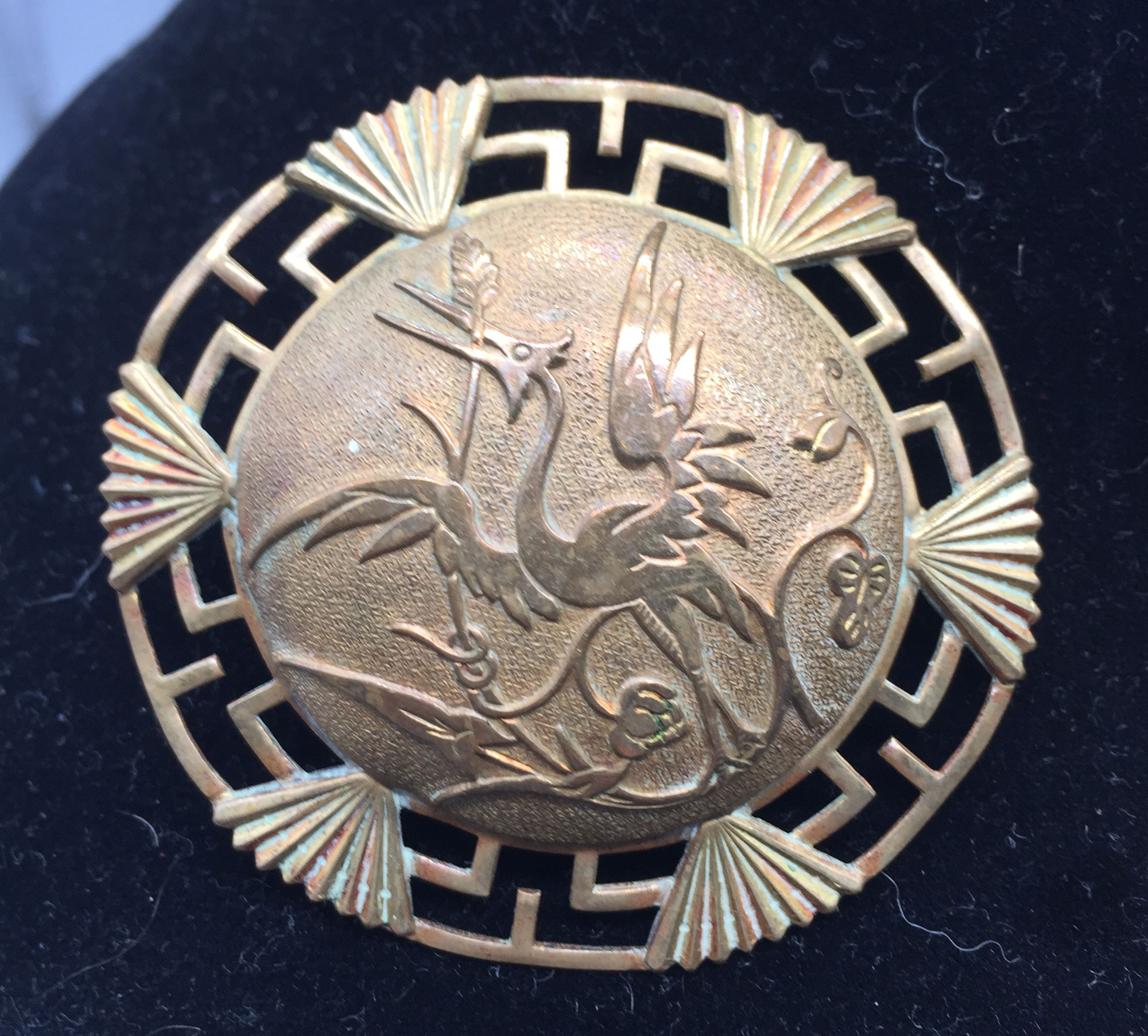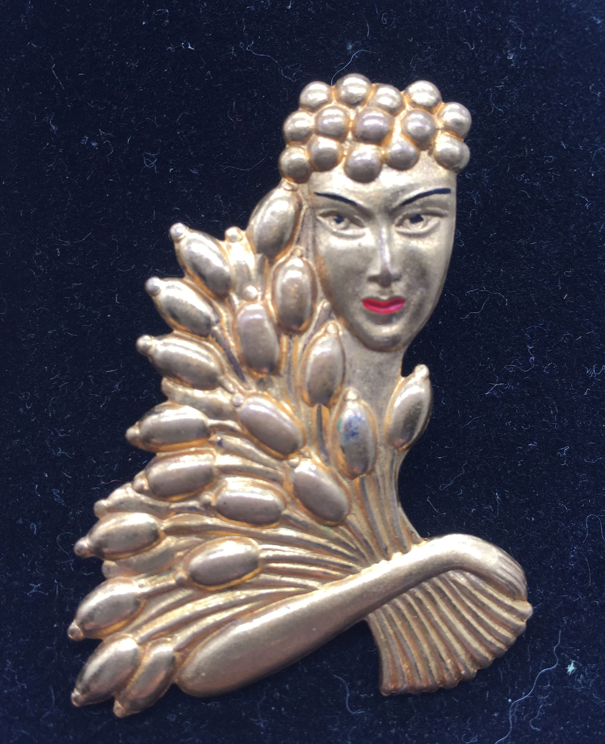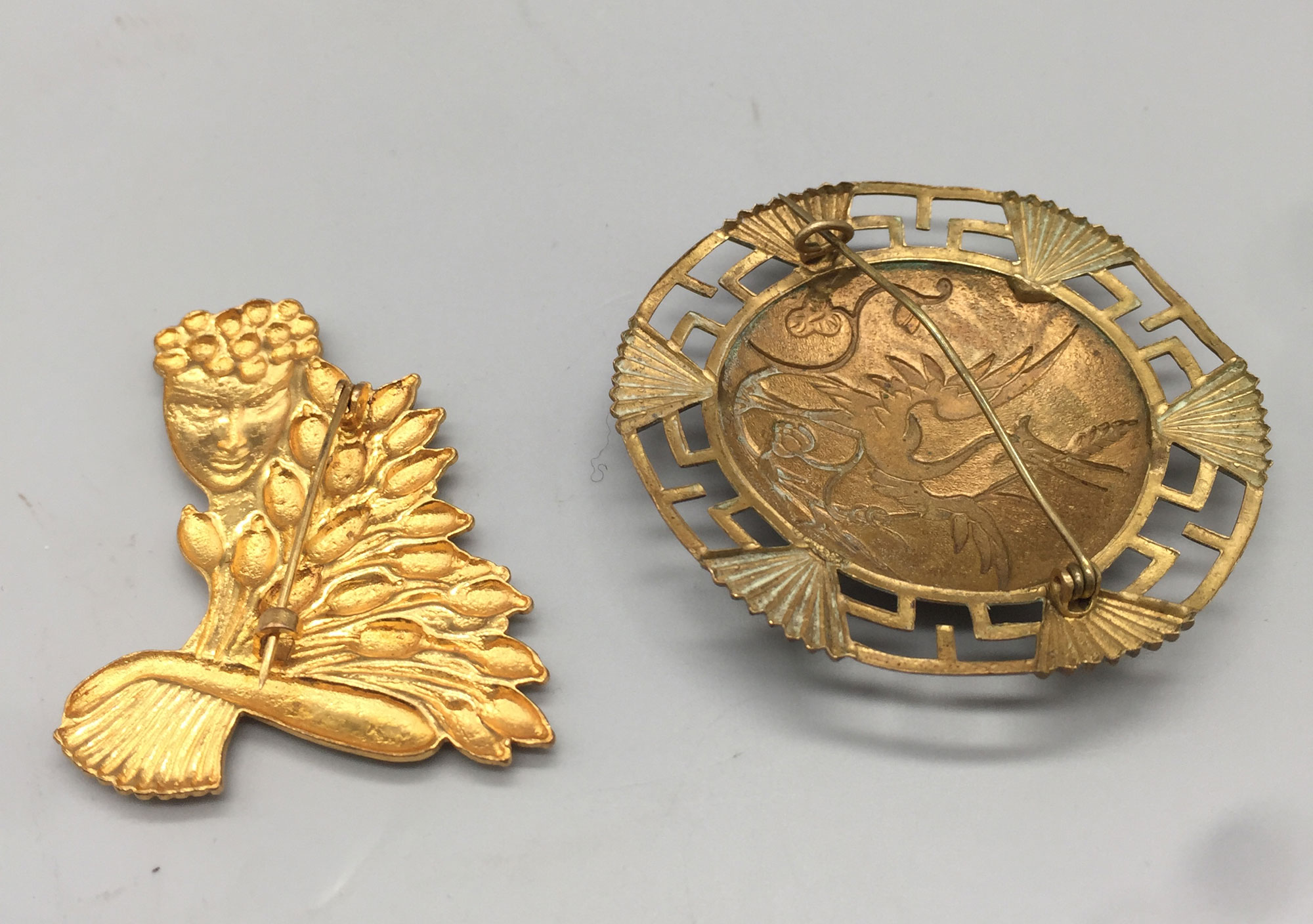 This is two brooches - one is Japanese Art Deco with a crane motif the other is English depicting the Goddess of the Harvest, both are yellow metal| Size: | Crane 6 cm diameter, Goddess 5 cm high |