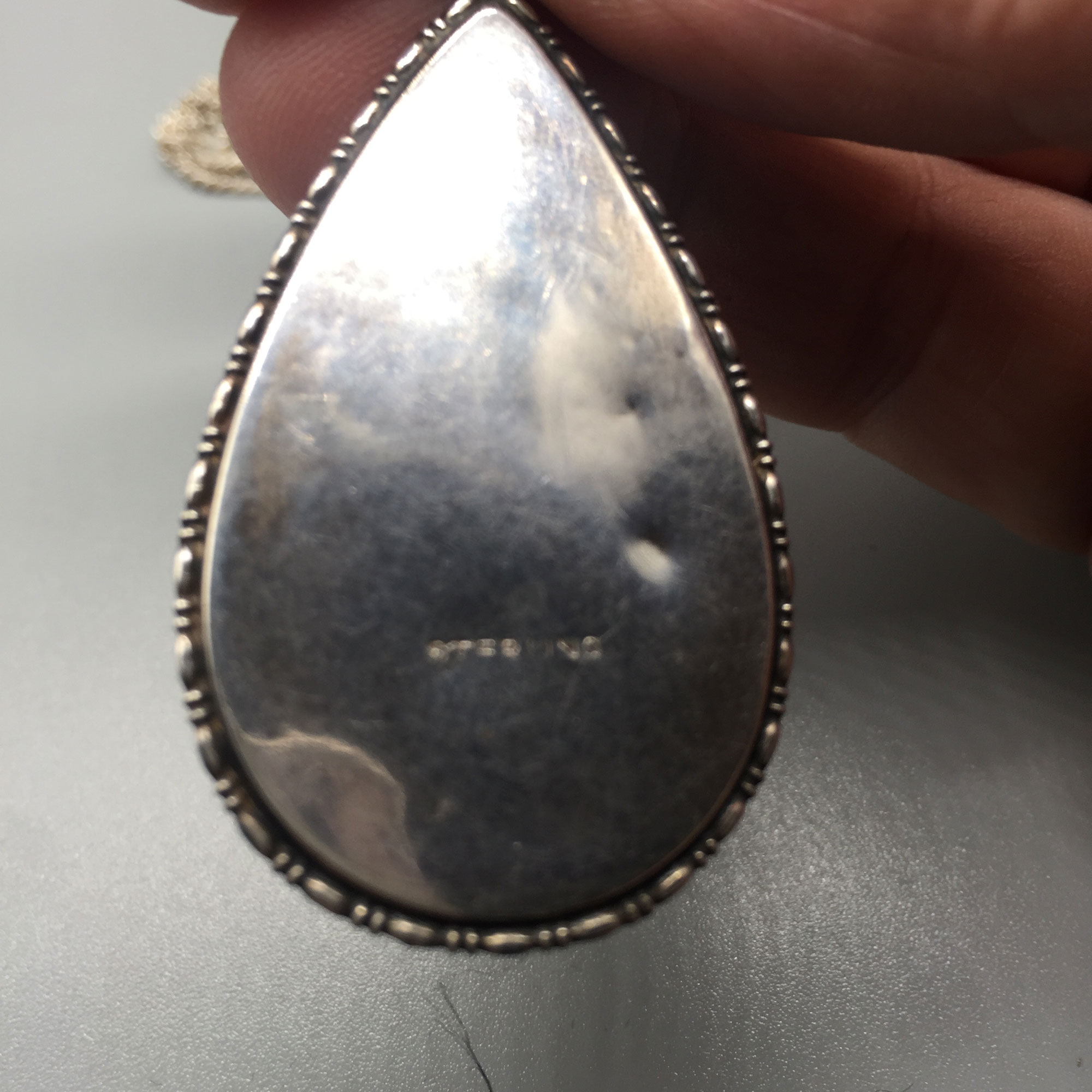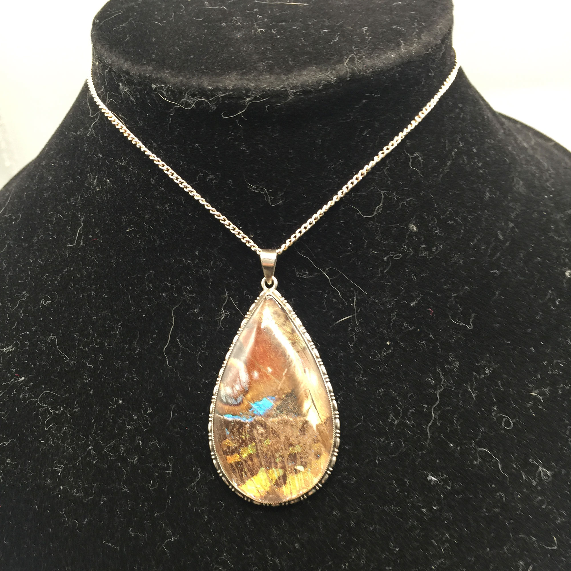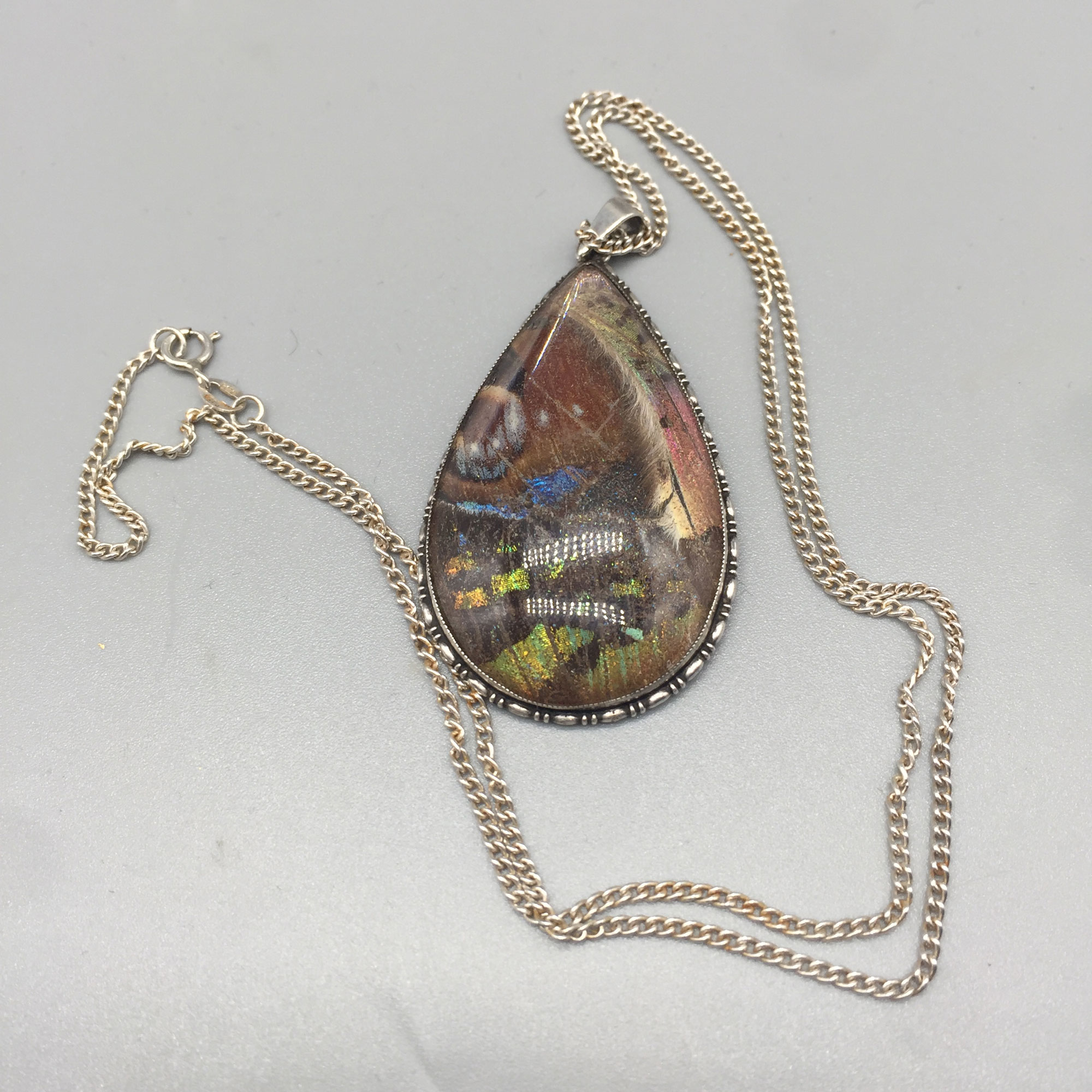 This is a striking large teardrop pendant with a butterfly wing covered in glass, silver| Size: | Pendant 4.5 x 4.5 cm, necklace is 46 cm |