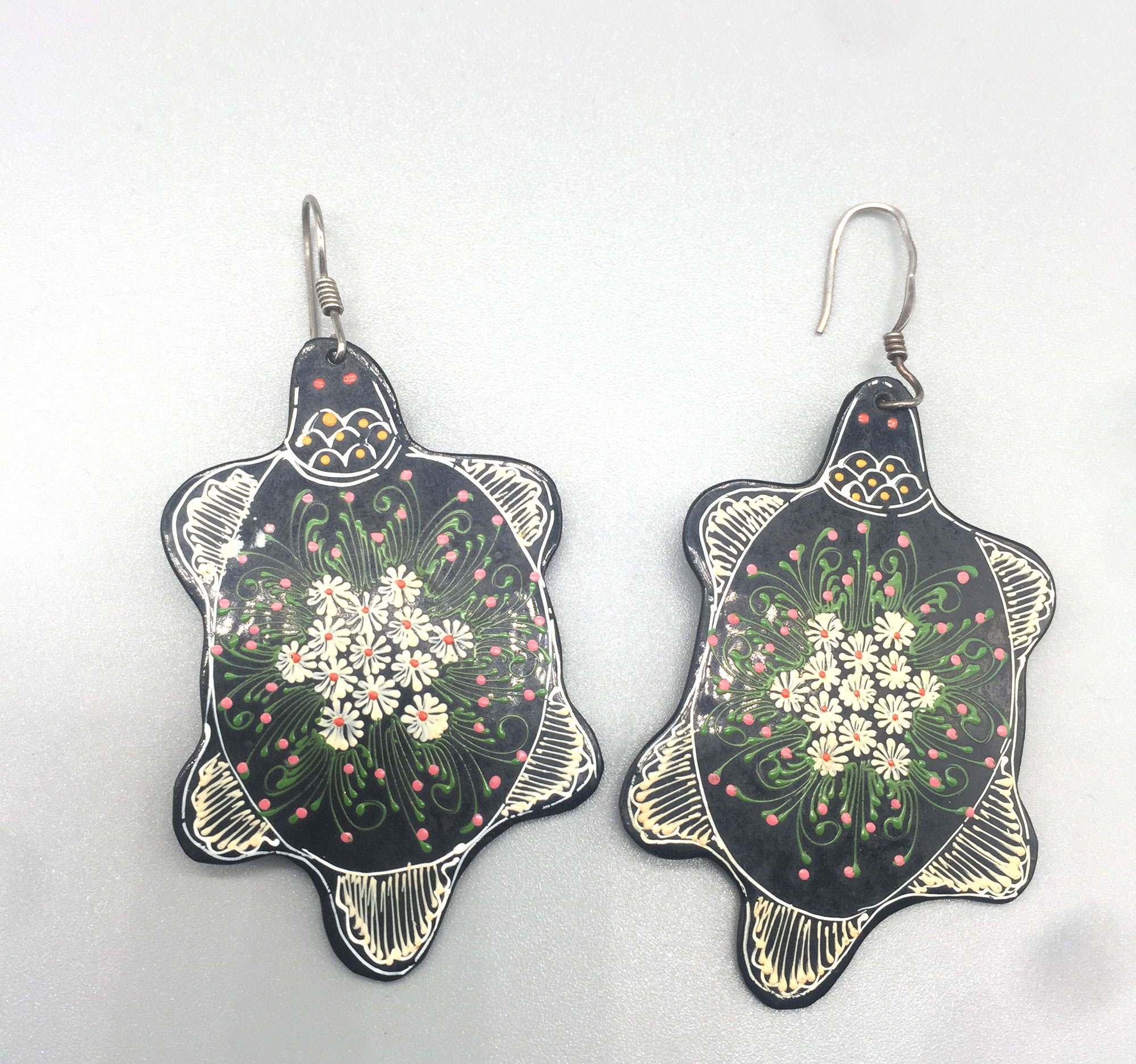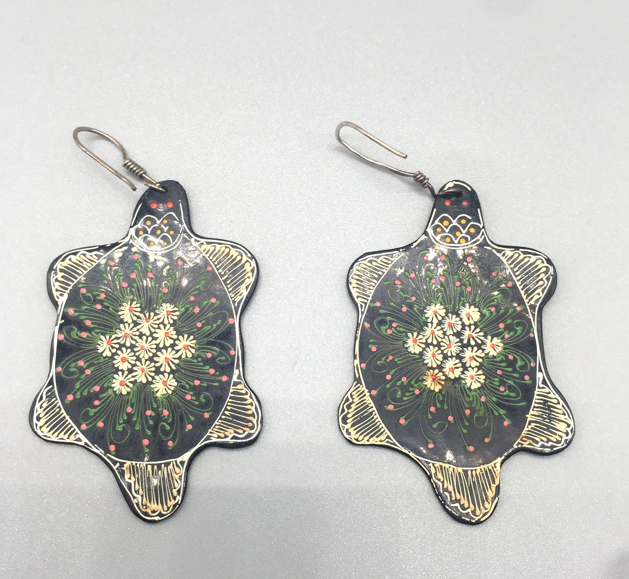 A very unusual pair of earrings made from papier mache, finely painted on both sides with floral motifs incorporating daisy blooms.| Size: | 5.5cm x 3 cm |