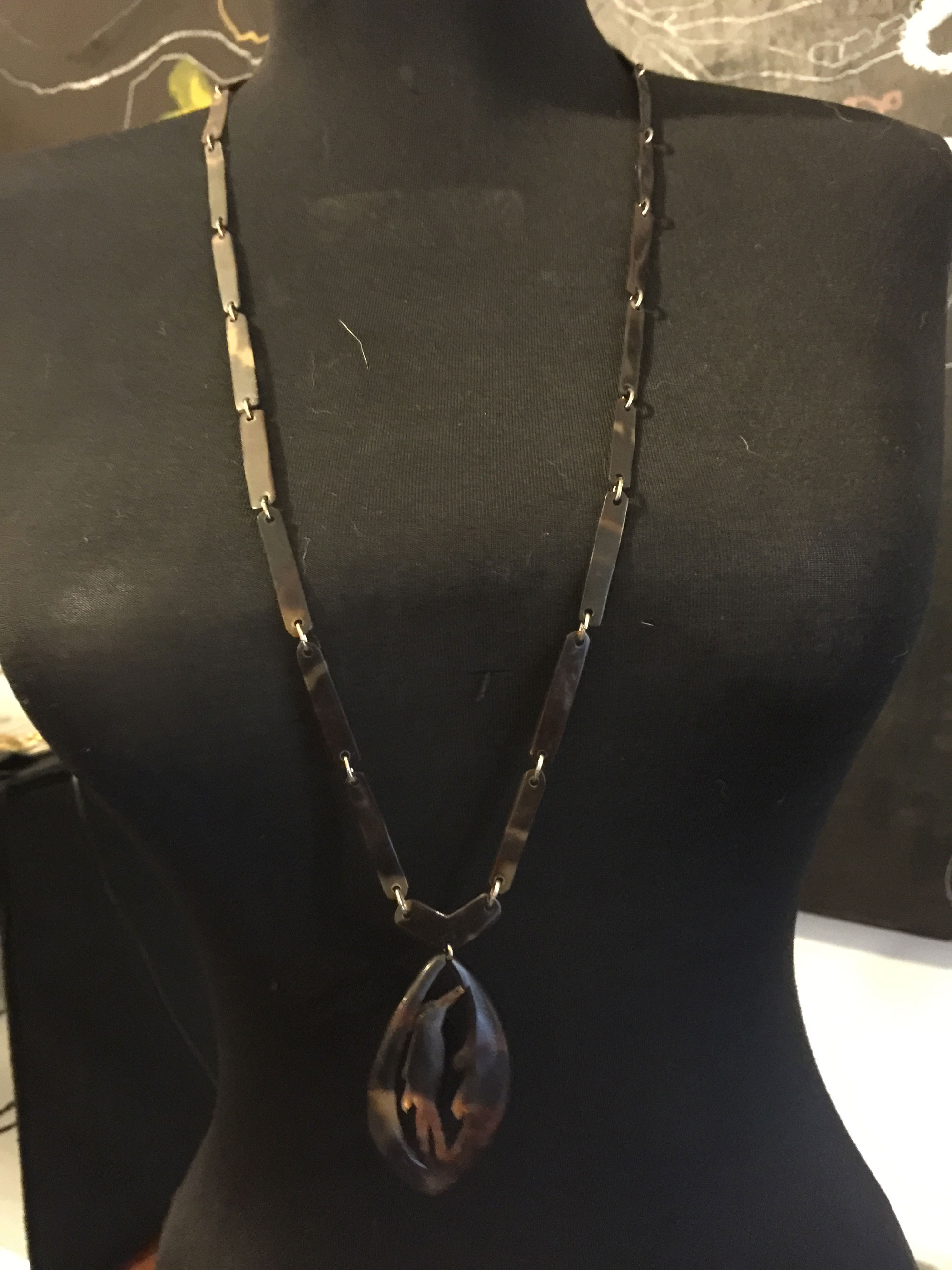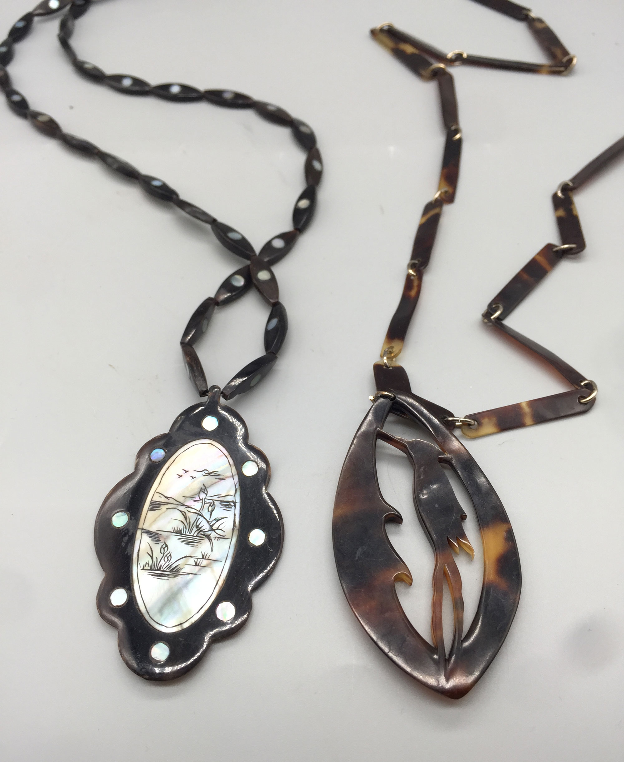 This is two necklaces that are made of mother of pearl and celluloid, one with inlaid pendant and links.| Size: | Mother of pearl 66 cm, Bird, 74 cm |