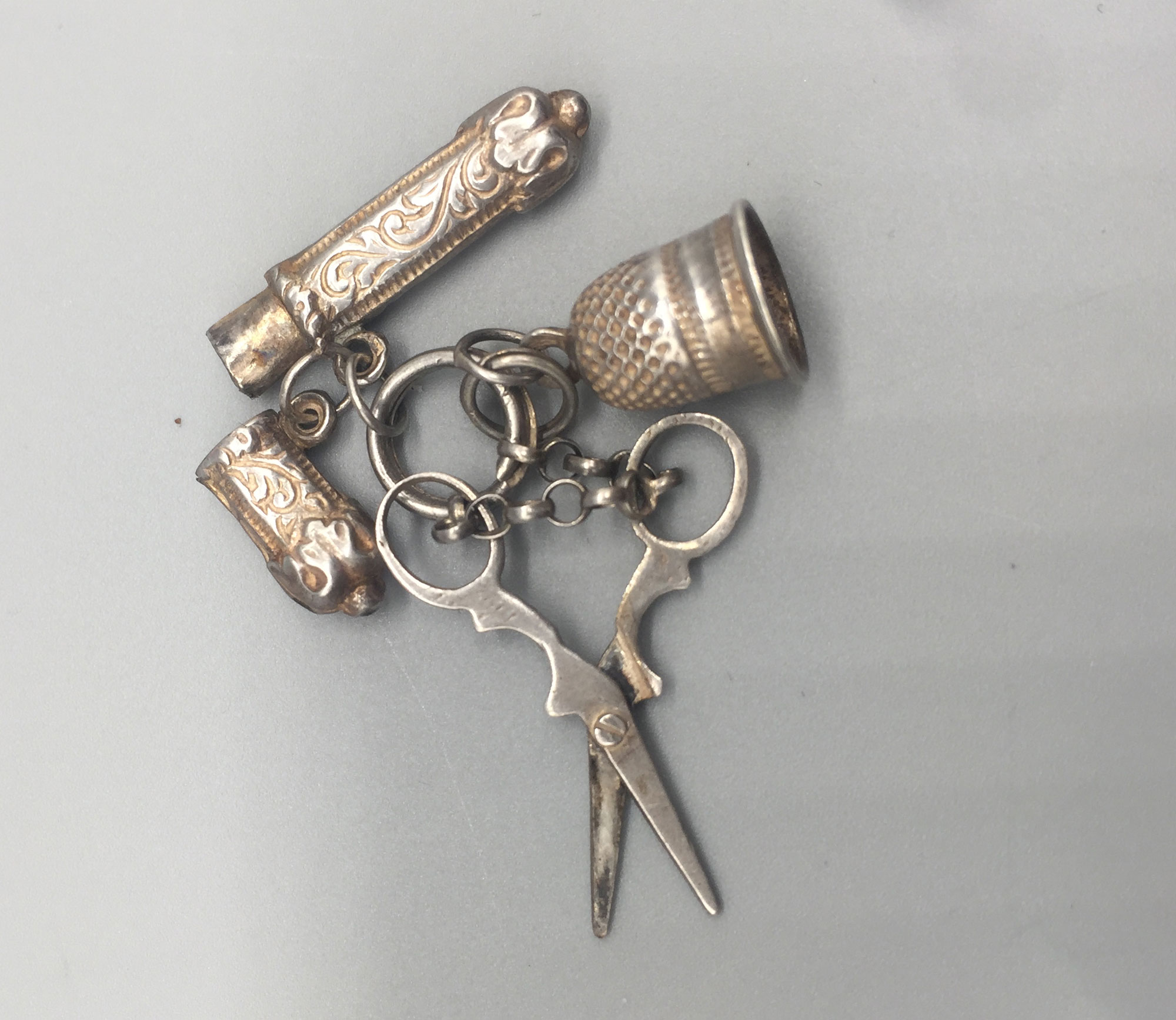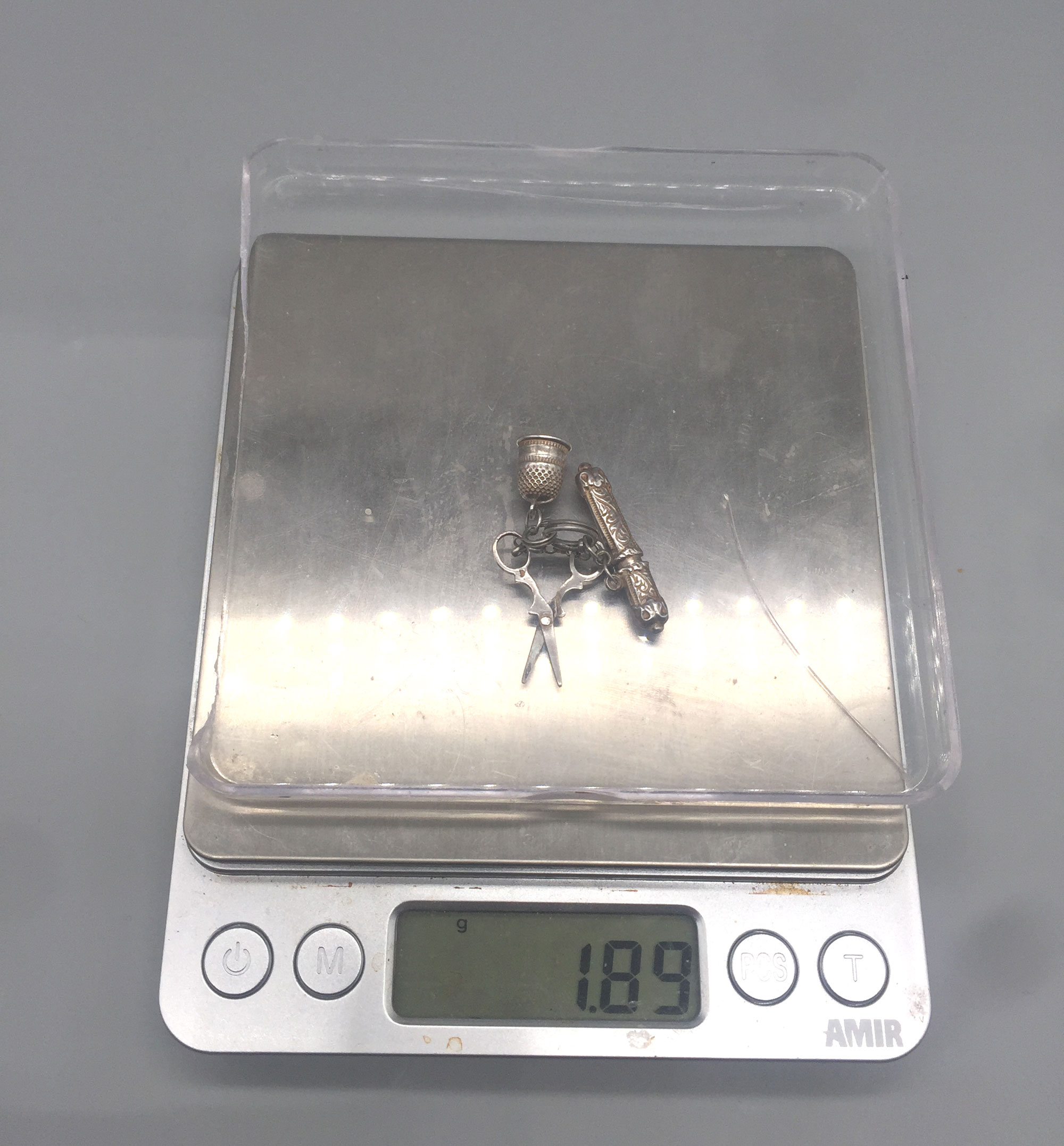 This is a very tiny charge with a thimble and working scissors and needle case| Size: | 2.25 cm scissors, 2.5 cm needle holder |