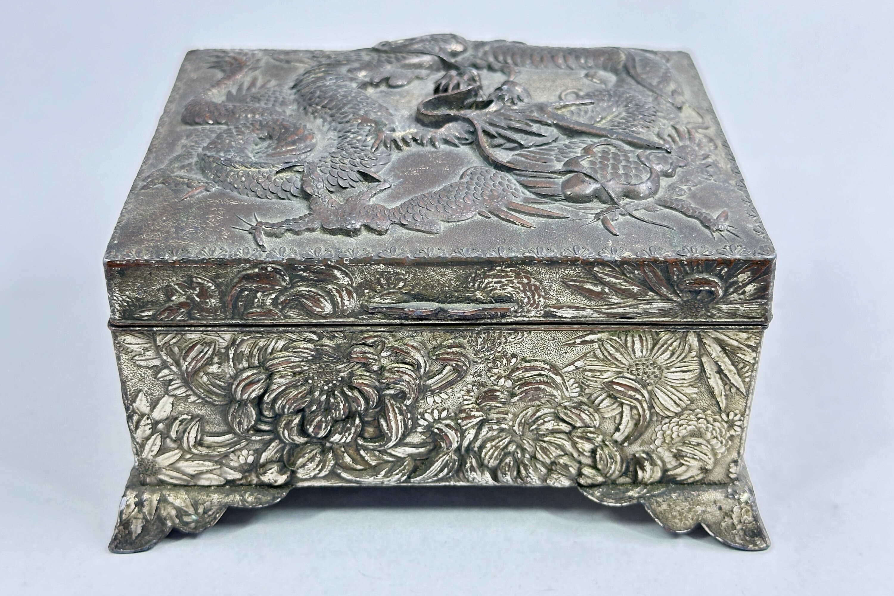 Oriental White Metal Box decorated Dragons and Chrysanthemum, C20th