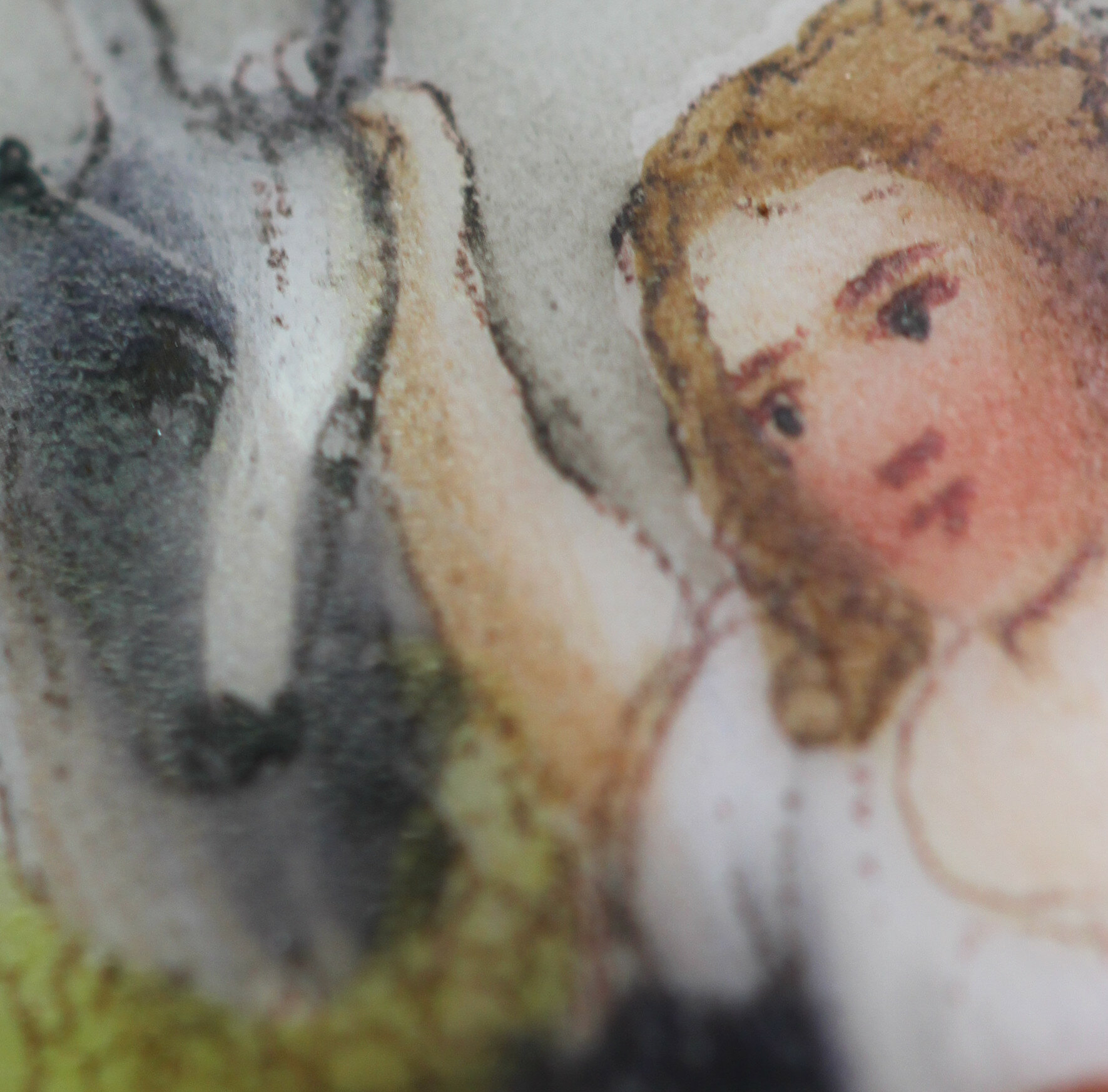 This is small oval plaque that is painted with a very detailed pastoral scene of a young boy with a goat. It would have been mounted in a pendant or locket at one time. There appears to be some sort of mark on the reverse.| Size: | 23 x 29 mm |