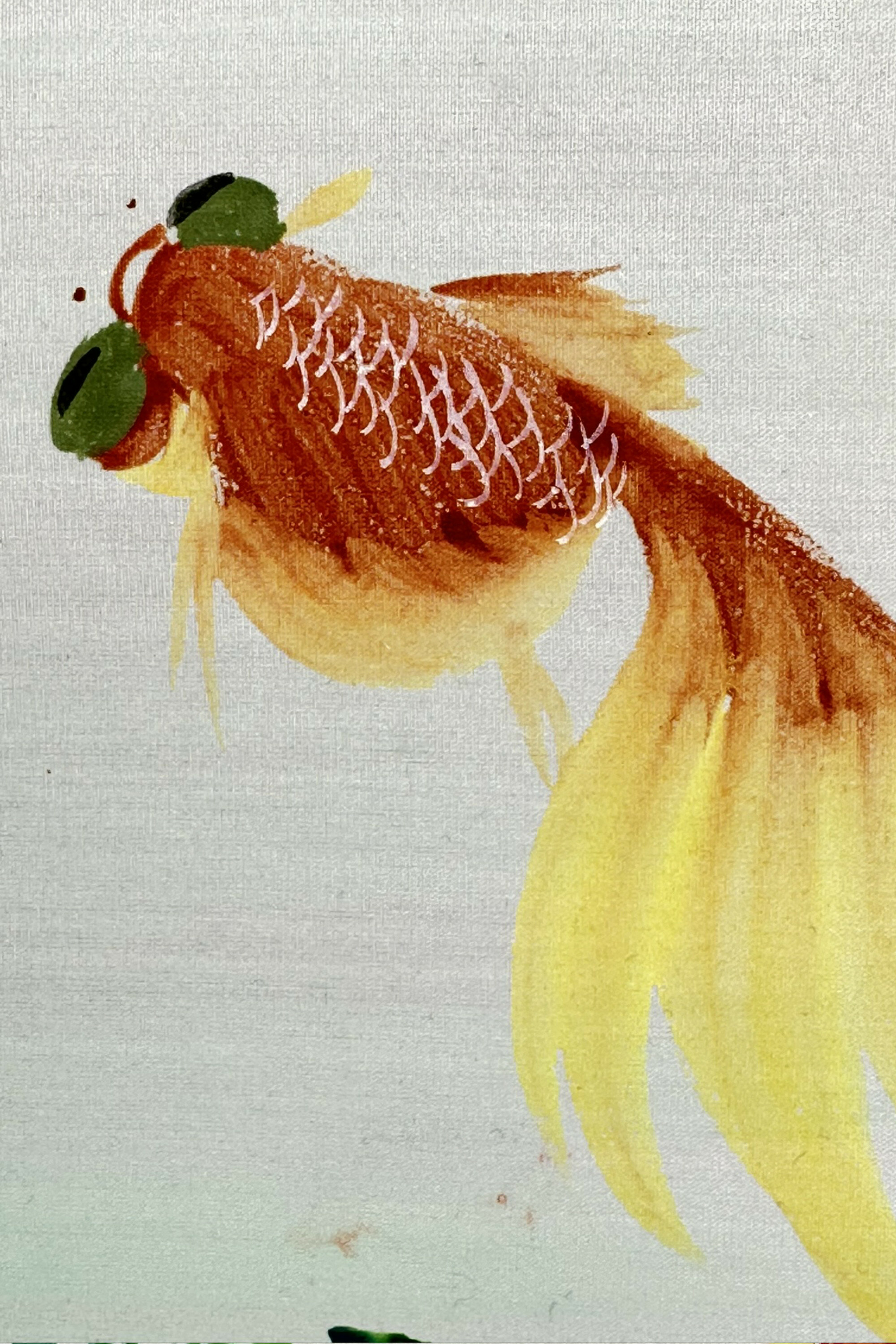 A Chinese fan of irregular hexagonal shape with a bamboo effect handle, the silk panel edged with stitching and delicately painted with two goldfish and reeds in a pond setting. This lot is another example of the fans made by the Chinese as handicrafts exports to the West in the mid twentieth century, two other examples of which can be seen in the previous lot. The representation of the fish here is particularly pleasing.| Size: | 19 cm (max) x 20 cm (fan); 31 cm (overall length) |