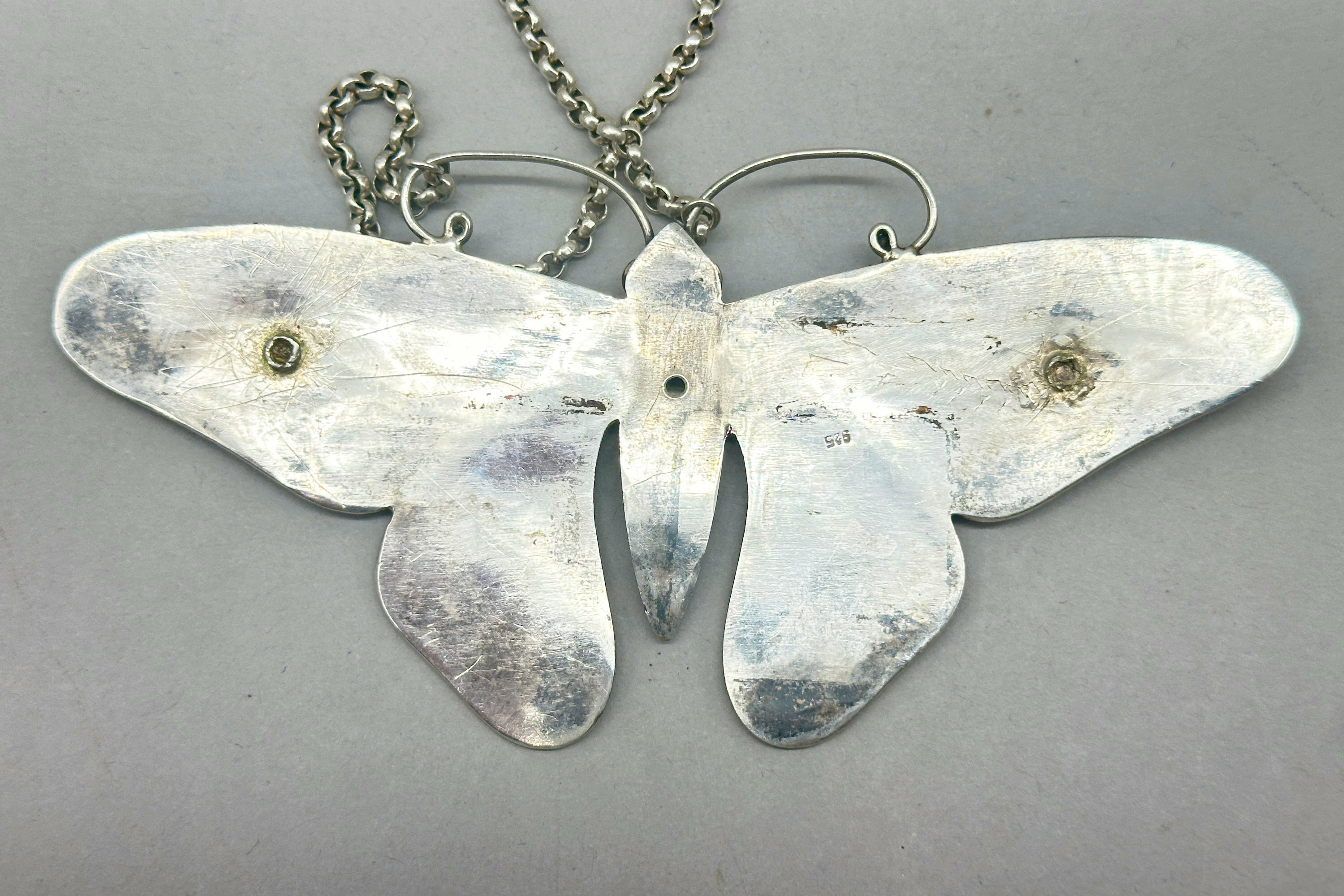 A Balinese Art Nouveau style silver plaque Pendant in the form of a butterfly, the wings with beaded and ‘micro dot' decoration and set with four abalone panels. The plaque dates to the late C20th, probably 1970s/1980s and has been fitted with a complementary modern English silver belcher chain.| Size: | Pendant 12cm x 5.5 cm, Length 44 cm |