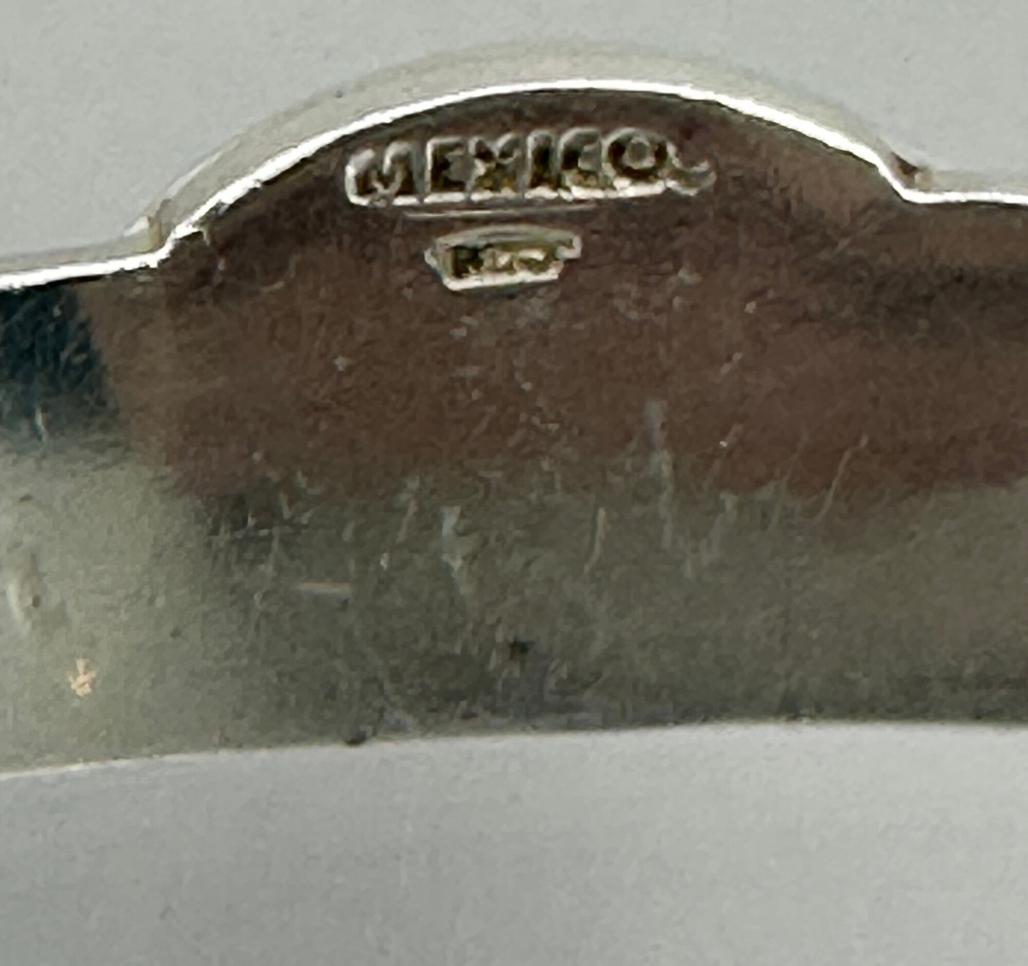 This bracelet has a fun depiction of a dolphin in the ocean with the sun and waves. It is marked Mexico 925.| Size: | Free size cuff style. 17 mm wide at widest point |
