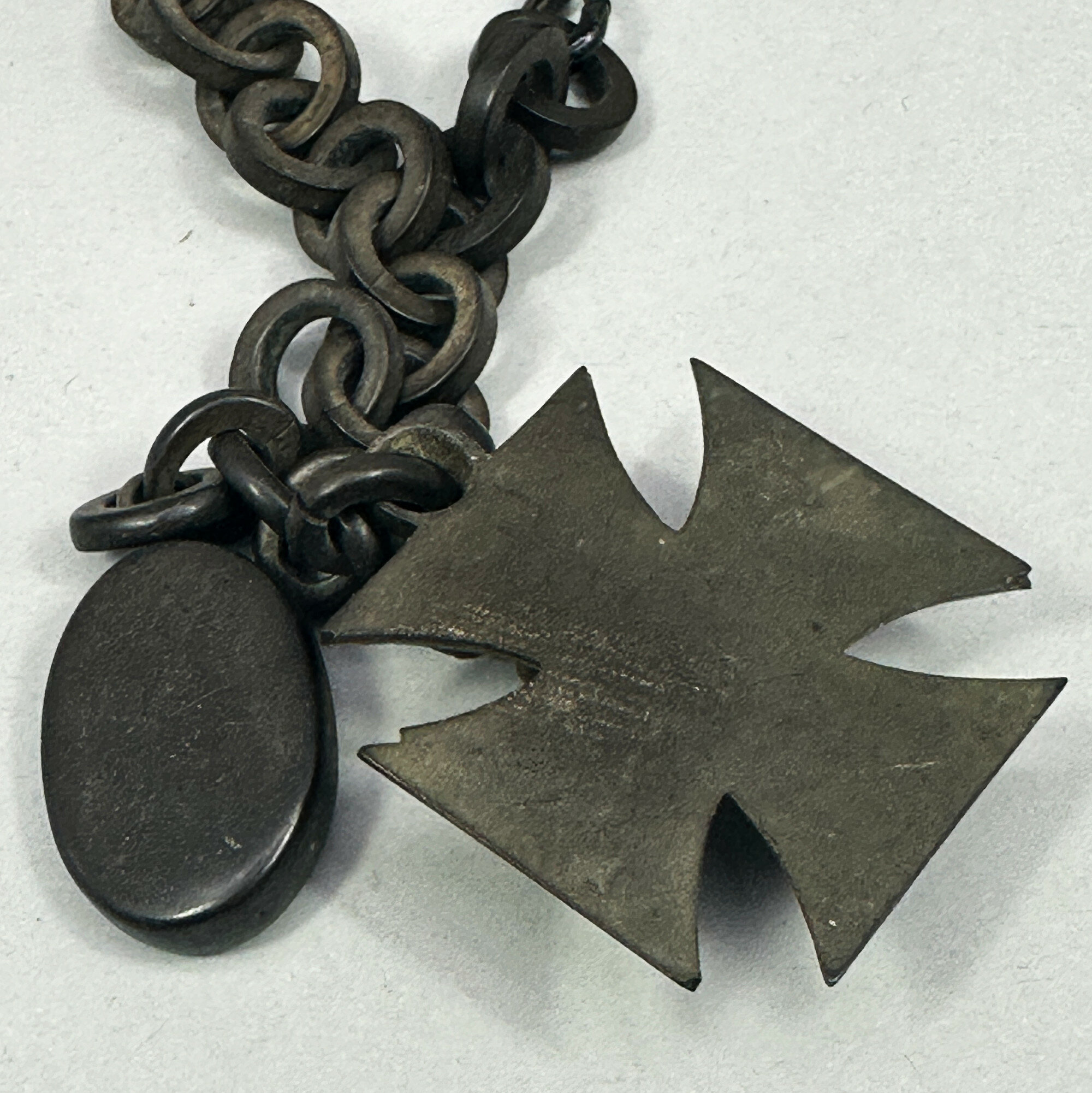 This is the holy grail of Vulcanite necklace due to the length and it also has two integrated Vulcanite pendants a Maltese cross and a fob that may have been intended to be engraved. The links are round and there are further links at the end giving it a lariat style. ABOUT VULCANITE Exciting scientific and technological advances punctuated the nineteenth century. Growth and development with regard to jewelry-making techniques and new and innovative jewelry materials were an important part of these creative endeavors. Combining imitation gems with various imitation jewelry materials had already been en vogue since the early Eighteenth century and viable replacements for faux non-metallic jewelry materials were chiefly derived from plastics and rubber. Uncured rubber is somewhat brittle and does not have the stamina to hold up over the long term necessary to be viable for jewelry use. It was not until Charles Goodyear patented the vulcanization process in America in 1844 and Thomas Hancock did the same in England, that jewelry production with a rubber composition was possible. Vulcanization is a high-heat process that adds sulfur to the mix and renders the result more durable than rubber or plastic alone. Both gentlemen exhibited their achievements at the Great Exhibition, displaying molds of items intended to substitute for the very popular, but exceedingly brittle jet. One of the main purveyors of vulcanite jewellery was the Britannia Rubber and Kamptulicon Company, set up in 1854 at Cannon Street in the City, with the works in the East End of London at Bow Common, “for the purpose of manufacturing in England articles invented by Mr. Goodyear.” From 1866, they placed advertisements in The Times for ” Indiarubber chaines Benoiton, wholesale and export only,” offering a full range of industrial, household and ornamental goods including “Imitation Jet (India Rubber): Albert chains, Victoria chains, long chains, Latin, Greek, Maltese and Dagmar crosses, brooches, bracelets, earrings, waist-clasps, charms and trinkets, gauntlets and armlets, fancy black combs, and dressing combs,” assuring their customers that these items had the “the beauty of polish and deepness of colour of jet, without its dangerous quality of brittleness…You may dash a bracelet or chain of this material to the ground without injuring it.” Sources: Lang Antiques (www.langantiques.com) Gere, Charlotte and Rudoe, Judy. Jewellery in the Age of Queen Victoria: A Mirror to the World: London, The British Museum Press, 2010.| Size: | Necklace 76 cm long, Links are 13mm, Drop is 10 cm, Cross is 3.6 x 3.6 cm |