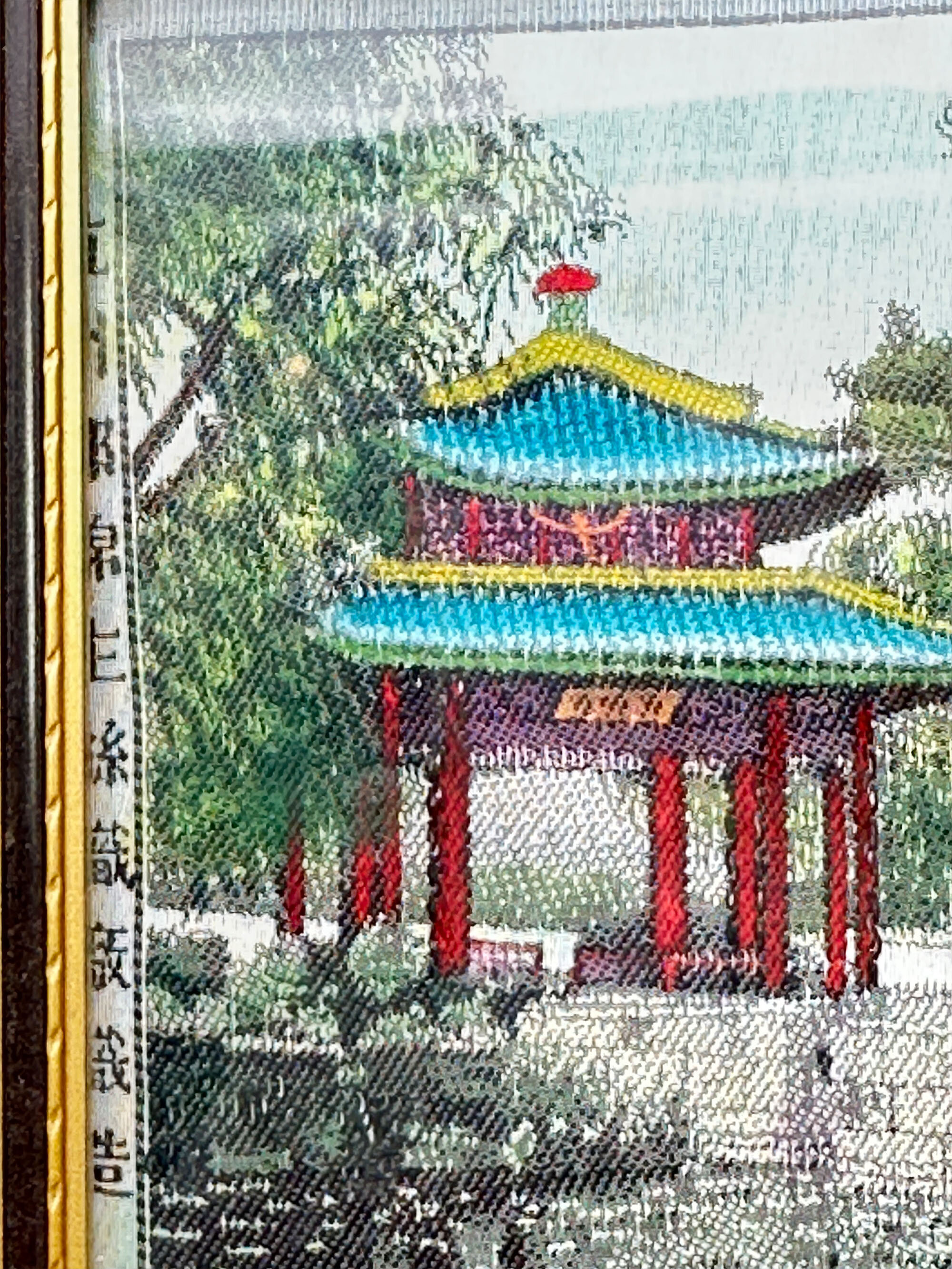 This is a Chinese silk textile picture depicting the Zhichun Pavilion within the Summer Palace, Beijing. Built by the Chinese Empress Cixi as a sanctuary for quiet retreat, the Summer Palace is a vast ensemble of lakes, gardens and palaces. The Zhichun Pavilion is situated on the small island in front of the Hall of Jade Ripples, beside Kunming Lake’s east bank. It backs onto a hill and to the south it faces the sun allowing a view of spring’s arrival, it’s name translating as ‘knowing Spring’. Image (7) shows a contemporary view and this silk textile was, no doubt, made as a tourist souvenir, perhaps in the 1960s.| Size: | 16.3cm x 12cm x 1.3cm |