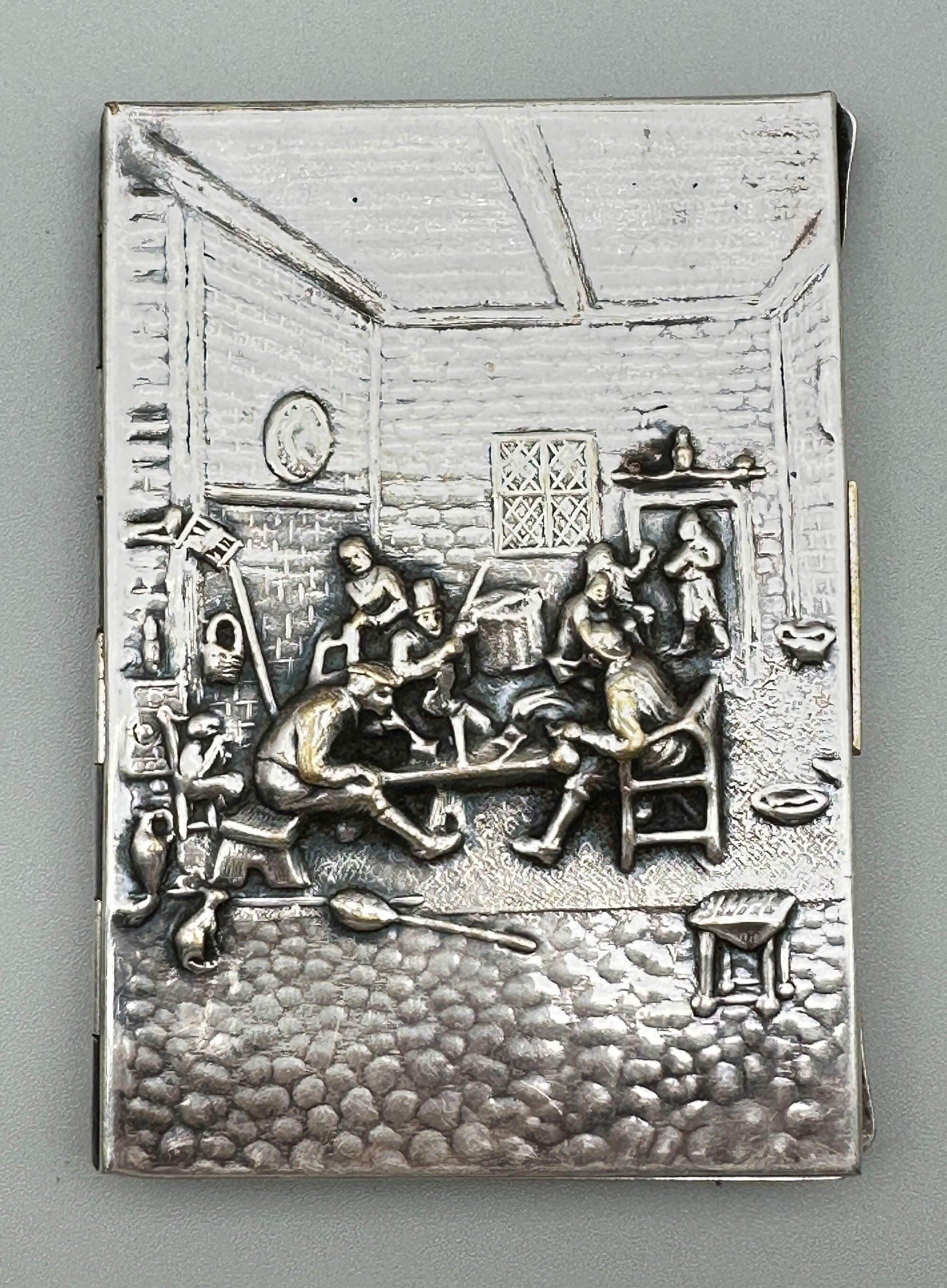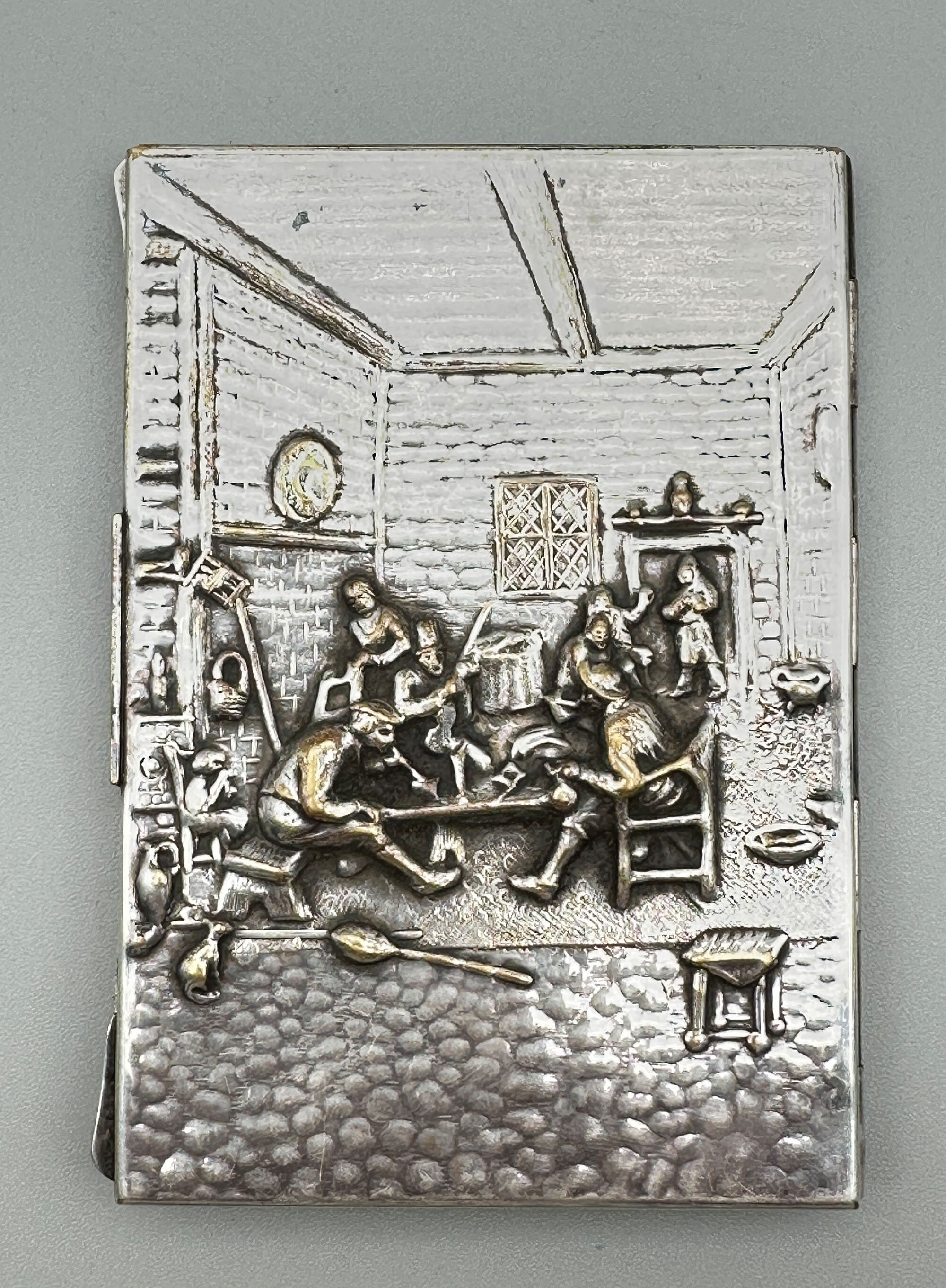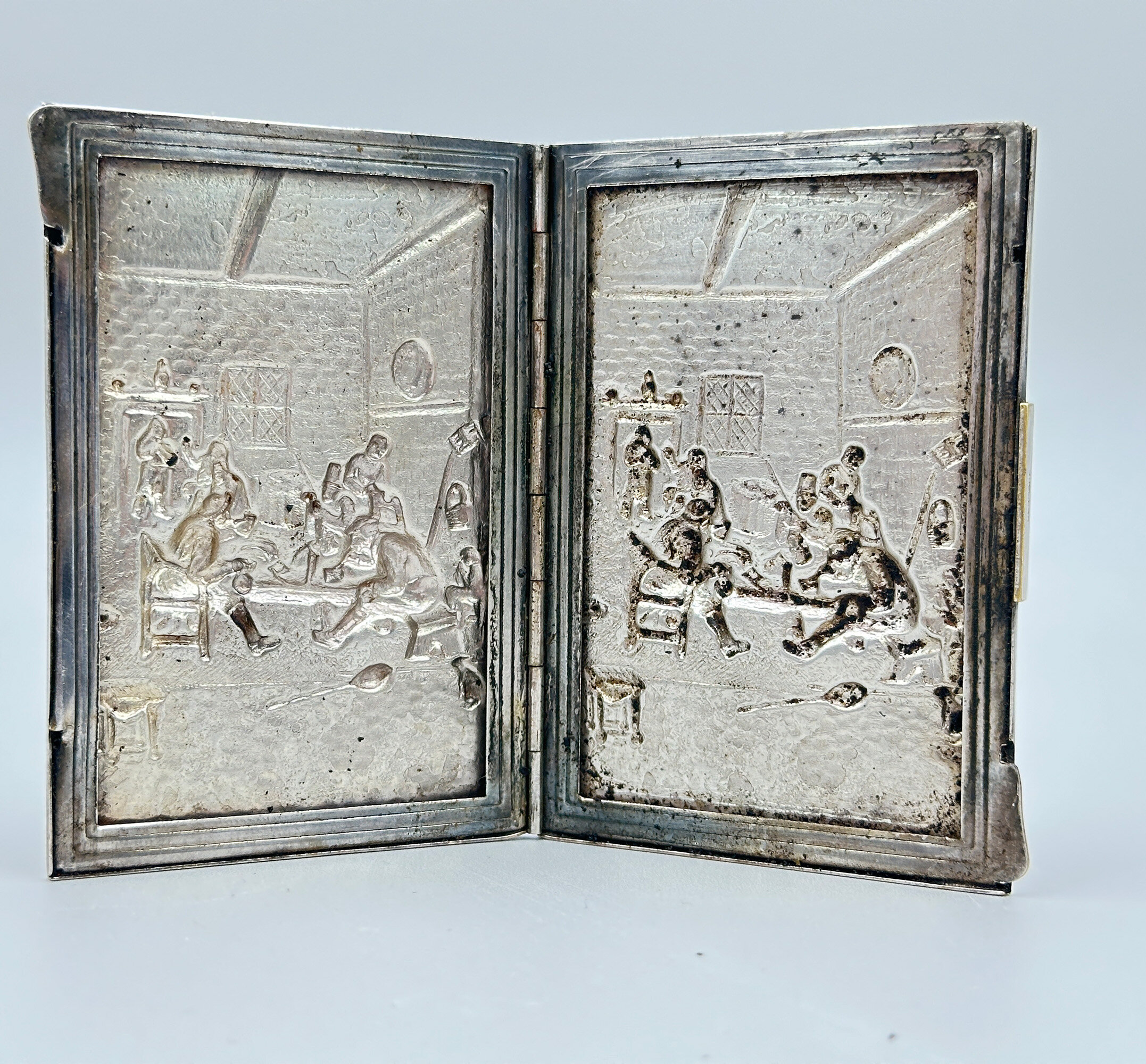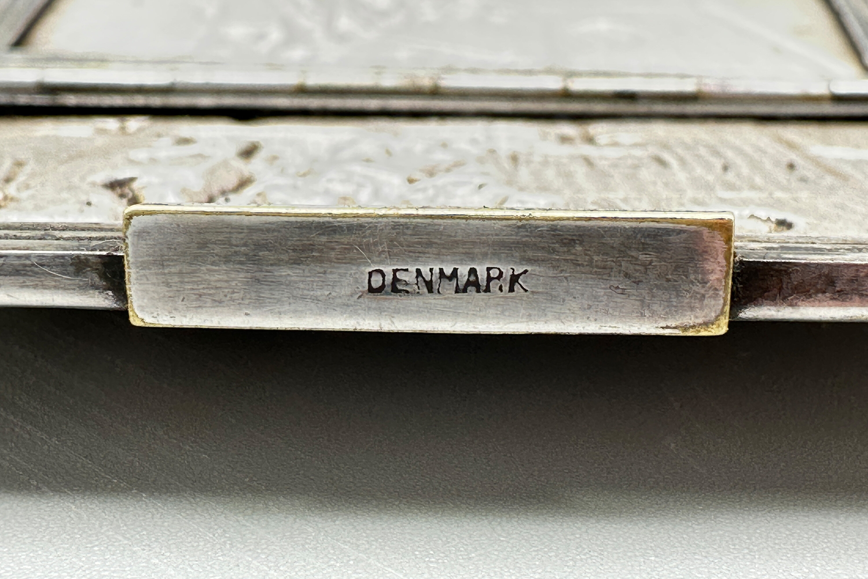 This is a folding silver plate photograph holder each side with a similar repoussé work scene of a traditional rustic interior with metal workers busy plying their trade. Repoussé work is a metalworking technique in which a malleable metal is shaped by hammering from the reverse side to create a design in low relief. Very similar pieces carry a mark for Denmark, as here, (see image 4) but also the initials JThS, or a slight variant on this, which seem to stand for Jorgen Th Steffenson of Randers who is known to have worked in the late 1970s. While not necessarily by him, a similar dating is most likely here.| Size: | Width (closed) 6.2cm, Length 9cm, Depth 0.3cm |