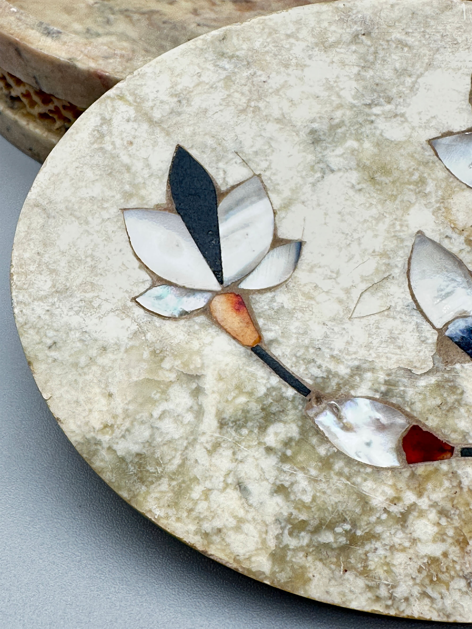 An oval soapstone box and cover, the sides of the box with reticulated or openwork lattice decoration and the flush fitting lid with ‘pietra dura’ inlay flowers. The technique of ‘pietra dura’ (literally ‘hard stone’) inlay in which polished and precisely cut, coloured and semi-precious stones were used to create intricate designs in stone (usually marble) was developed in Florence in the 16th century and then used around a hundred years later in the decoration of the Taj Mahal in India. The technique continued to be employed and is found even in pieces made in fairly modern times. These soapstone boxes were made in India and some retain their label stating this. Dating is probably to the mid twentieth century and these attractive pieces would be well suited for storing trinket items today.| Size: | Ht (max) 3cm, Ht (base) 2.5cm, Width 10cm, Depth 7.5cm |