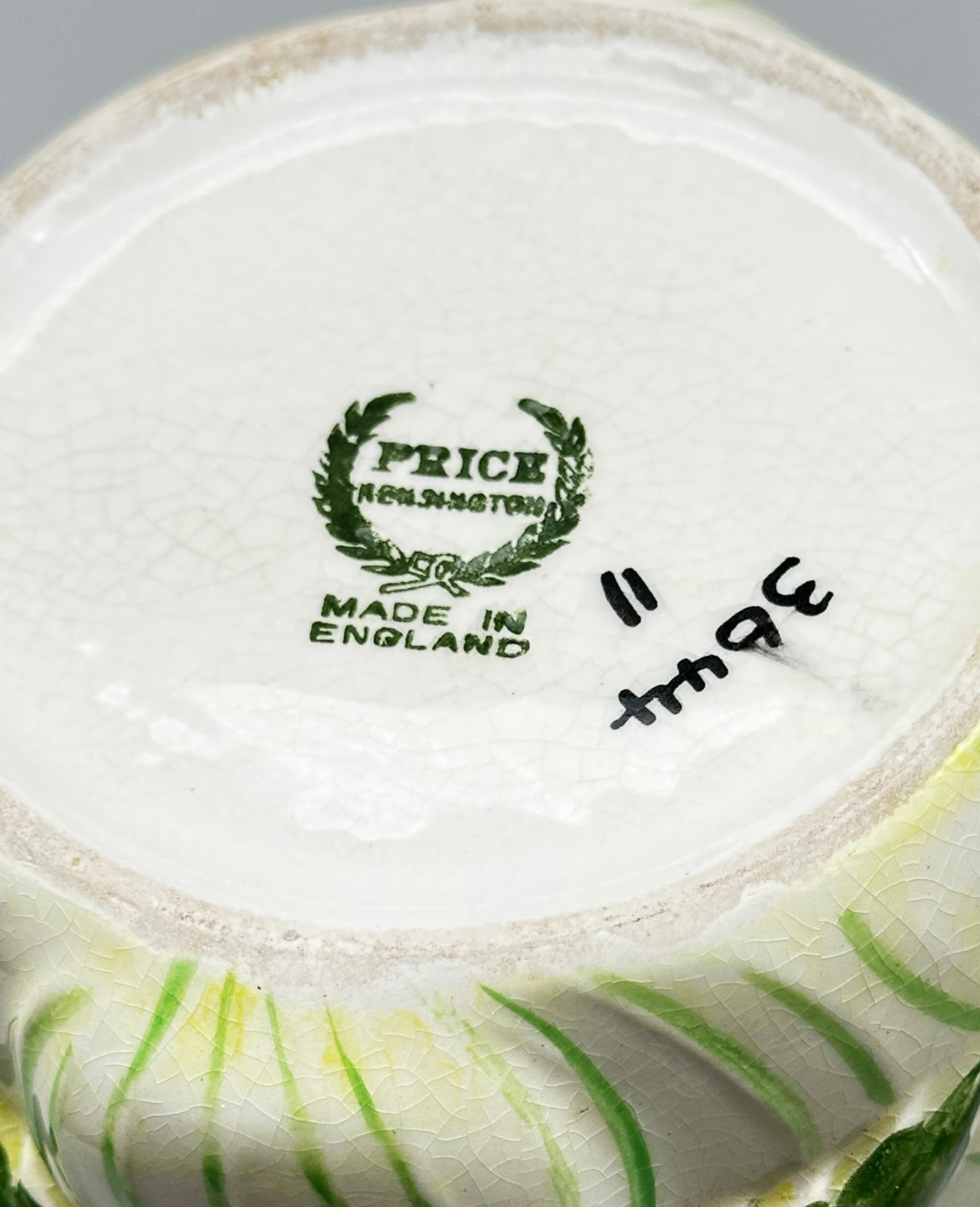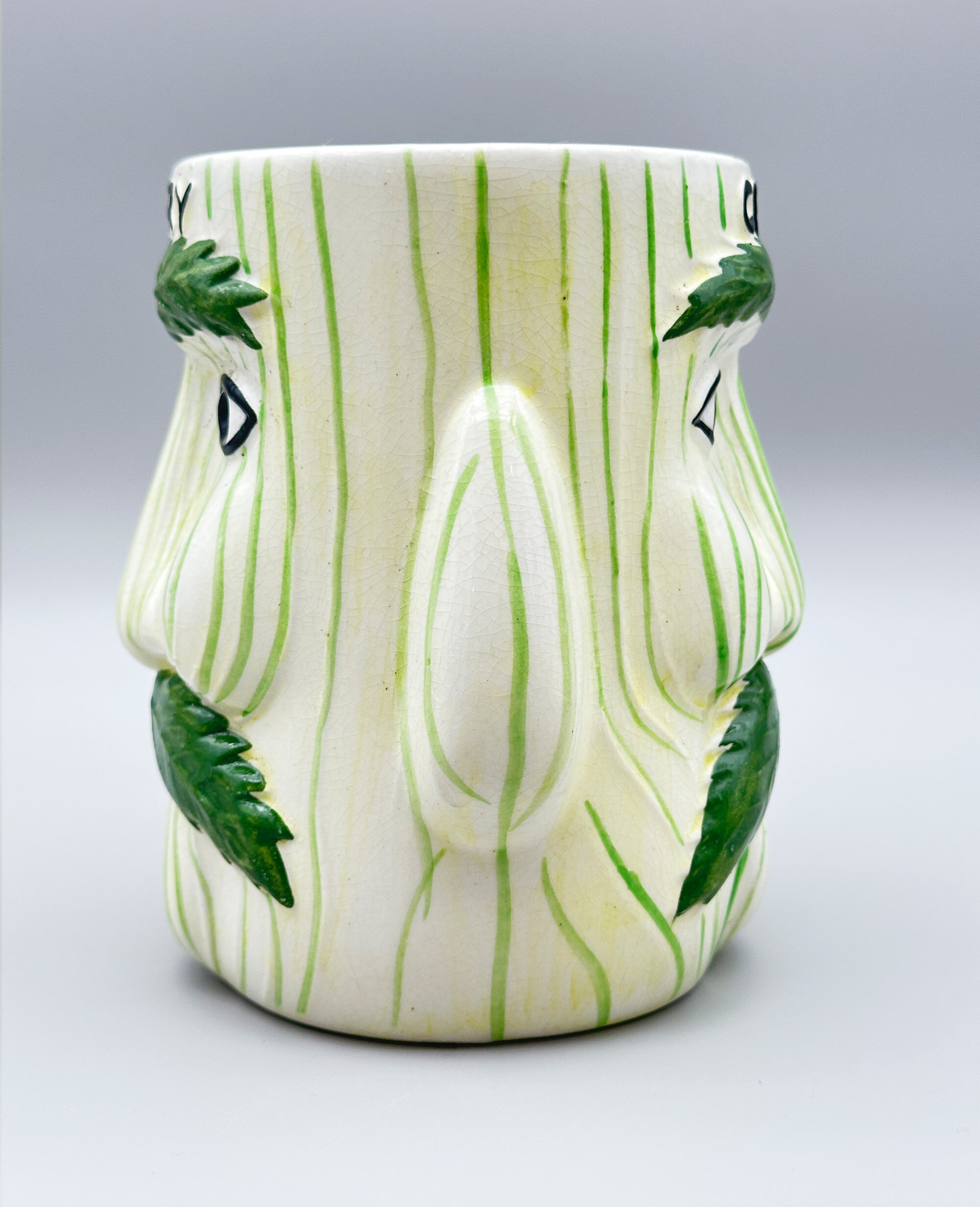 A novelty ceramic vase with two mask heads, the eyebrows and moustache formed as leaves, with the wording ‘CELERY’ above, the base with transfer marks ‘PRICE KENSINGTON’ within a wreath above ‘MADE IN ENGLAND’ and the pattern number ‘3644’ written at the side.Price & Kensington was the trademark for Price & Kensington Potteries Ltd which was formed in 1962 by the amalgamation of Price Bros. (Burslem) Ltd and Kensington Pottery Ltd which were both subsidiaries of Arthur Wood & Son (Longport) Ltd. From 1962 to 2003 Price & Kensington produced large quantities of domestic wares alongside novelties and souvenirs, but in 2003 their parent company went into administration and their brand name was eventually sold to Rayware Limited which continued to use it, eventually moving the manufacture abroad, mainly to China.