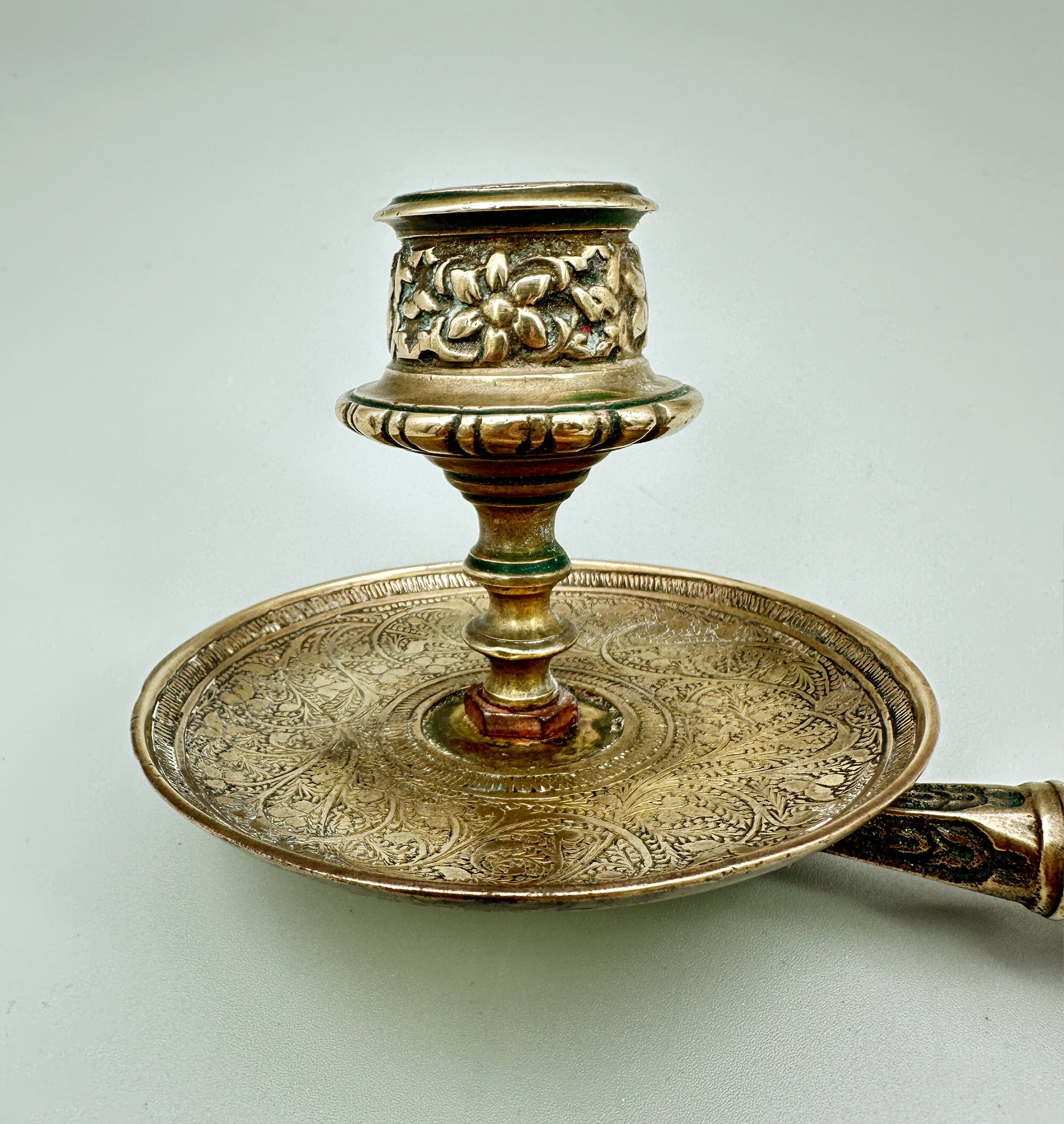 A pair of brass piano sconces, the elaborately cast arms attached to a circular hinged mounting fitment and supporting the candle holders and drip pans. Candle sconces were regularly fitted to upright pianos in the nineteenth and early twentieth century to assist the pianist and perhaps a singer accompanying him in reading the music at a time when rooms in general were not so brightly lit. With the advent of electric lighting, they gradually fell out of use and many pianos can be found now with the sets of holes into which they were once screwed. Most are European, but the work here is clearly Indian, in particular the engraved stylised floral design on the surface of the pans and the cast floral decoration on the candle holders. Doubtless they were made for European colonial settlers and this suggests an early twentieth century dating. Most piano sconces are swivelled, as here, and it is possible that some examples were, in fact, intended as gimble candlesticks to be used on a boat or a train.| Size: | Length (max) 20cm, Drip pan 9.5cm diam, Ht (candleholder) 7.5cm, Bracket 5cm diam |