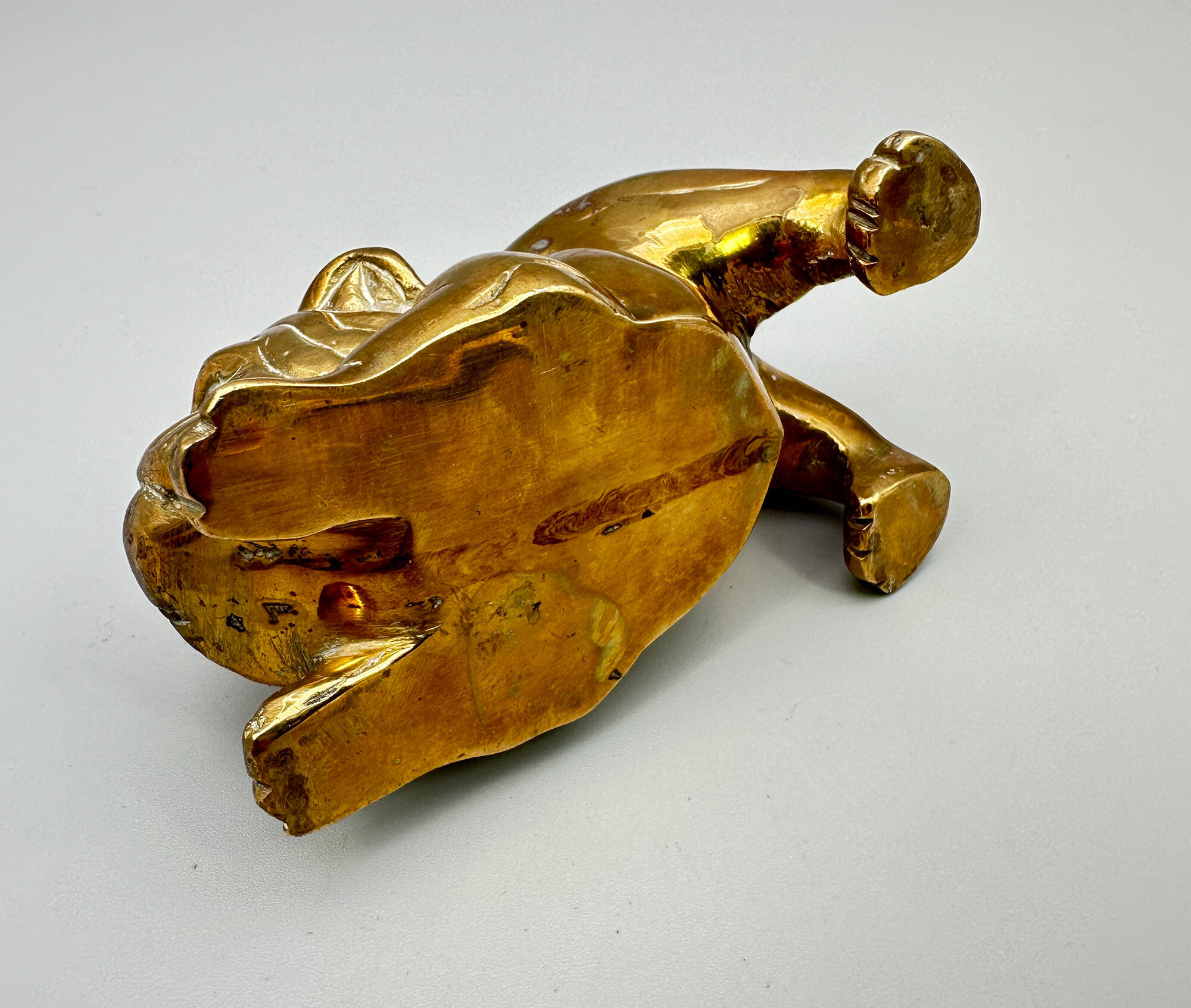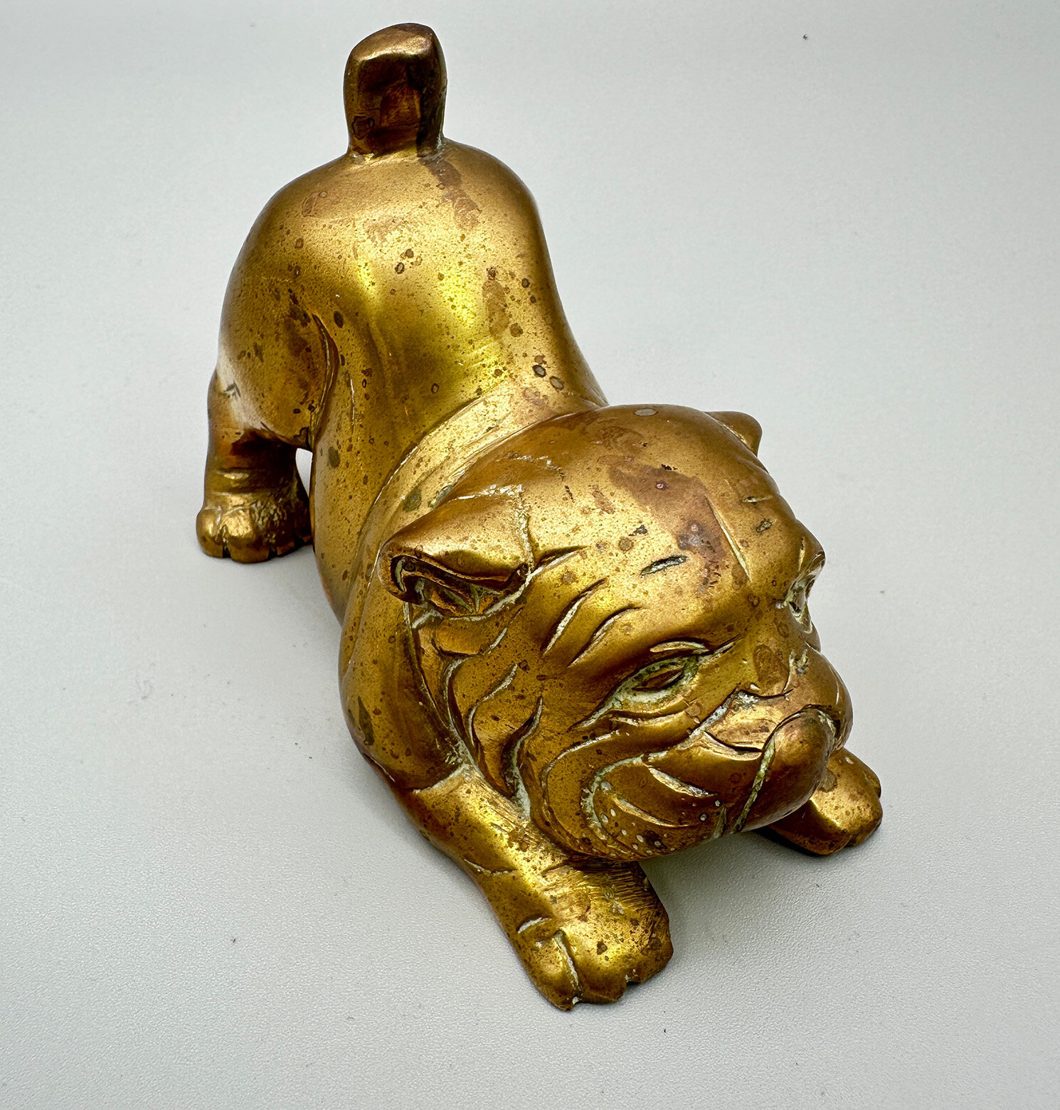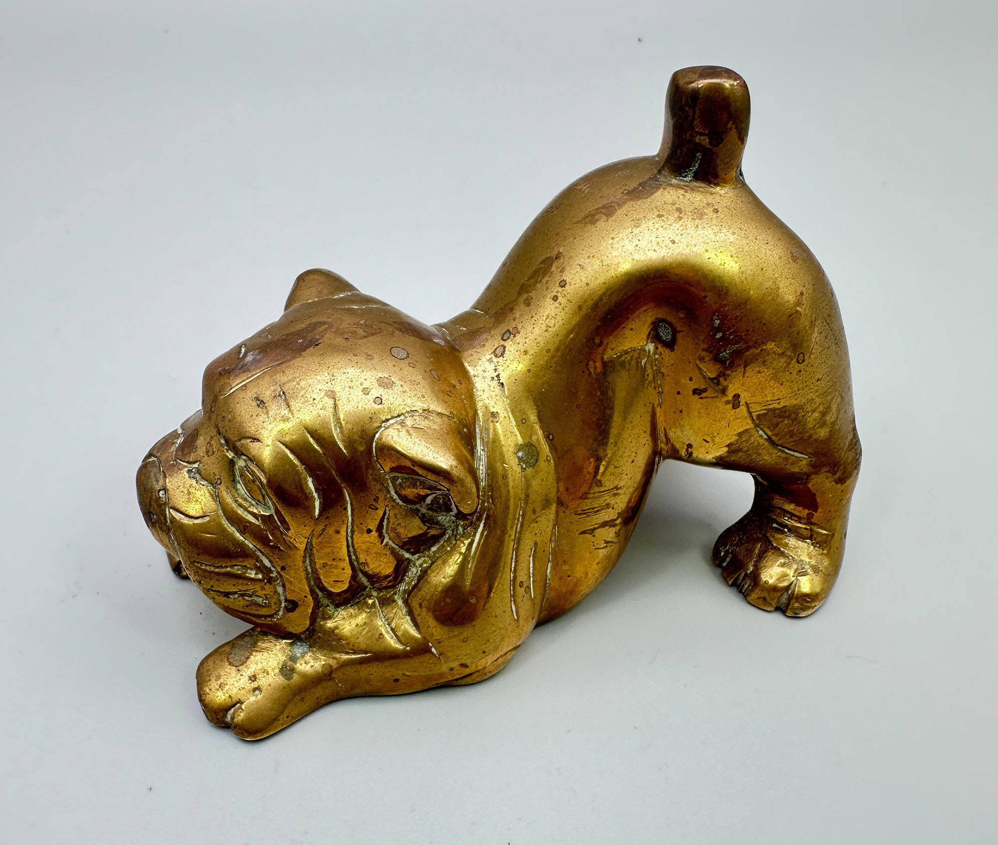 Two brass figures of bulldogs, one sitting erect and one crouching, each solid cast and expressively modelled. These small brass bulldogs are usually regarded as paperweights and appear to have been popular around the time of the second world war as an example of British stubbornness and tenacity. Some see reminiscences here of ‘John Bull’ and others the great ‘bulldog’ himself, Winston Churchill. Most likely, then, these two ‘mastiffs’ date to the 1940s and can carry out their function today just as well as they did all those years ago.| Size: | (i) Resting on front paws) Length (max) 10cm, Width (max) 6cm, Ht (max) 7.5cm (ii) Crouching) Length (max) 8cm, Width (max) 5.5cm, Ht (max) 7.2cm |