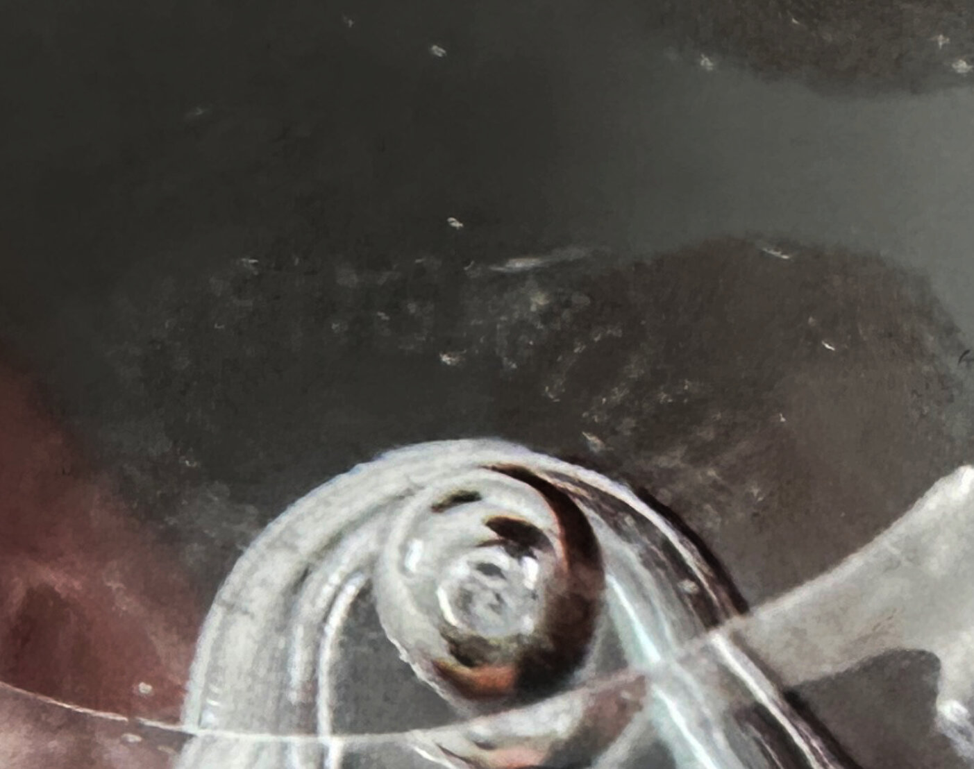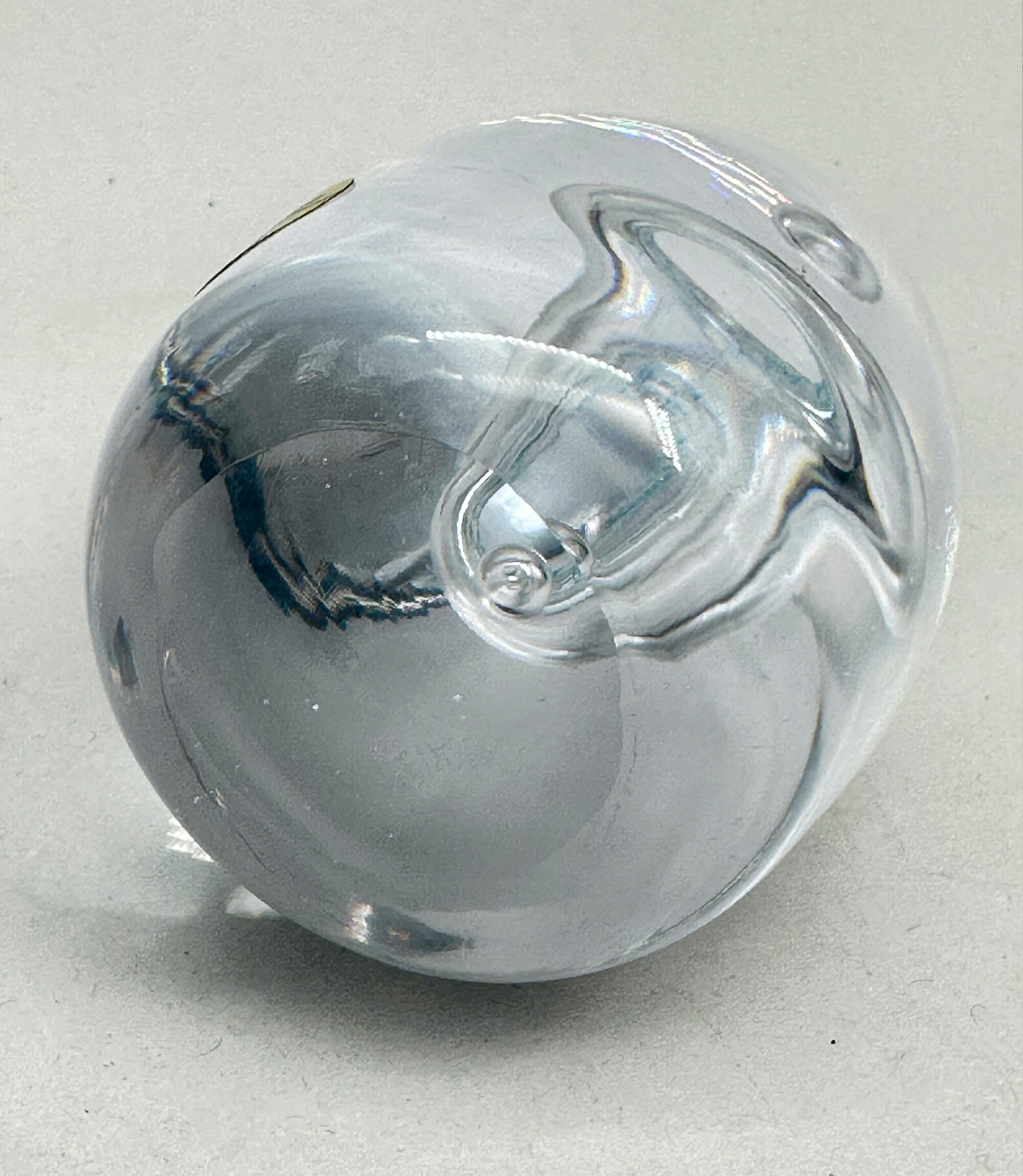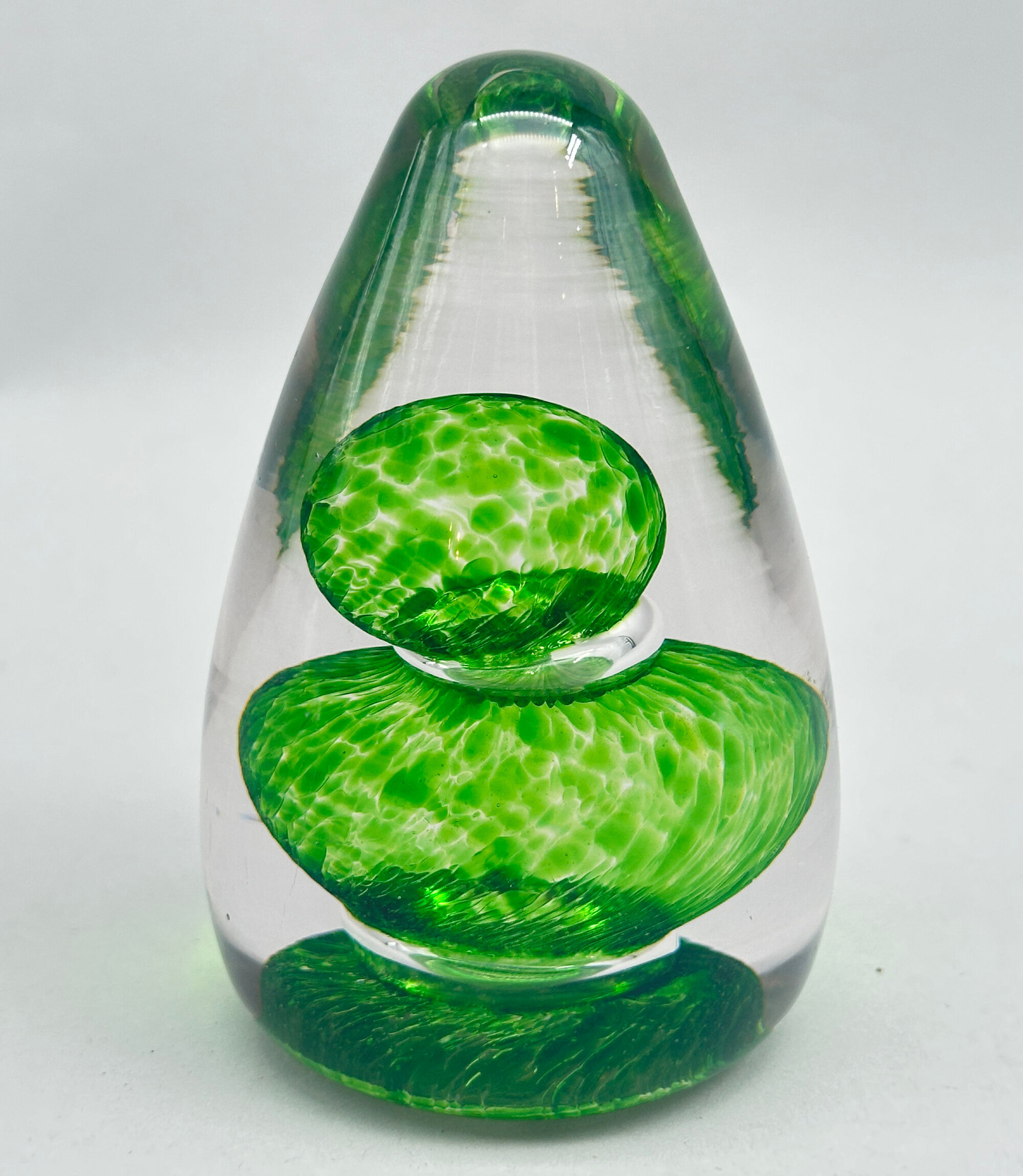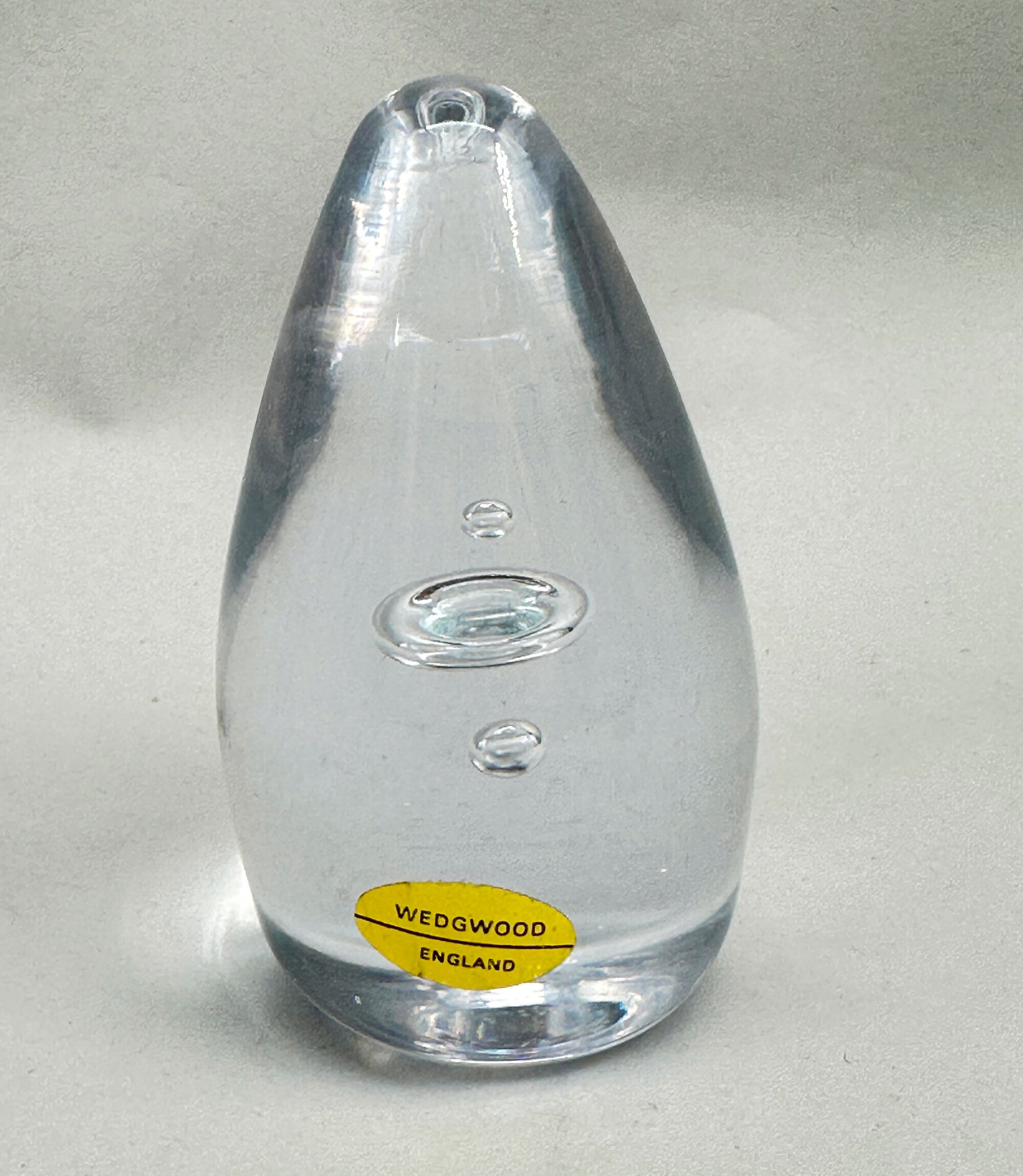 These are two Wedgwood Glass paperweights both of rounded conical form, one clear glass with small bubbles and one clear glass with speckled green large bubbles, a design understandably known as ‘topiary’. Both have acid etched marks to the base which can be read ‘Wedgwood’ ‘England’ although the mark on the first is off centre and indistinct (see image 5); this is compensated for by the attached paper label which also reads ‘Wedgwood’ ‘England’. Both were designed by Ronald Stennett-Wilson, one of the most prominent UK glass designers, who set up the firm King’s Lynn Glass in 1967. Before that he had worked for Swedish glass manufacturers and the influence of their styles can be seen in his own work. The clear glass example could be felt to recall Kosta Boda. King’s Lynn Glass was taken over by Wedgwood in 1969 and their name marked on its production thereafter, although there was apparently a slight delay in the delivery of the machine which was used to apply the marks, meaning that the very first ‘Wedgwood’ pieces are hard to identify. Stenett-Wilson remained as Managing Director and chief designer for Wedgwood’s newly acquired firm until his retirement in 1980. Many of the staff at King’s Lynn Glass when it started had worked in Sweden or Europe and they began to train local workers who followed, no doubt, the styles and techniques of their teachers. After Stennett-Wilson’s retirement, the firm was subject to various acquisitions and mergers, finally being sold to Caithness Glass in 1988 with the factory closing in 1992. These two pieces, then, are an excellent example of the Swedish inspired designs made by Wedgwood Glass in its early years. Both decorative and practical they can appeal to a specialist or non specialist alike.| Size: | Green 9.5 cm, clear 10.5 cm high |