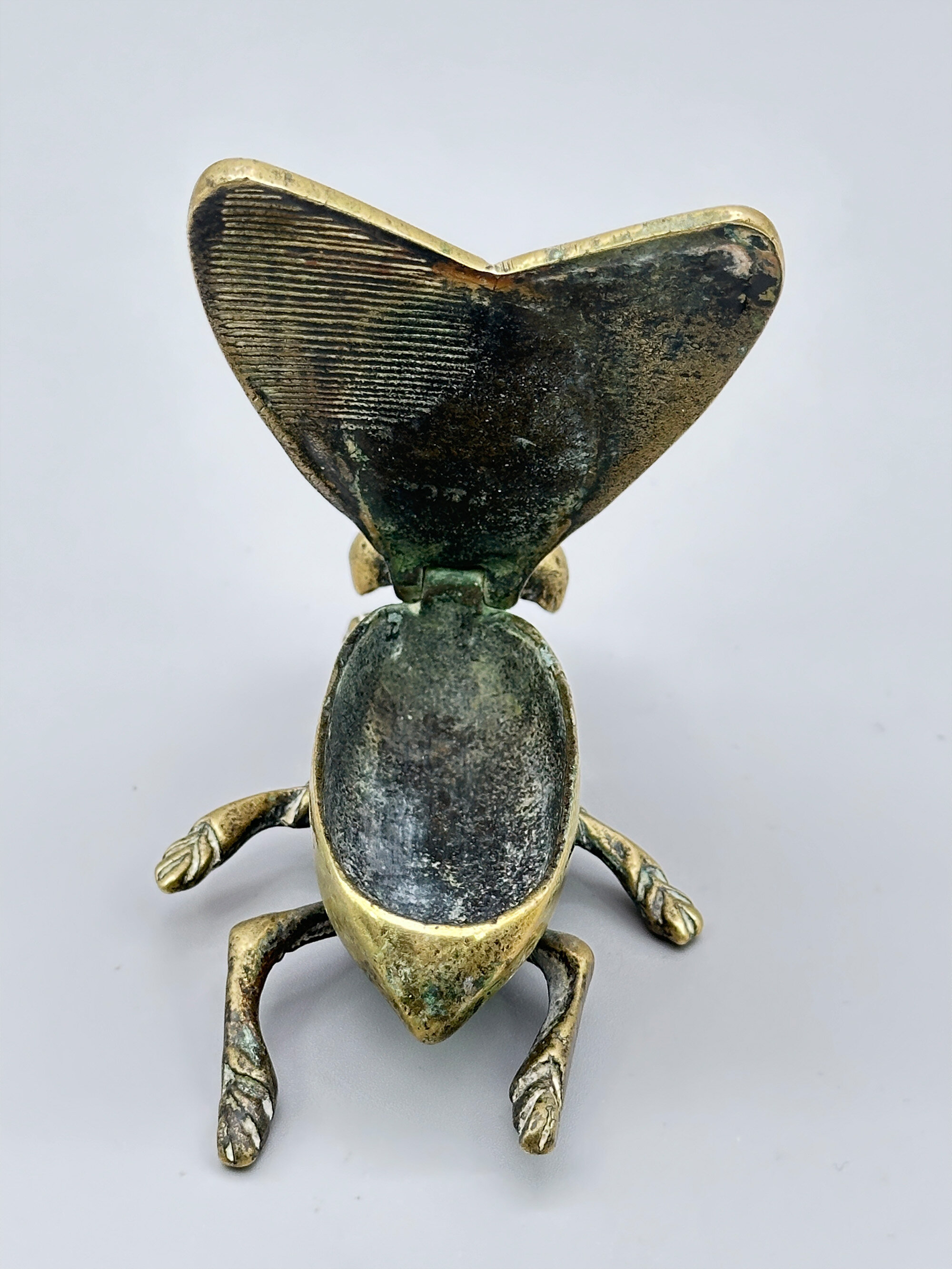 This is a vesta case in the form of a fly with a striker plate to the underside of one of its wings. Vesta was the Roman Goddess of the hearth, home and family and altars and temples dedicated to her commonly employed a live flame, which caused some manufacturers of matches in the nineteenth century to name their products 'Vestas', the most famous being the Swan Vesta match produced from around 1900. Early matches were highly combustible and cases to keep them safe were produced from around 1830 onwards. The peak of popularity of the 'Vesta Case' was around 1900 and their use declined in the 1920s when the first cigarette lighters were produced giving a probable dating here to the last years of their production. It is marked to the underside of the wings 'P&C' but this manufacturer cannot be identified.| Size: | Length (max) 9cm, Width (max) 6cm, Ht (max) 3cm |