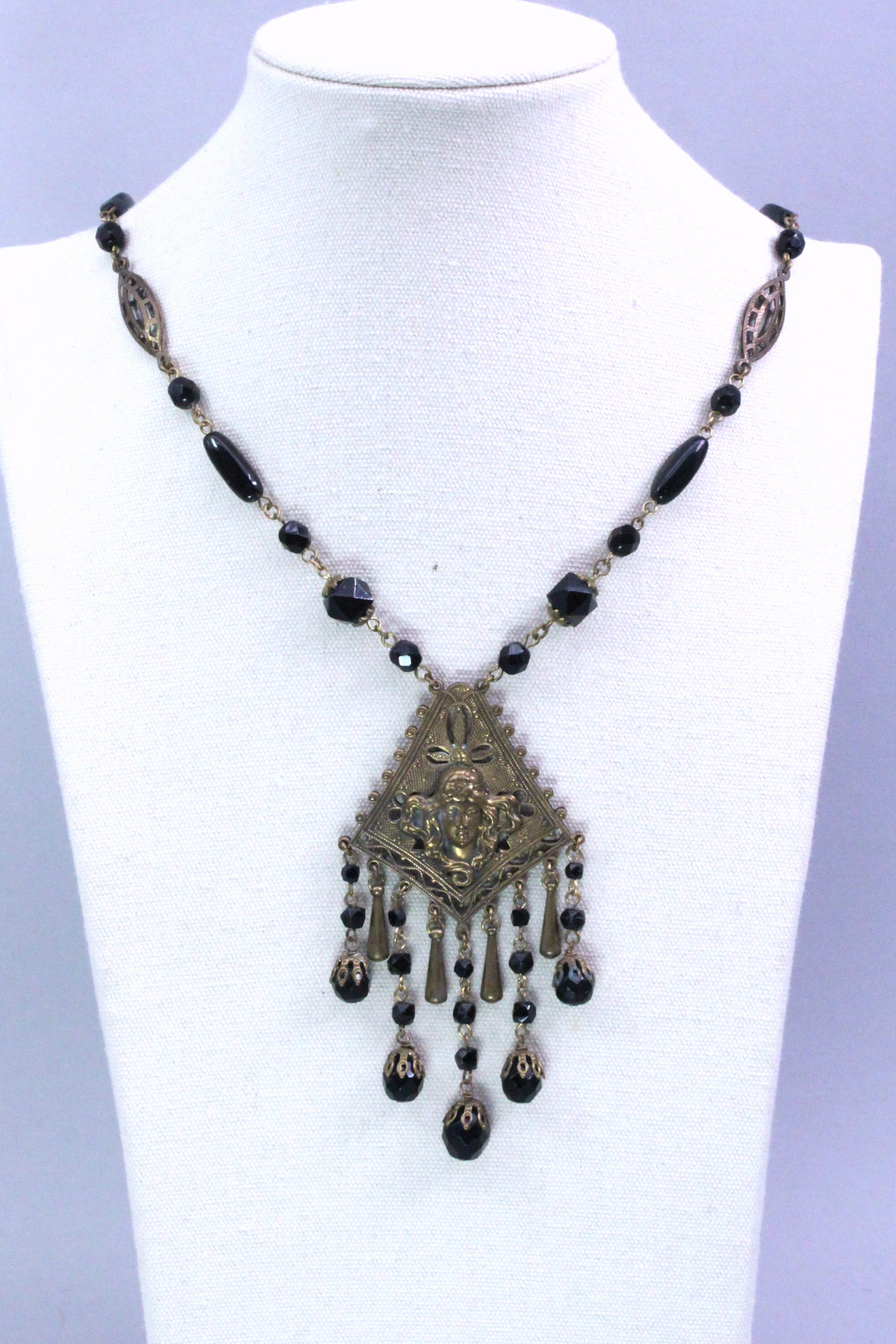 This is a beautiful necklace featuring an Art Nouveau style plaque modelled with the head of female figure with gilt metal French jet drops and beads suspended from a necklace also with French jet beads and two gilt metal plaques all linked by gilt metal chain.| Size: | Necklace 50 cm, Plaque 9 cm drop, 5 cm width (max) |