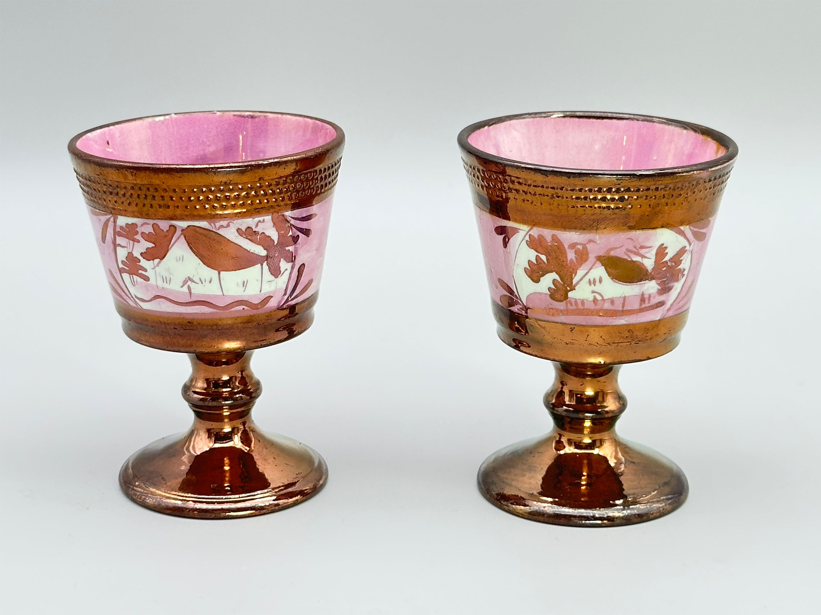 Pair of copper lustre Goblets decorated birds and flowers, Staffordshire, C19th