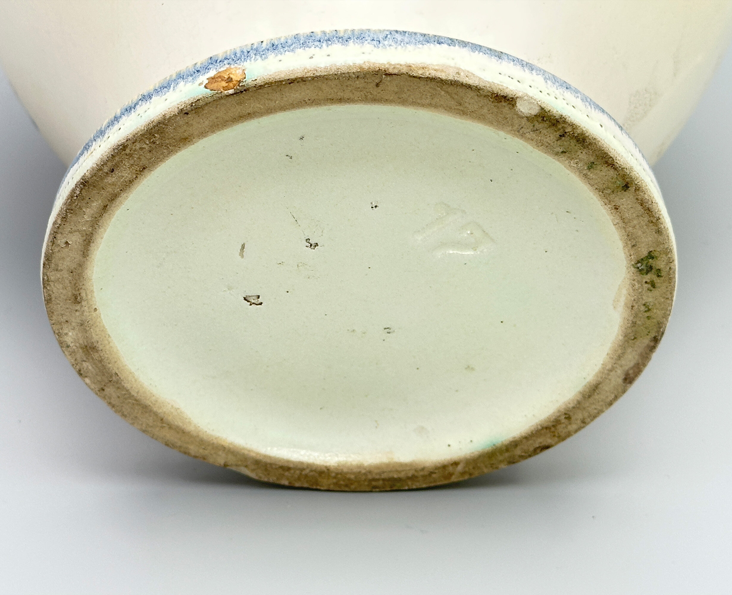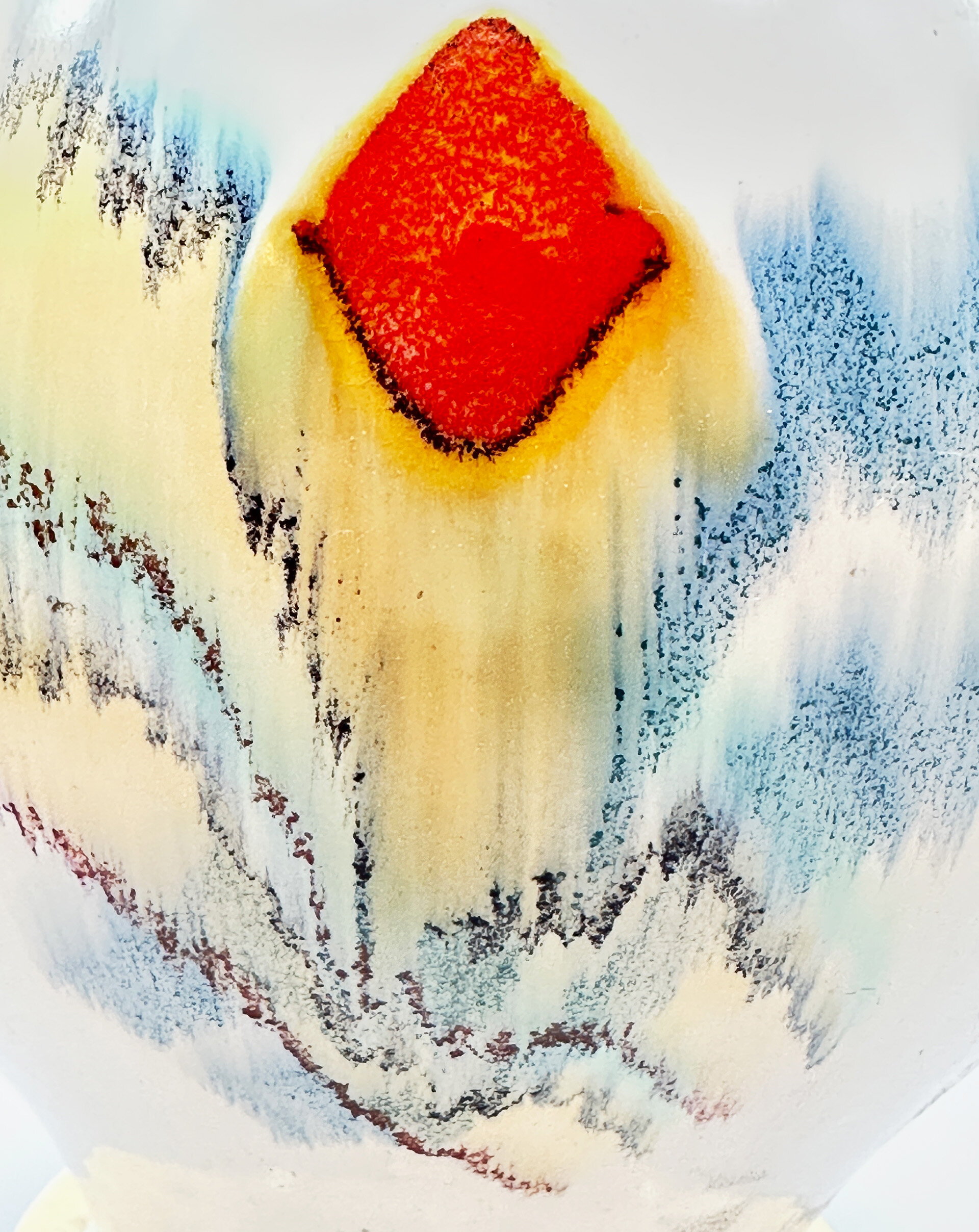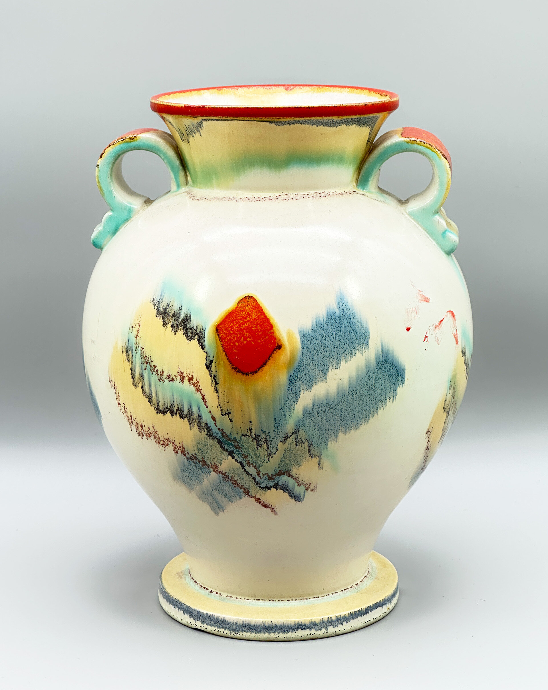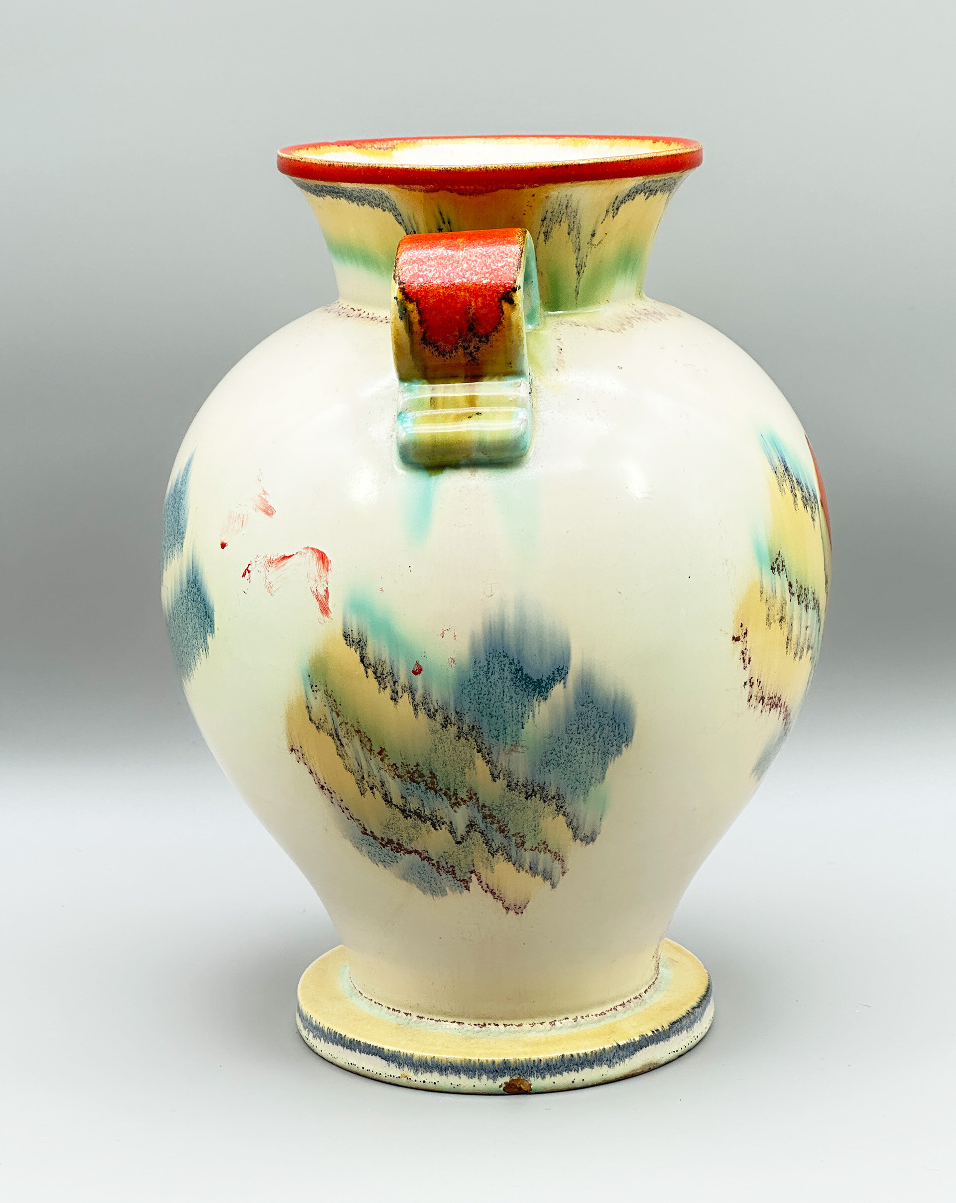 A ceramic vase of bulbous form with a flat spreading foot and a flaring neck, two loop handles to the shoulder, the cream ground decorated with abstract designs in multicoloured splash glazes with tones of yellow, green, blue and orange, the base with an impressed mark ‘17’. While there are no direct parallels for this piece, a vase with very similar decoration and double loop handles is attributed to the German factory Dumler and Breiden, better known for their post war productions which usually carry their distinctive mark, an interlocking ‘DB’. But the firm was founded in 1883, the paste here is almost certainly continental and very similar to that of other Dumler and Breiden pieces and the glazes resemble those found on marked works, so the attribution is certainly plausible and dating would most likely be to the 1930s which is fully consistent with the Art Deco features of the vase itself. While not all Dumler and Breiden pieces carried their mark, they did usually show the pattern number and sometimes the size, which may well explain the number ‘17’ seen here.| Size: | Ht 27.5cm, Width (max) 19.5cm, Base 13.2cm |