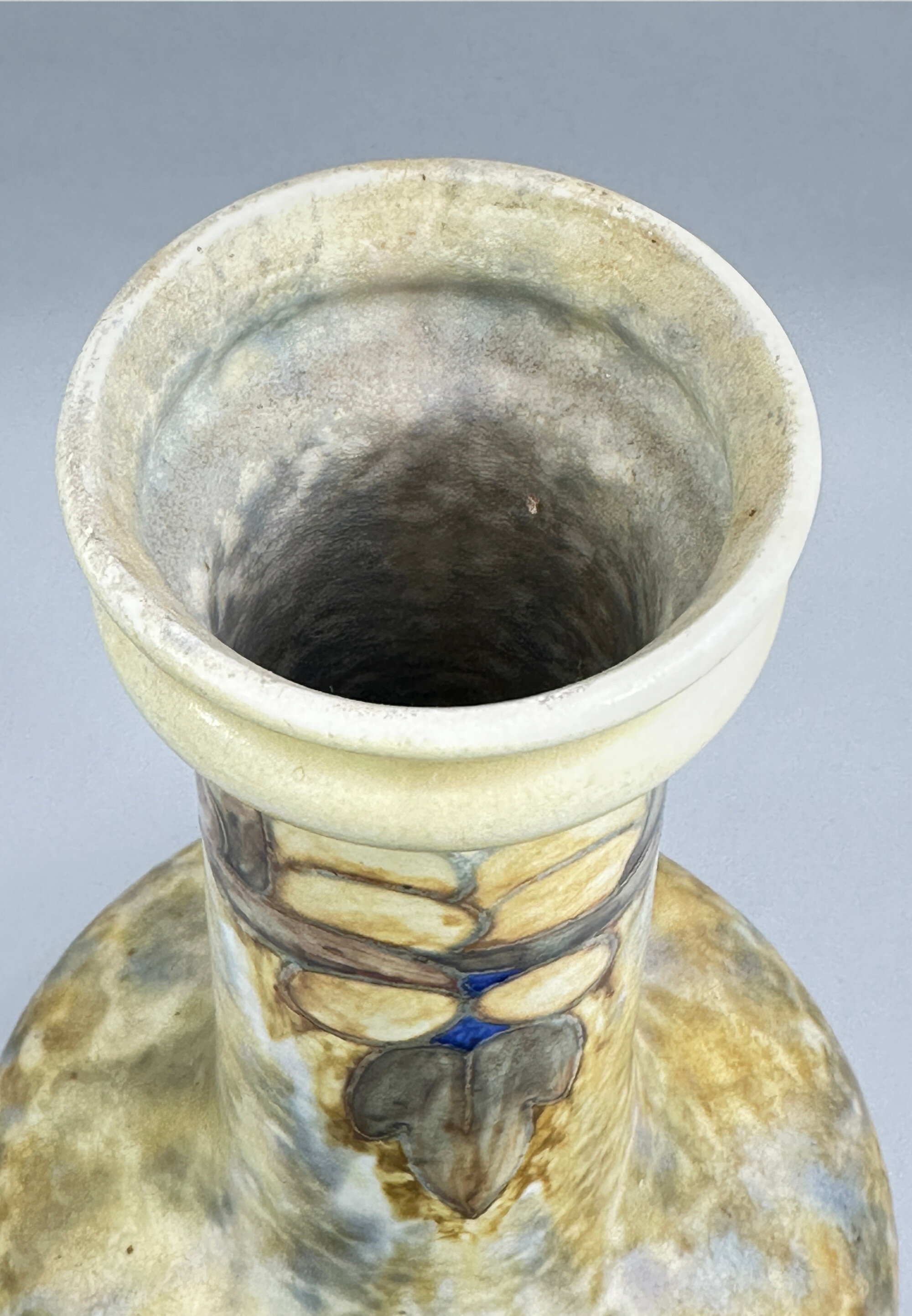A ceramic vase of bottle form, the broad compressed globular body with a tubular neck terminating in a ‘garlic’ rim, glazed overall in a mottled effect employing tones of mustard, blue and green with two stylised motifs of leaves and grapes on the neck, the interior also with a mottled glaze and the base glazed white with a stamped mark ‘CRANSTON’ ‘POTTERY’ in an oval frame with two globes in the centre displaying a banner ‘P P CO LTD’ and a script mark ‘52/4’.Cranston Ware was one of the ranges produced by the Pearl Pottery Company, based in Hanley, Stoke on Trent. Founded in 1892, the firm produced a varied selection of ceramic wares, often following contemporary fashions, until its closure in 1947. This vase is demonstrably in the Art Nouveau style and would have been produced when it was at its zenith in the early 1900s. The pattern was known as ‘Tukan’ ware and some of the pieces, but not all, have an impressed mark displaying this. This is an excellent example of the type with the glazes and decorative detail well rendered and certainly deserves the attention of collectors of Art Nouveau.