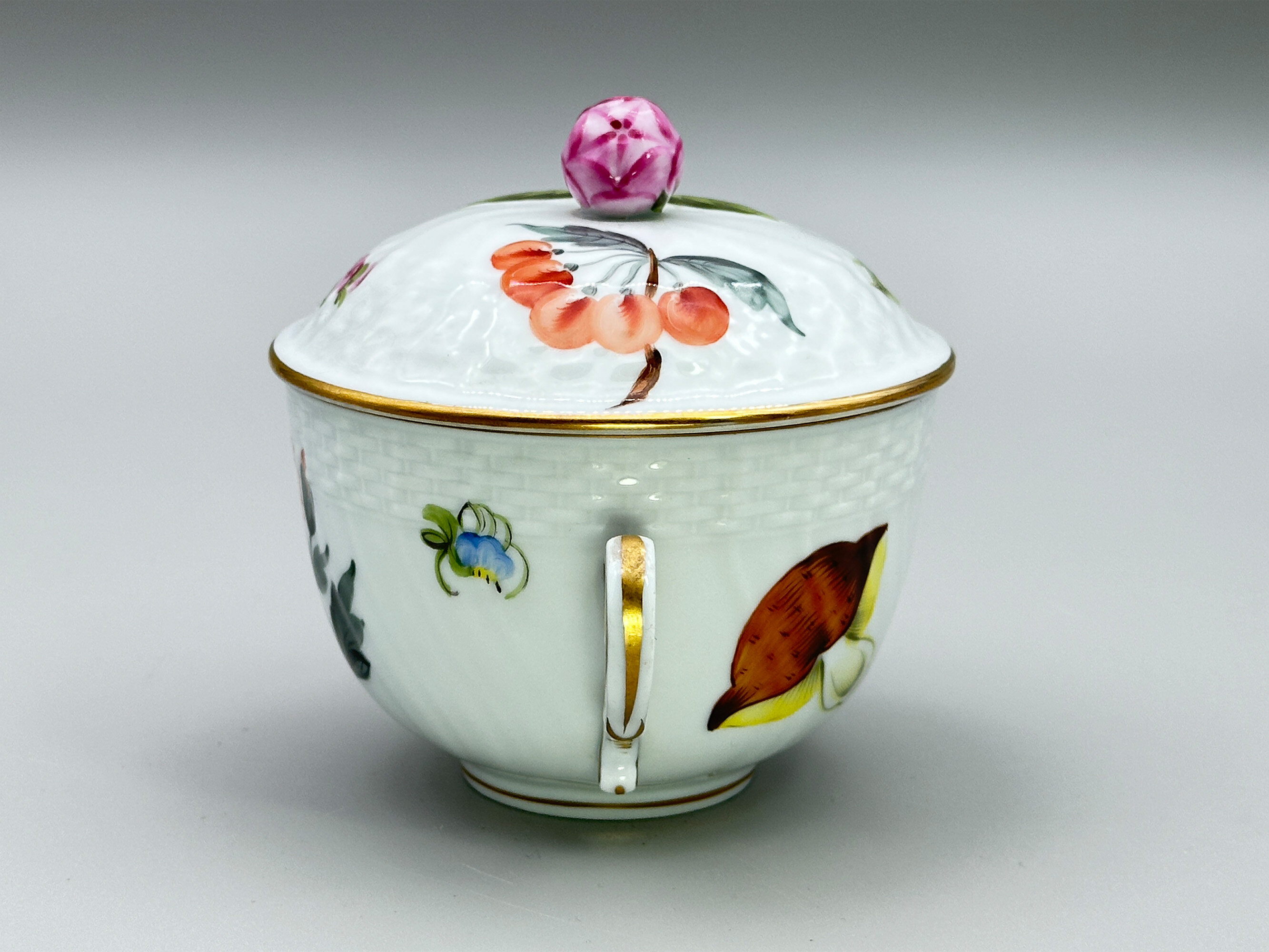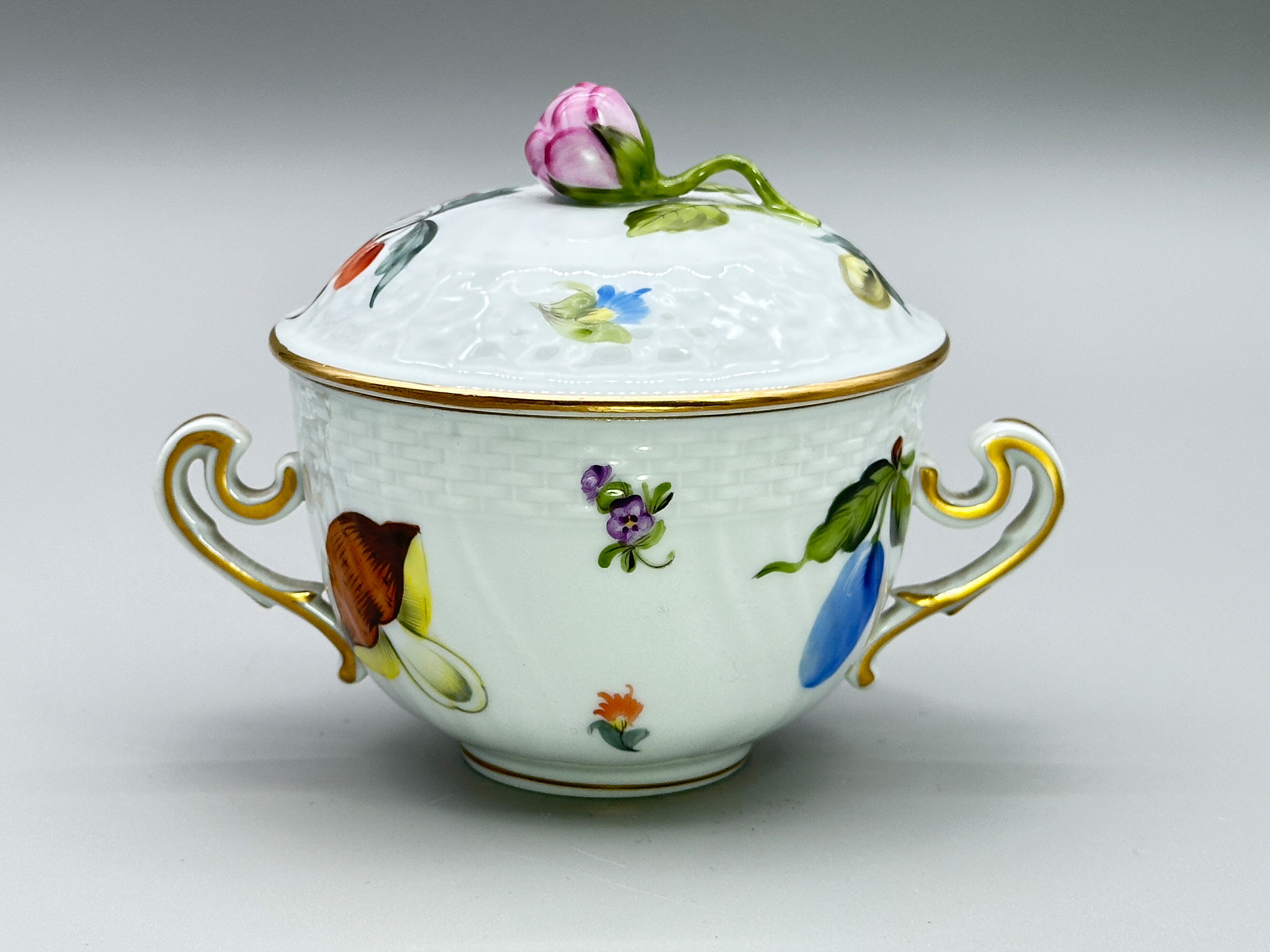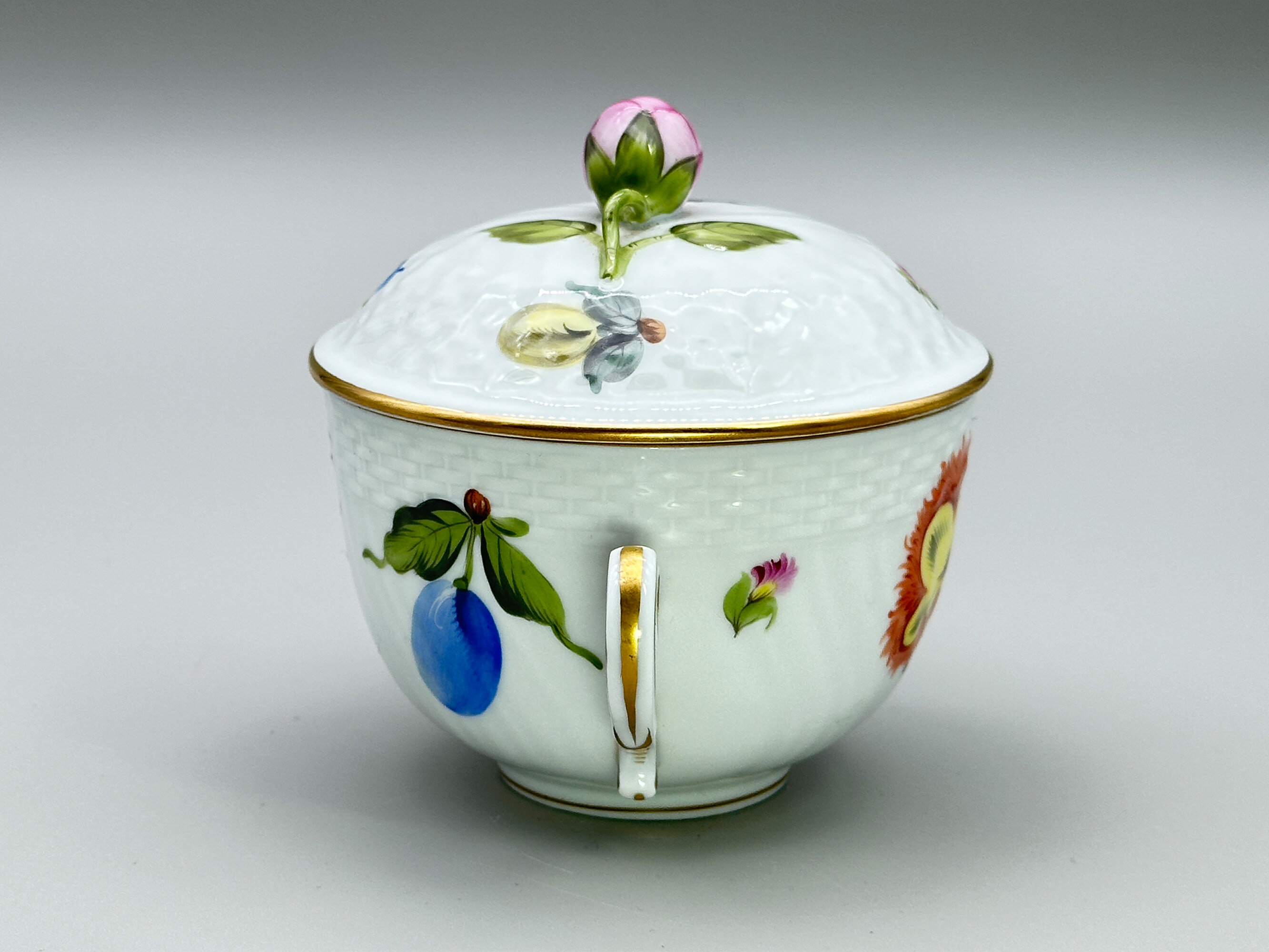 A fine porcelain small circular deep bowl and cover with two rococo form handles, the cover with a modelled floral finial, both parts with a band of impressed basket work and delicately decorated in coloured enamels with floral and fruit sprays, the base with a blue printed mark ‘HEREND. HUNGARY’ above a shield with two brushes below and the wording ‘HAND PAINTED’ and below this the numbers ‘1718’.This écuelle and cover, possibly intended as a sugar bowl, was made by the Herend Porcelain factory. Founded in Hungary in 1826 it almost immediately enjoyed enormous popularity with wealthy customers including members of the European aristocracy. Production continued into the twentieth century through nationalistion in 1948 and reprivatisation in 1993 and continues to the present day. The designs produced in recent years often copy those of an earlier period and this is most likely the case here where resemblances can be seen to the nineteenth century productions from Meissen. The format of the mark indicates a fairly recent date of manufacture, probably in the later years of the twentieth century, but the quality of the execution is in no way diminished and the modelling of the finial in particular of the highest standard.