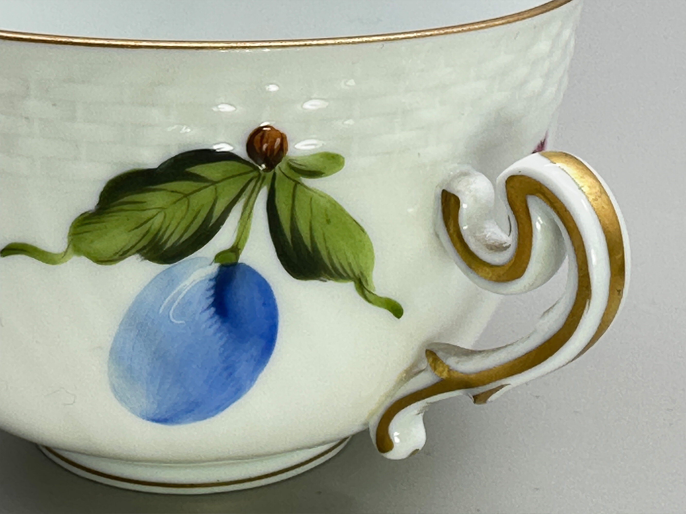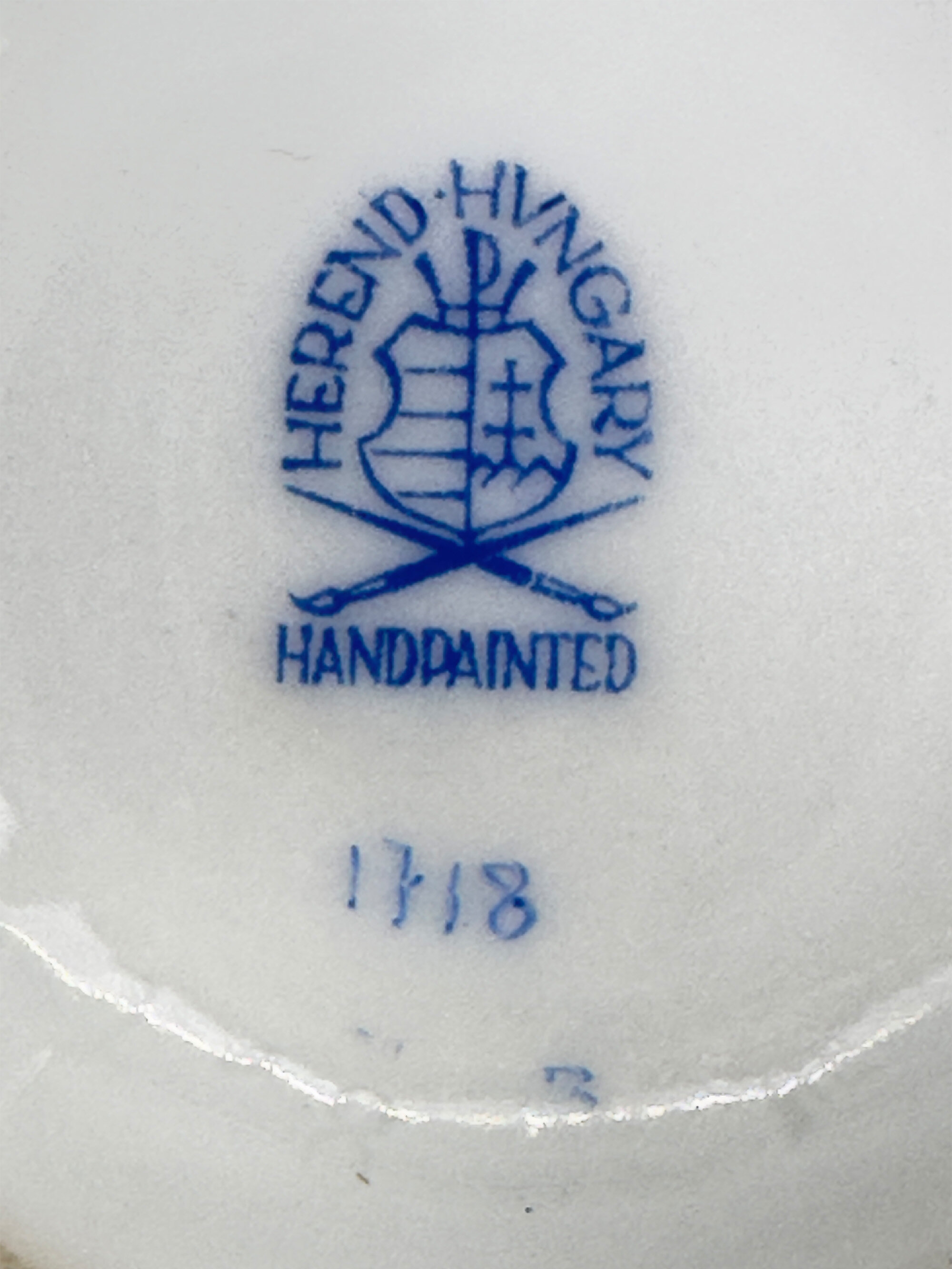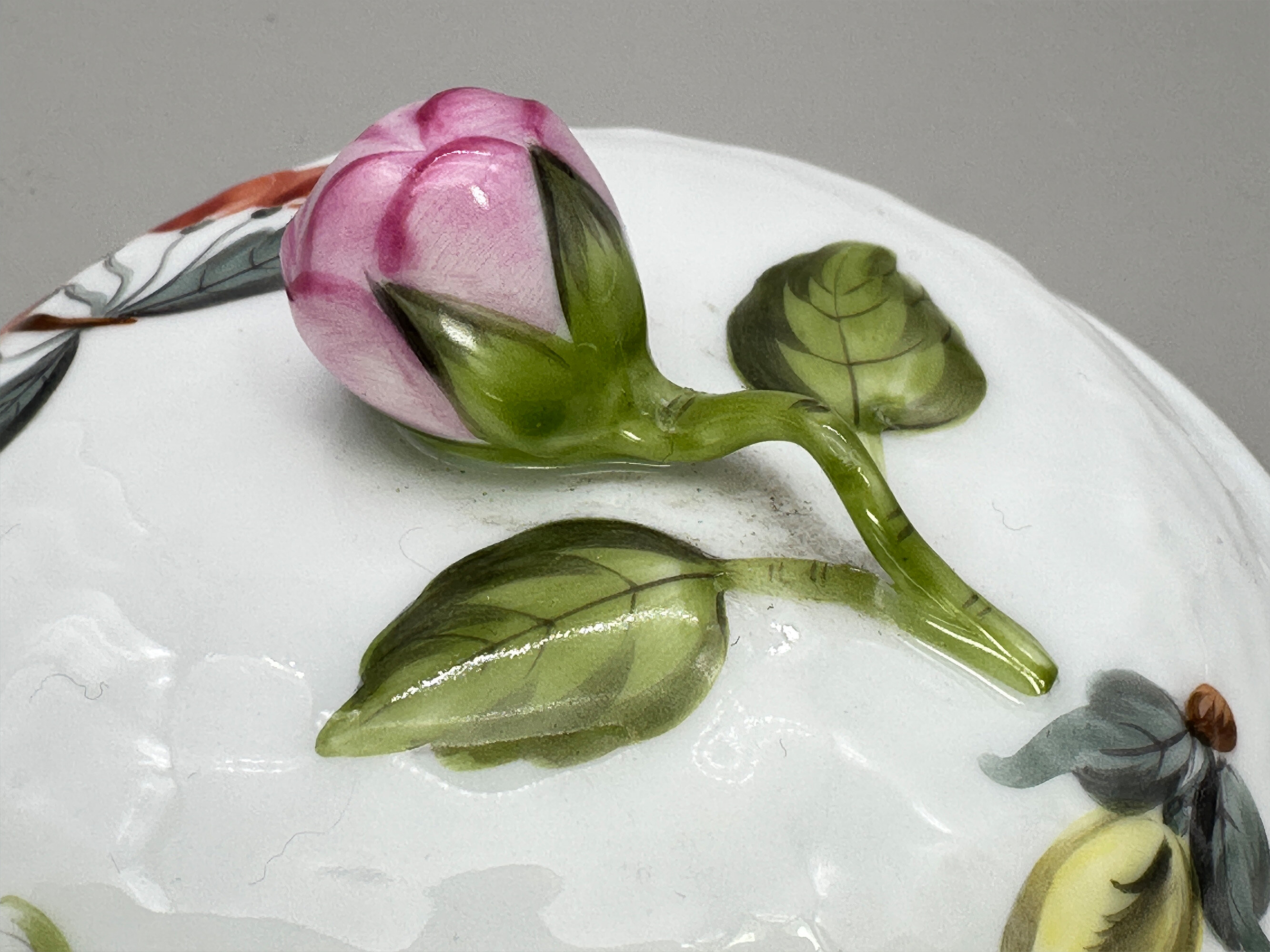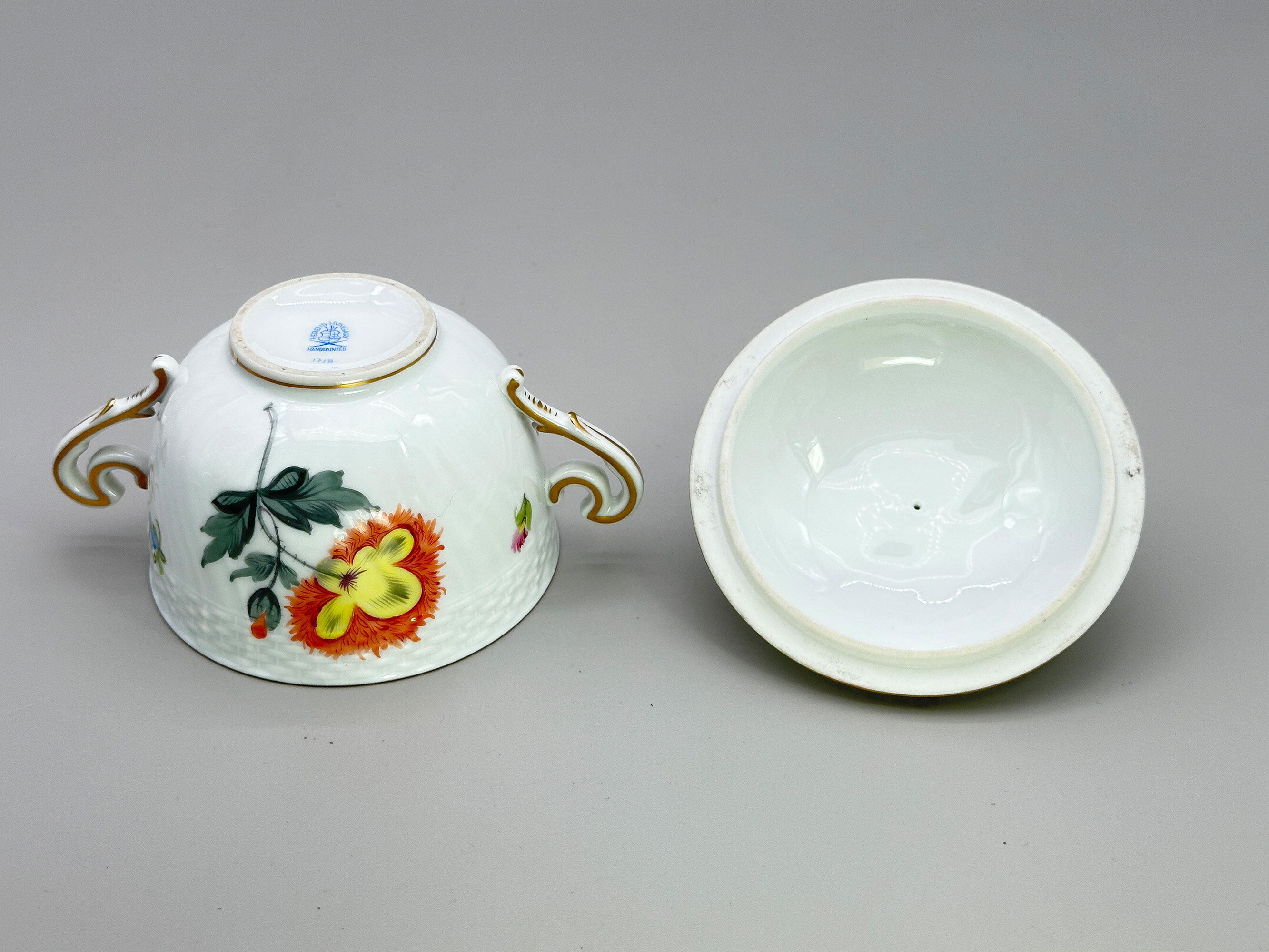A fine porcelain small circular deep bowl and cover with two rococo form handles, the cover with a modelled floral finial, both parts with a band of impressed basket work and delicately decorated in coloured enamels with floral and fruit sprays, the base with a blue printed mark ‘HEREND. HUNGARY’ above a shield with two brushes below and the wording ‘HAND PAINTED’ and below this the numbers ‘1718’.This écuelle and cover, possibly intended as a sugar bowl, was made by the Herend Porcelain factory. Founded in Hungary in 1826 it almost immediately enjoyed enormous popularity with wealthy customers including members of the European aristocracy. Production continued into the twentieth century through nationalistion in 1948 and reprivatisation in 1993 and continues to the present day. The designs produced in recent years often copy those of an earlier period and this is most likely the case here where resemblances can be seen to the nineteenth century productions from Meissen. The format of the mark indicates a fairly recent date of manufacture, probably in the later years of the twentieth century, but the quality of the execution is in no way diminished and the modelling of the finial in particular of the highest standard.