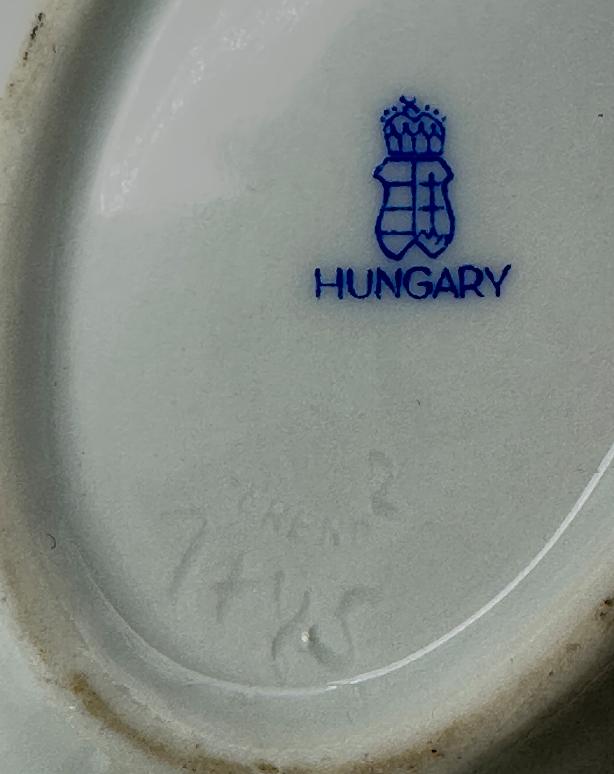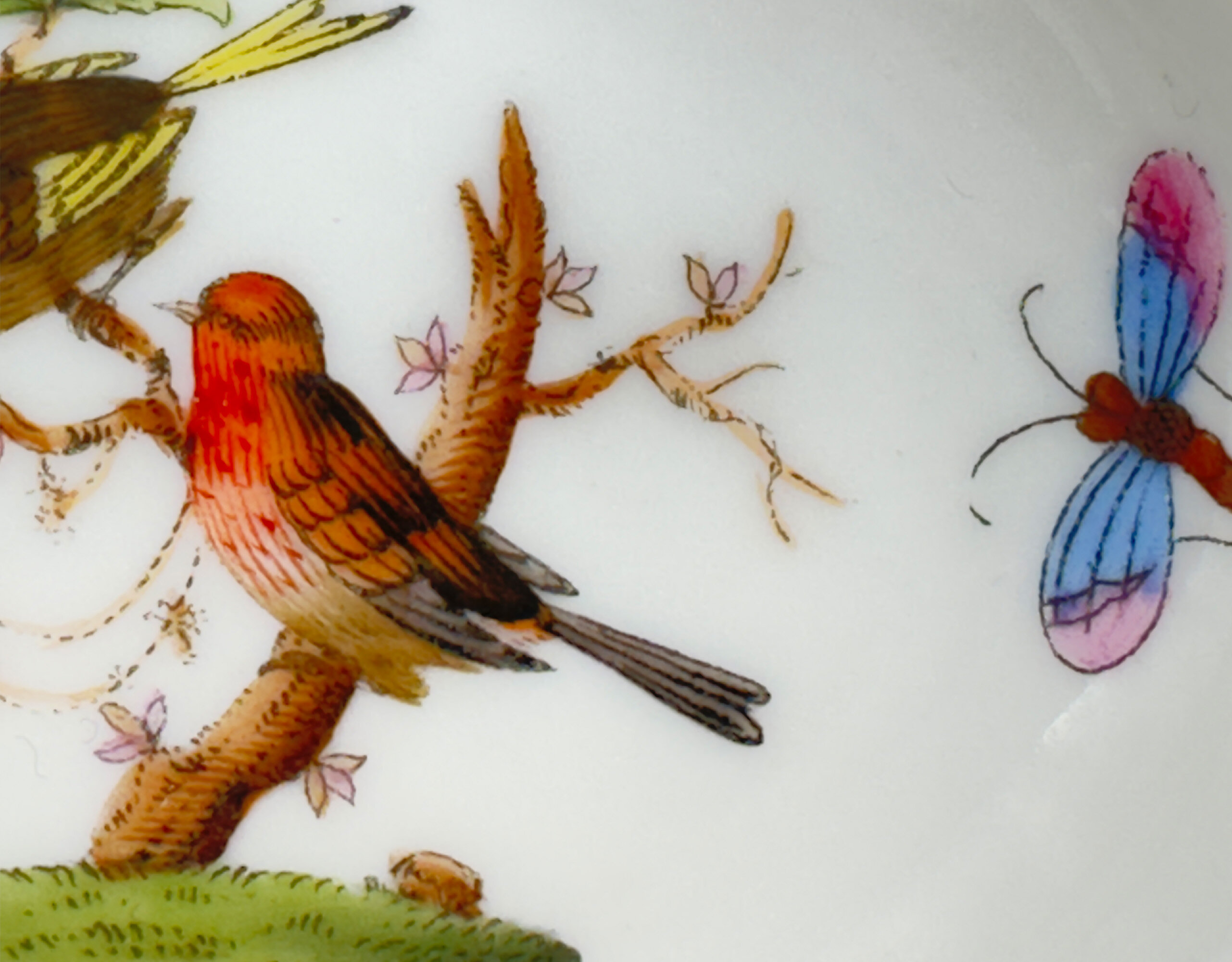 A small fine quality porcelain oval shallow dish with semi circular ‘handles’ at each end, delicately decorated in coloured enamels with birds on a branch and insects, the reverse with a blue printed crown and castle mark above the lettering ‘HUNGARY’ and impressed marks ‘HEREND’ and the numbers ‘XXXX’ [CHECK].This dish was made by the Herend Porcelain factory. Founded in Hungary in 1826 it almost immediately enjoyed enormous popularity with wealthy customers including members of the European aristocracy. Production continued into the twentieth century through nationalistion in 1948 and reprivatisation in 1993 and continues to the present day. Many of the patterns created in the nineteenth century are still reproduced. The design here is known as ‘Rothschild Bird’ doubtless from its first purchasers all those years ago. The format of the mark allows a fairly close dating to the years 1915-1930, making this an earlier version of the model than many others which appear on the market today.