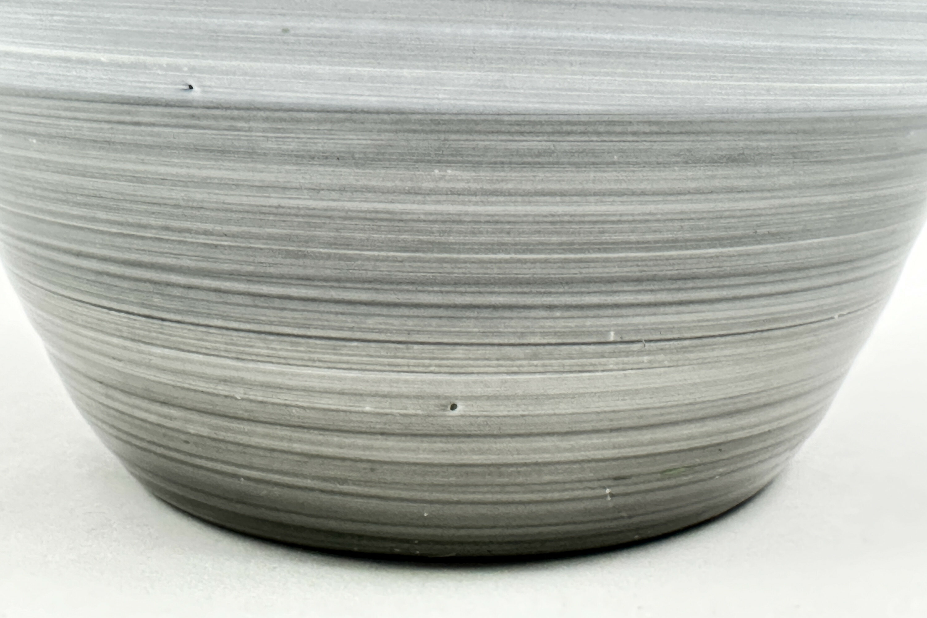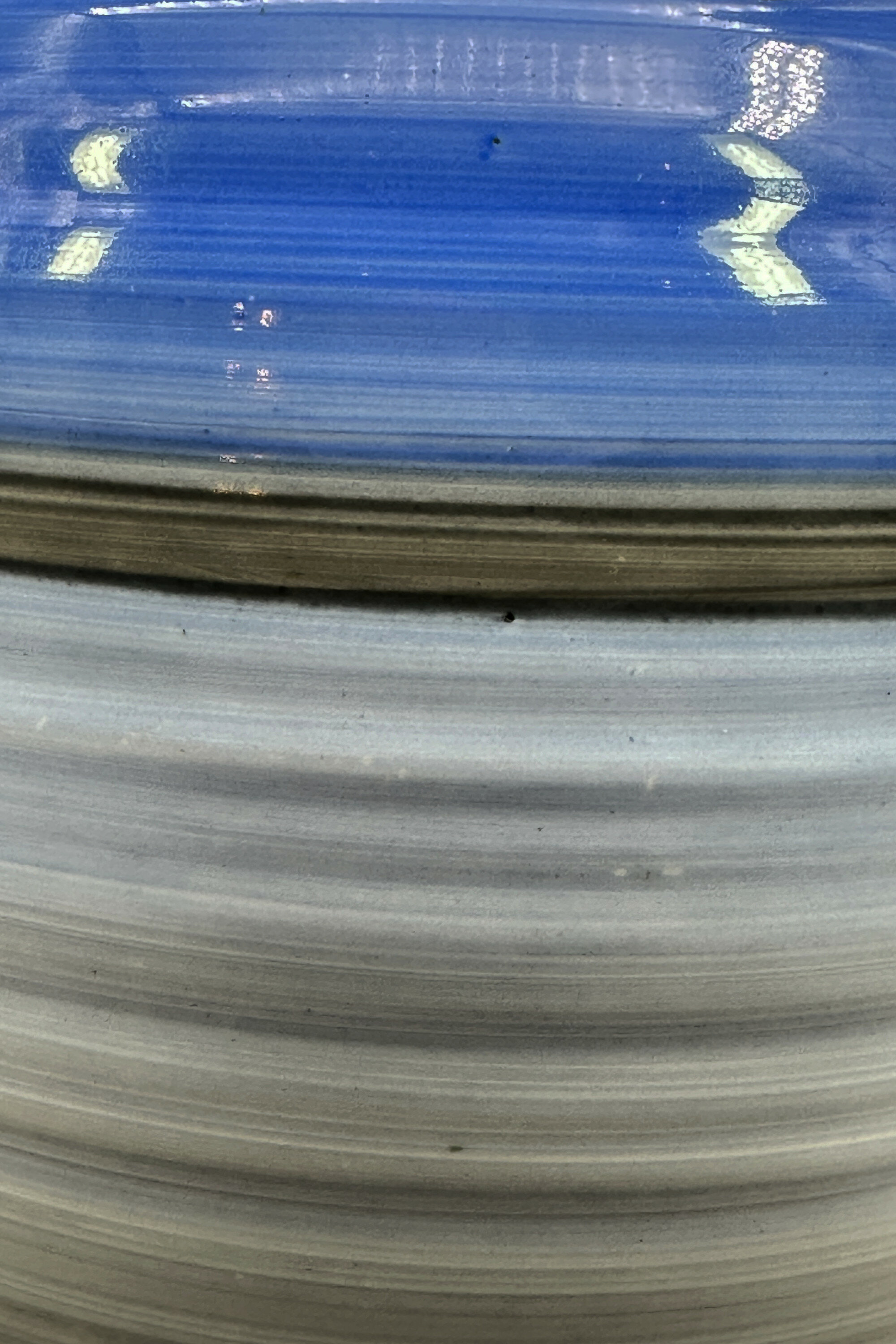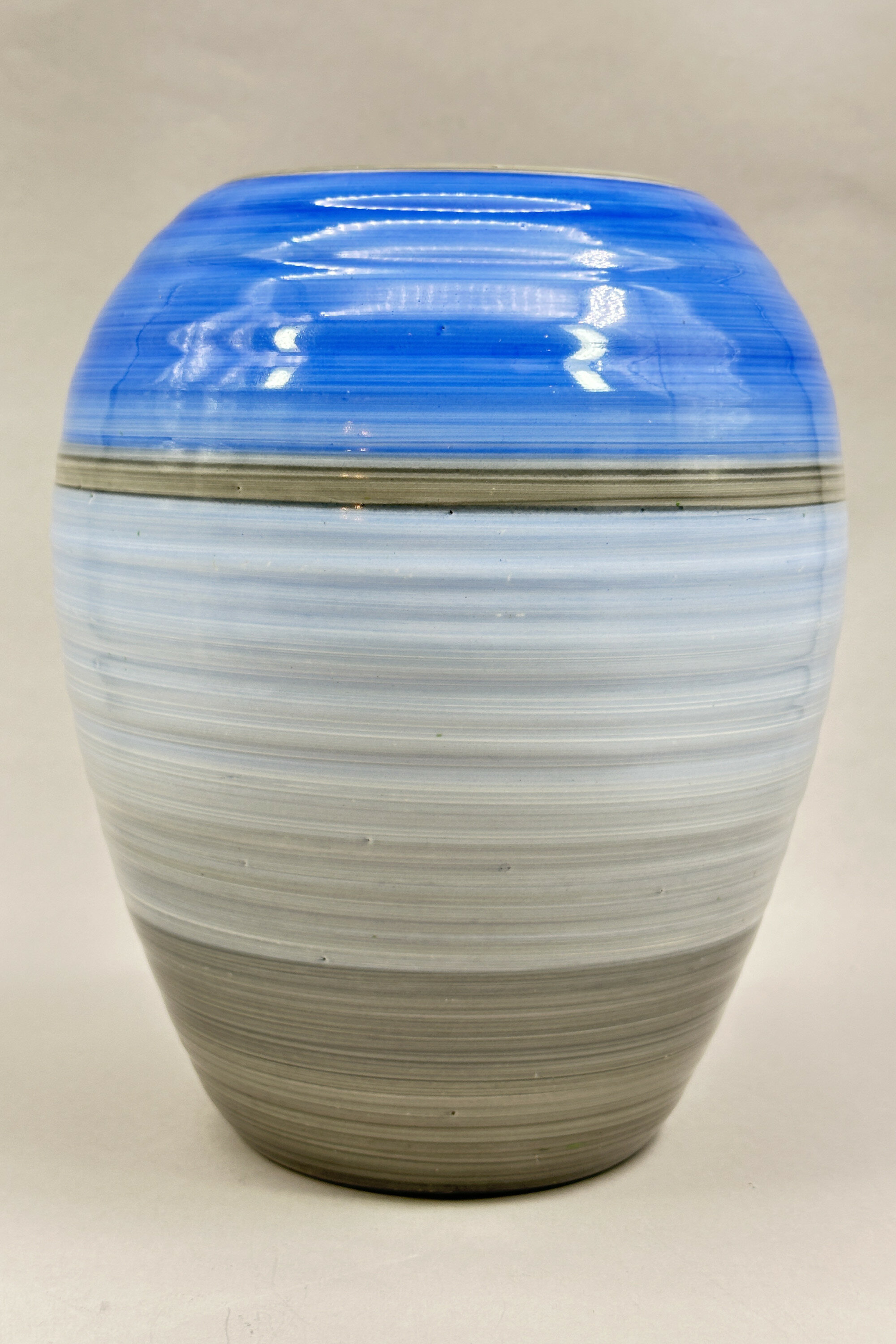 A ceramic vase of plain ovoid form, the body slightly ribbed and painted with various shades of ‘spun’ decoration in blue and grey, the base glazed and with a transfer mark ‘Shelley (in a border frame and underlined) England’, the impressed numbers ‘988’ presumably denoting the model number and the letter ‘d’ in black, probably hand inscribed.Shelley Potteries, situated in Staffordshire, was originally known as Wileman & Co. which had also traded under the name ‘The Foley Potteries’. The first Shelley to join the company was Joseph Ball Shelley in 1862, and it remained a Shelley family business until 1966, when it was taken over by Allied English Potteries. Joseph’s son Percy employed first the designer Frederick Rhead then Walter Slater who had worked with Doulton. It was Walter Slater’s son, Eric, who initiated the ‘Harmony’ range in 1932, at first with a series of banded designs as here and then with drip ware patterns which became enormously popular. Harmony ware was produced in a wide variety of colours and shapes, the plain ovoid form being typical and reflecting the Art Deco styles of the period, but this example is exceptionally large with a more unusual range of colourings.