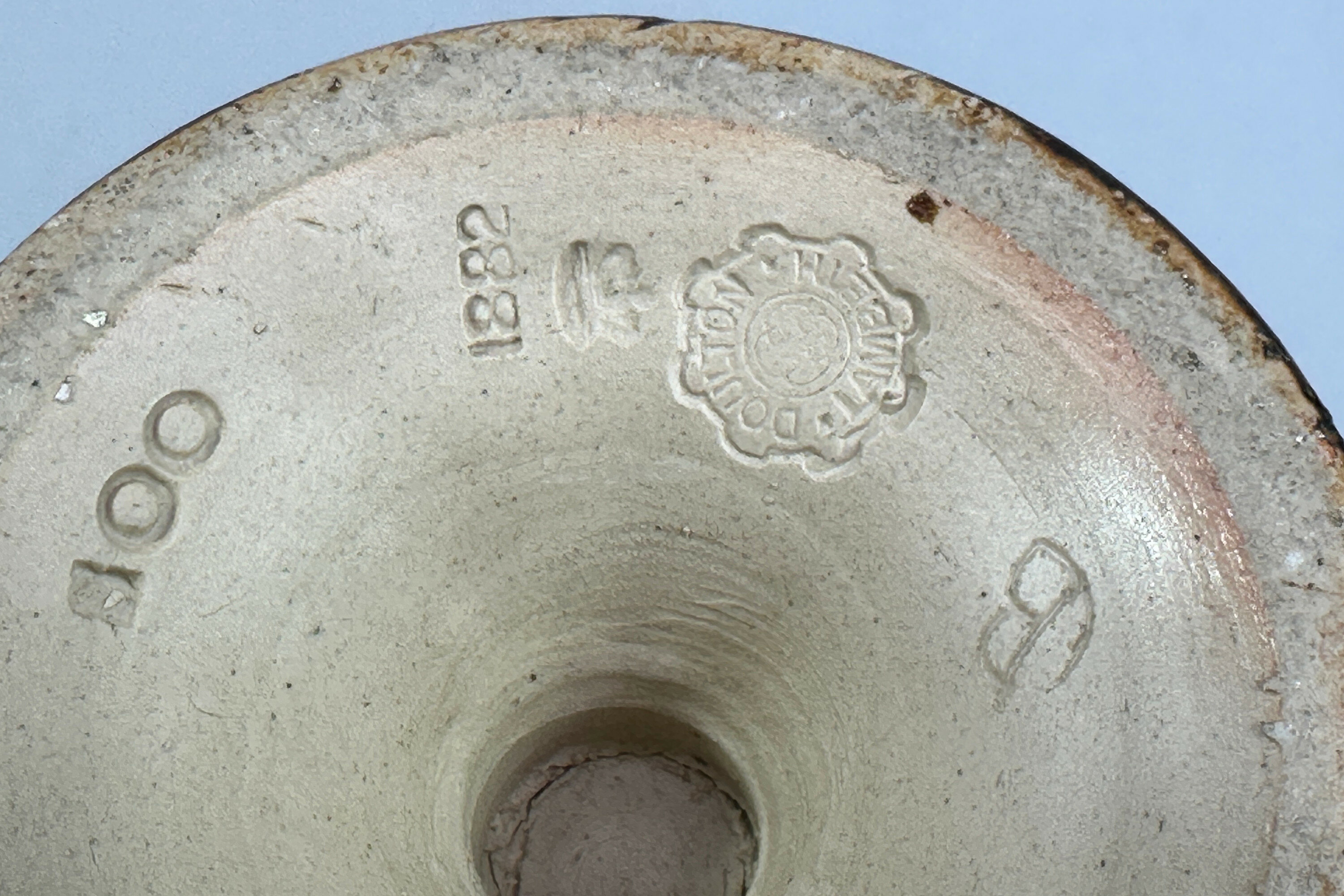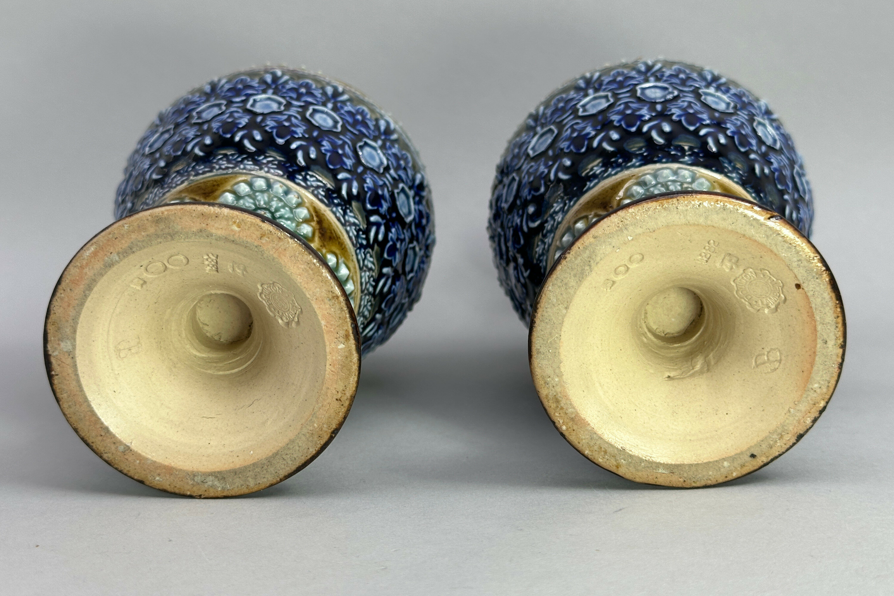 A pair of Doulton Lambeth Vases of elegant Islamic inspired shape, the slender baluster bodies with broadly spreading feet and narrow necks with a wide rim, covered overall with bands of raised moulded decoration with repeating stylised leaf and circle patterns on alternating blue and coffee glaze grounds, the countersunk bases unglazed with impressed marks.The Doulton factory began production in 1815, first at Vauxhall and later moving to Lambeth. In 1882 it opened an additional factory at Burslem, Stoke on Trent in the centre of the English pottery. Known at first mainly for utilitarian works it began to develop decorative wares more extensively in the 1860s and soon gained a reputation for its distinctive designs. As the factory mark indicates, these pieces were made at the Lambeth factory and the absence of ‘England’ below it indicates that it dates to before 1891. The Lambeth ware pieces were often marked with the date of manufacture, here 1882 which is fully consistent with a design inspired by Eastern influence. The artist’s mark, ‘B’ with a tail, which appears on both pieces, is for Alice L Burlton, whose signature can be seen on other pieces of a similar date with similar raised decoration. The other three markings ‘B’ and ‘OO’ presumably indicate the pattern number.