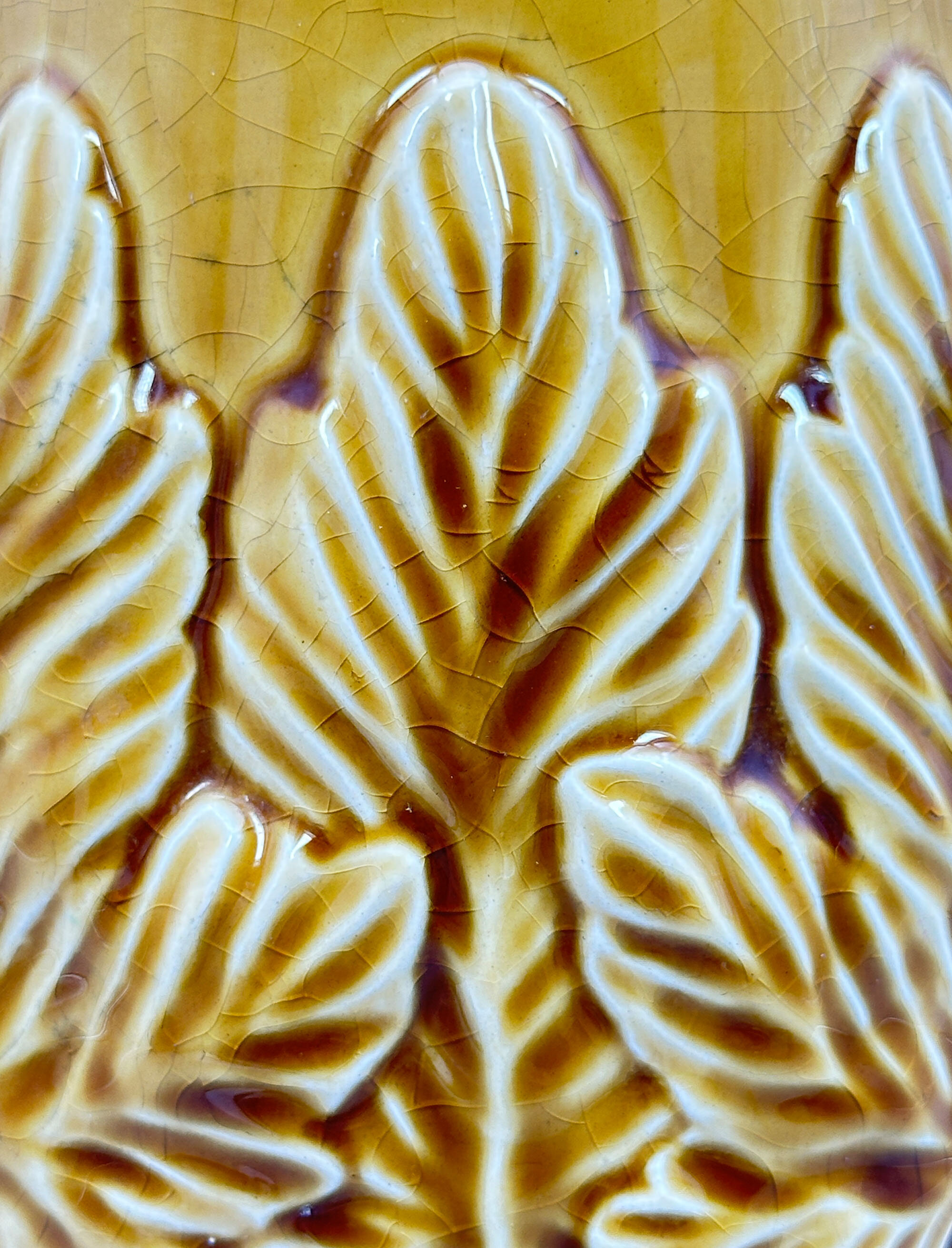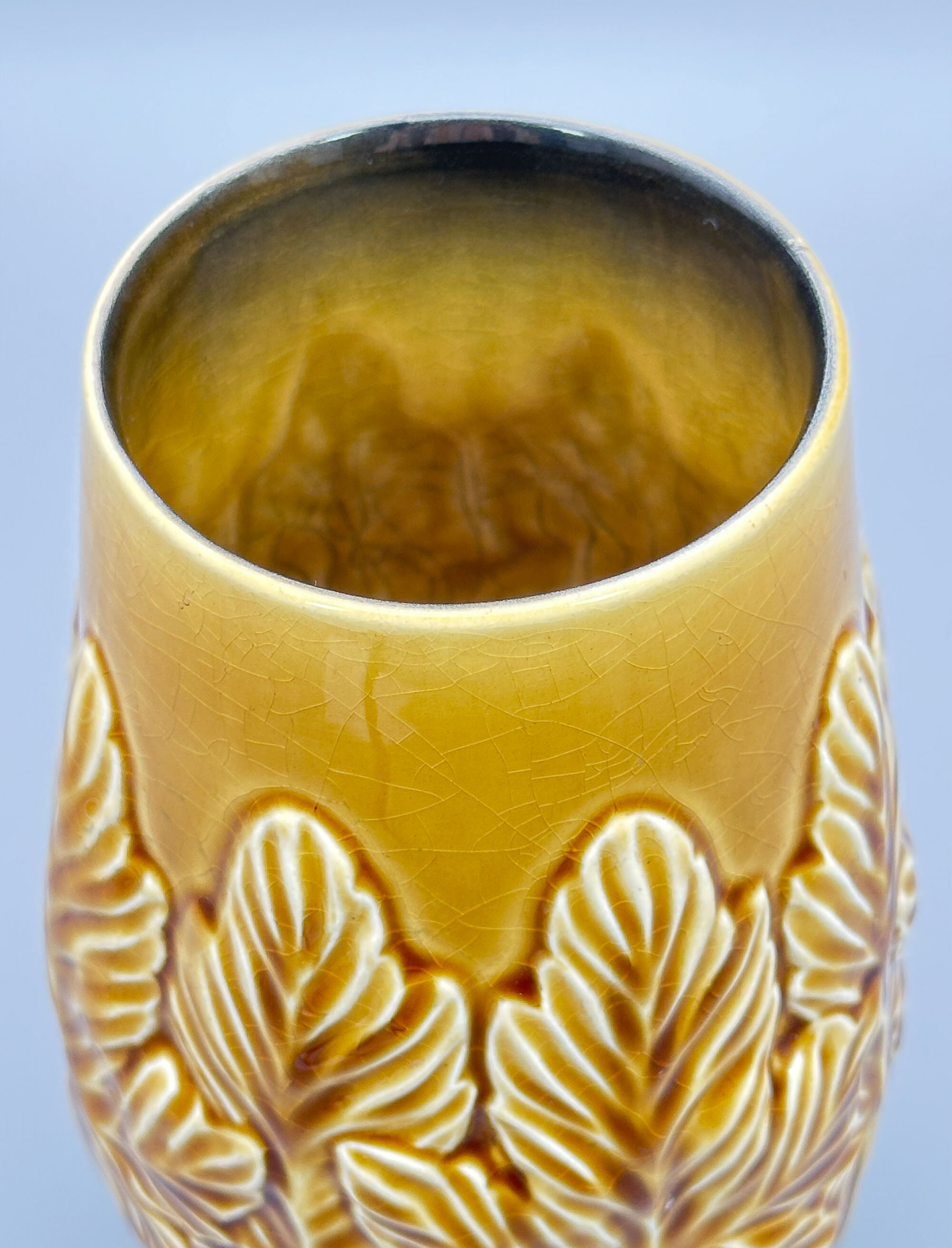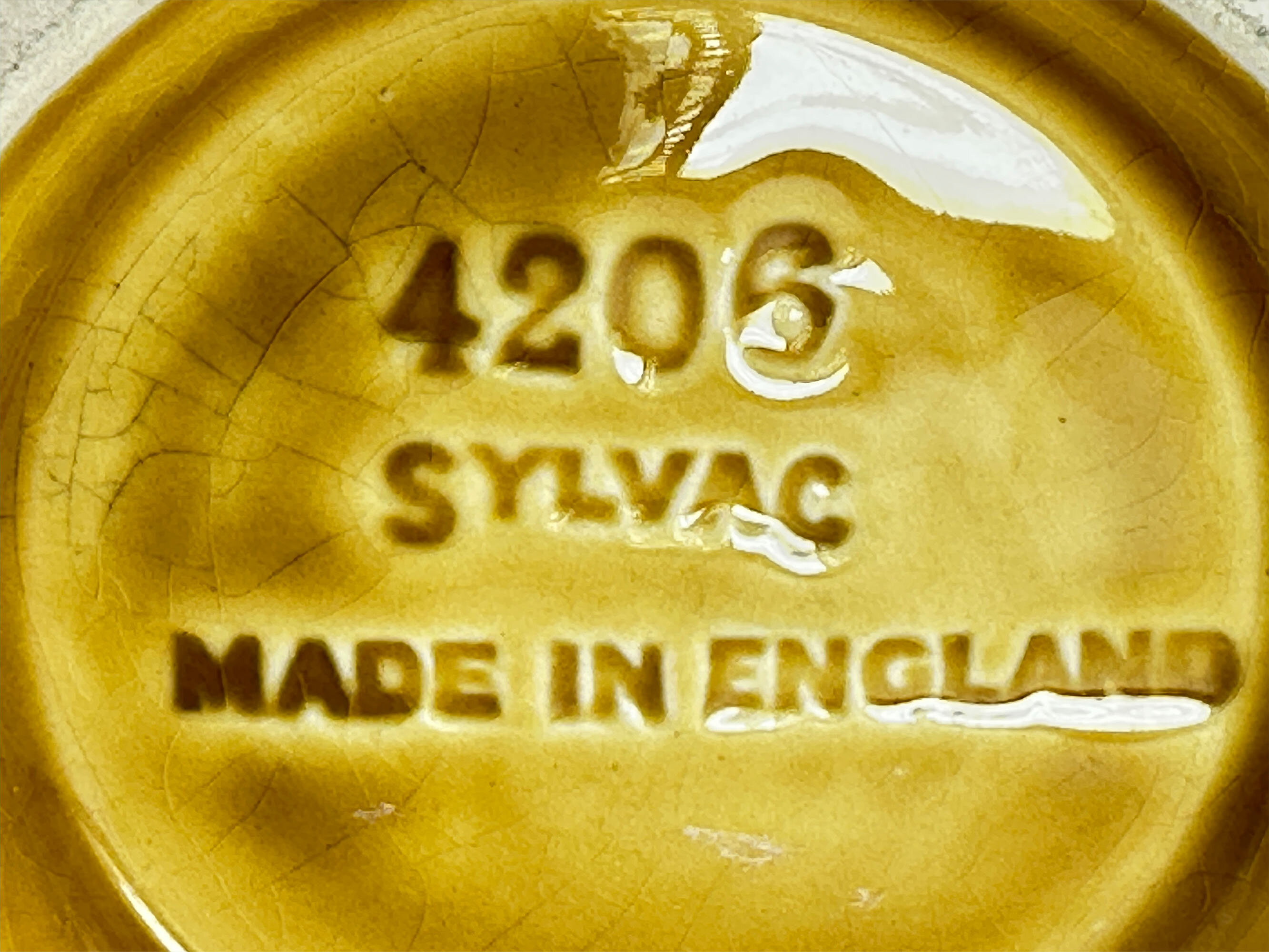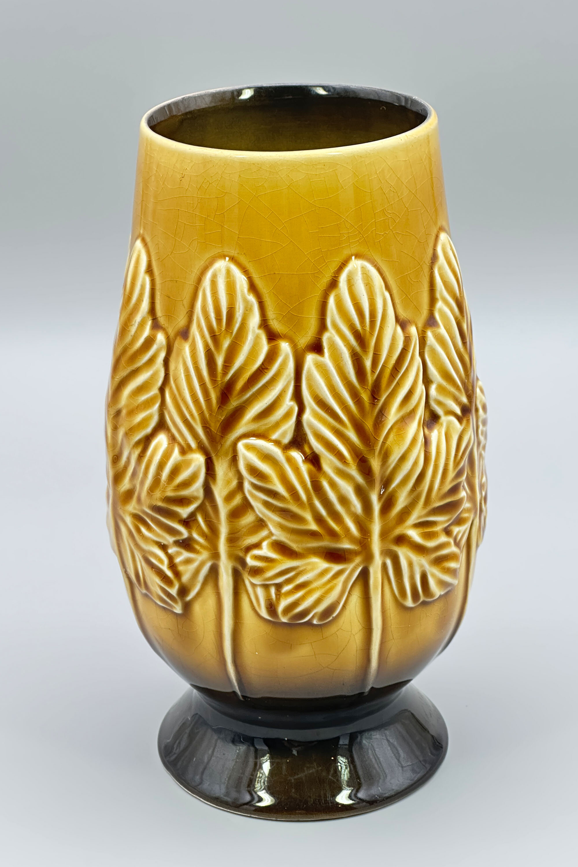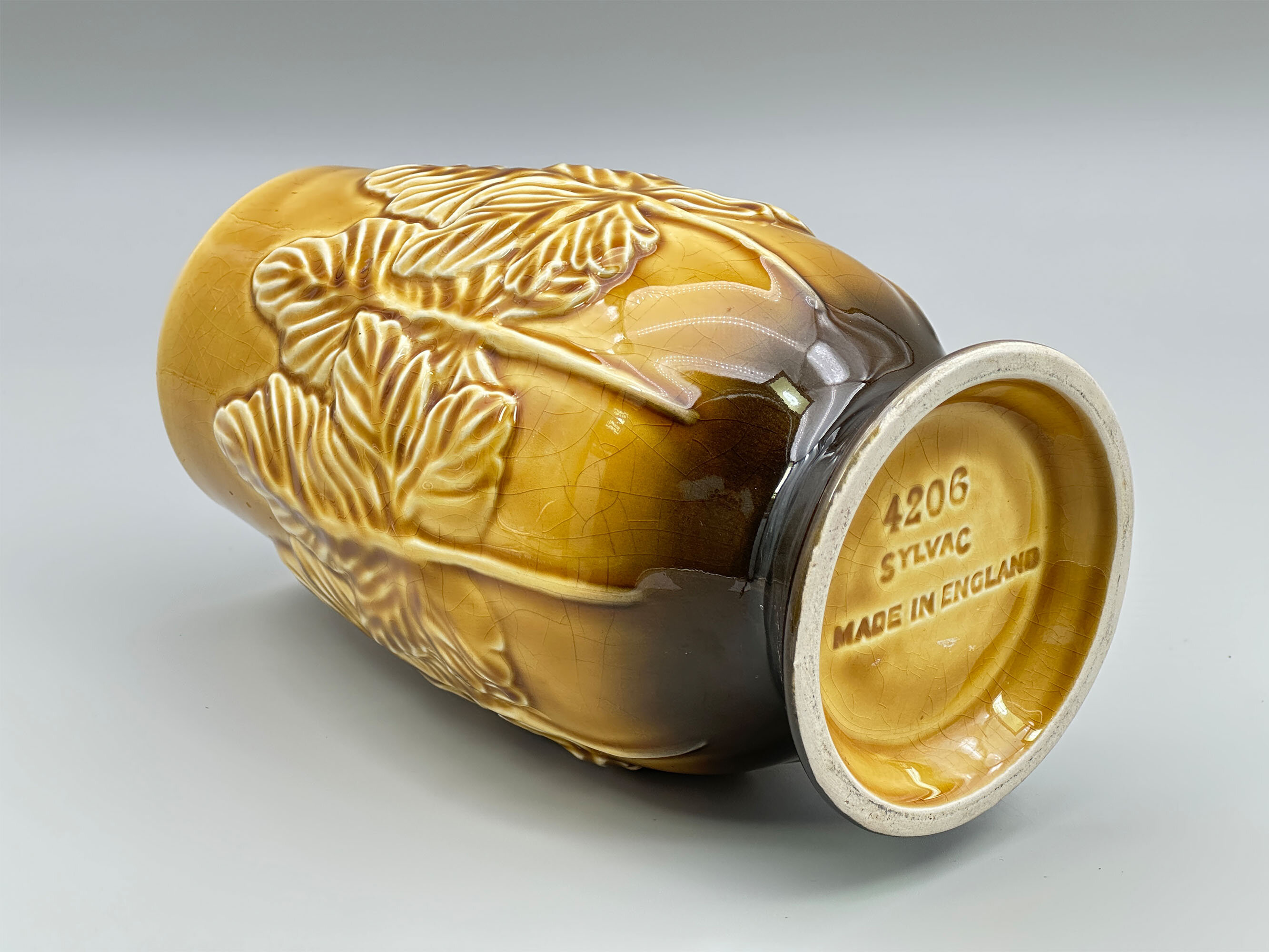 A ceramic vase of ovoid form with a broad spreading foot, the body decorated with a design of repeating sycamore leaves glazed in mustard brown, the base and the interior glazed in dark brown, the base with impressed marks ‘4206’ ‘SylvaC’ ‘Made in England’.This is an example of the naturalistic designs produced by Sylvac in the 1950s and 1960s. While they often chose to imitate tree bark, here they take their inspiration from the leaves themselves. The model occurs in various sizes and glazes including green and dark brown but the mustard colourings are, perhaps, the most pleasing. The smaller versions seem to be marked ‘4215’ as opposed to the numbers seen here ‘4206’.