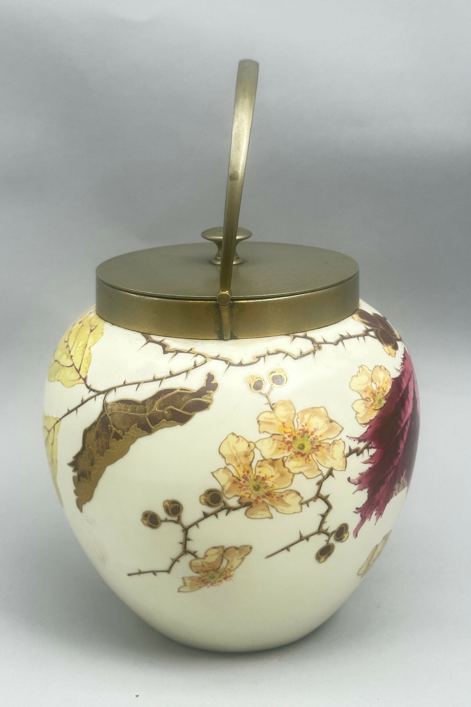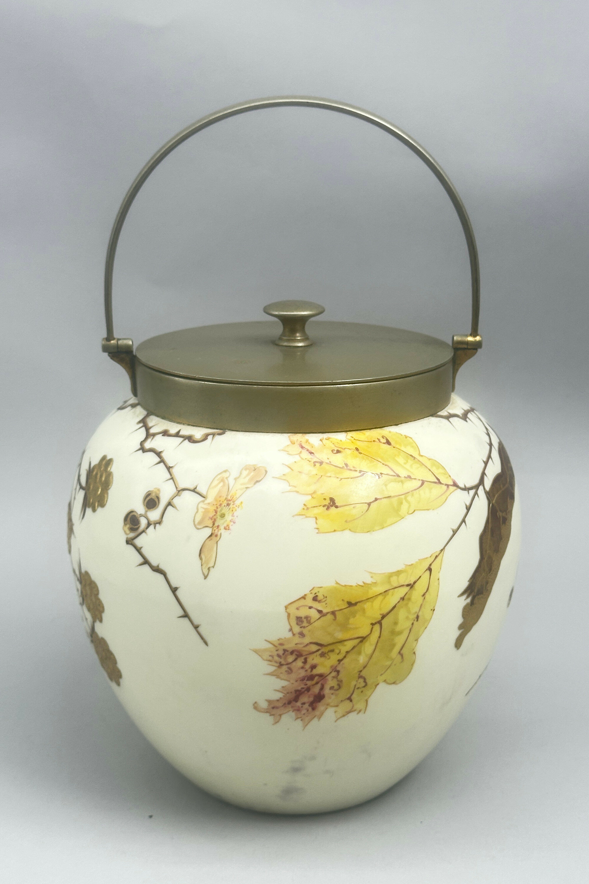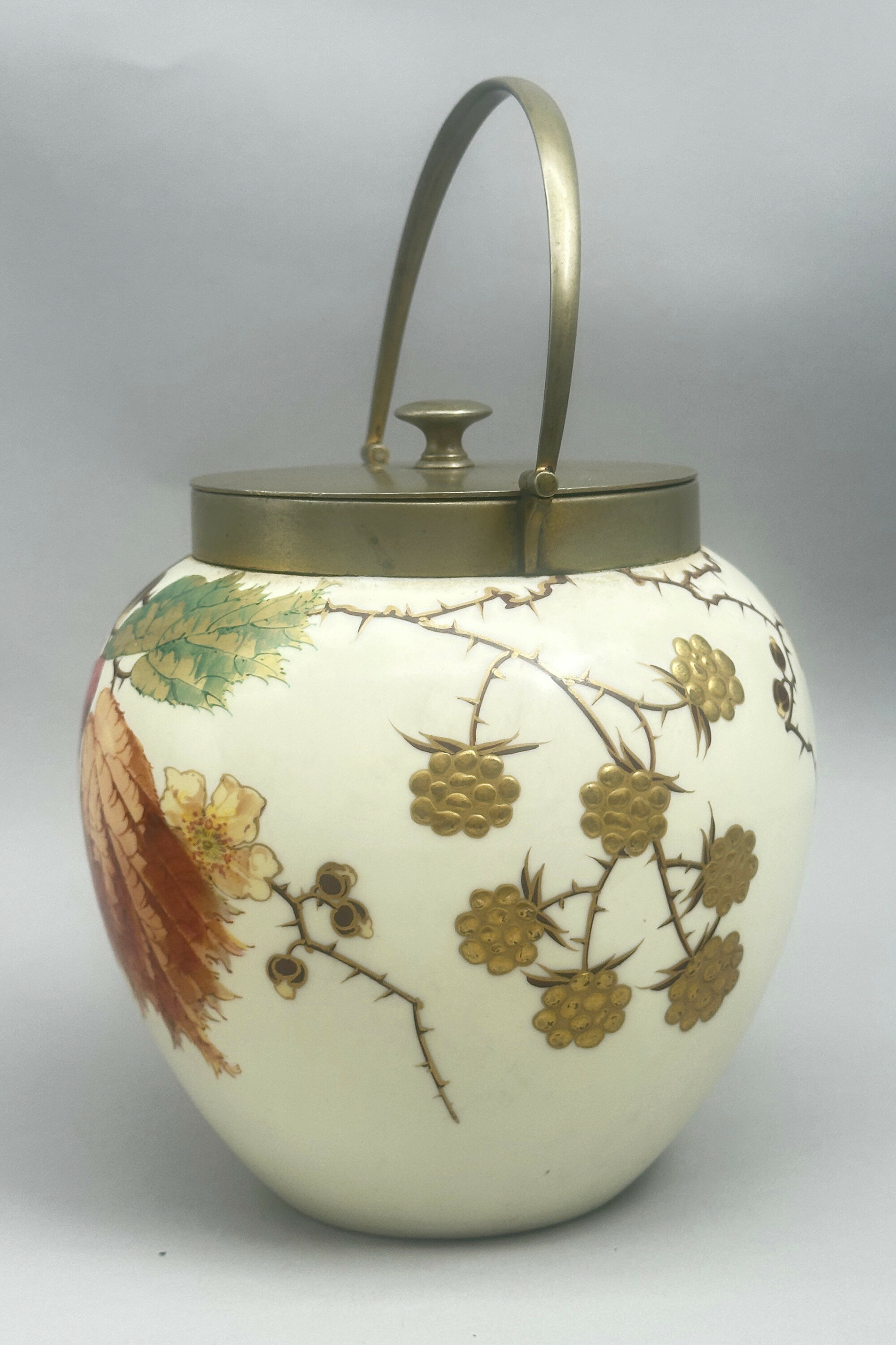 A bone china biscuit jar and cover, the globular body with a short straight neck mounted in brass with a loop handle attached and a flat flush fitting lid with a knob handle, the cream glaze richly decorated in polychrome enamels and gilt with leaves, flowers and berries, the berries with raised surface detail, the base glazed in white with stamped marks ‘WEDGWOOD’, ‘***’,‘ETRURIA ENGLAND’, and the brass lid stamped underneath 'J.W&Co' '9863' '7' .The naturalistic decoration here with its vivid and finely executed detail has elements of the Art Nouveau style to it and this is consistent with the format of the mark. The Wedgwood factory needs little introduction. Founded by Josiah Wedgwood in 1769 in Stoke-on-Trent, England and named after the Italian Etruria region to reflect its neoclassical designs, it rapidly became famous for its stoneware designs in the classical style but ceramic tablewares were produced as well and this biscuit barrel is a good example of the high quality wares produced in the early twentieth century. The inclusion of ‘ENGLAND’ indicates a dating after 1891 and the addition of three stars occurs after 1900 suggesting that this piece was made in the early 1900s The rather grand design is in keeping with the opulence of the Edwardian era and survives in excellent condition with the brass metal fittings undamaged and intact.