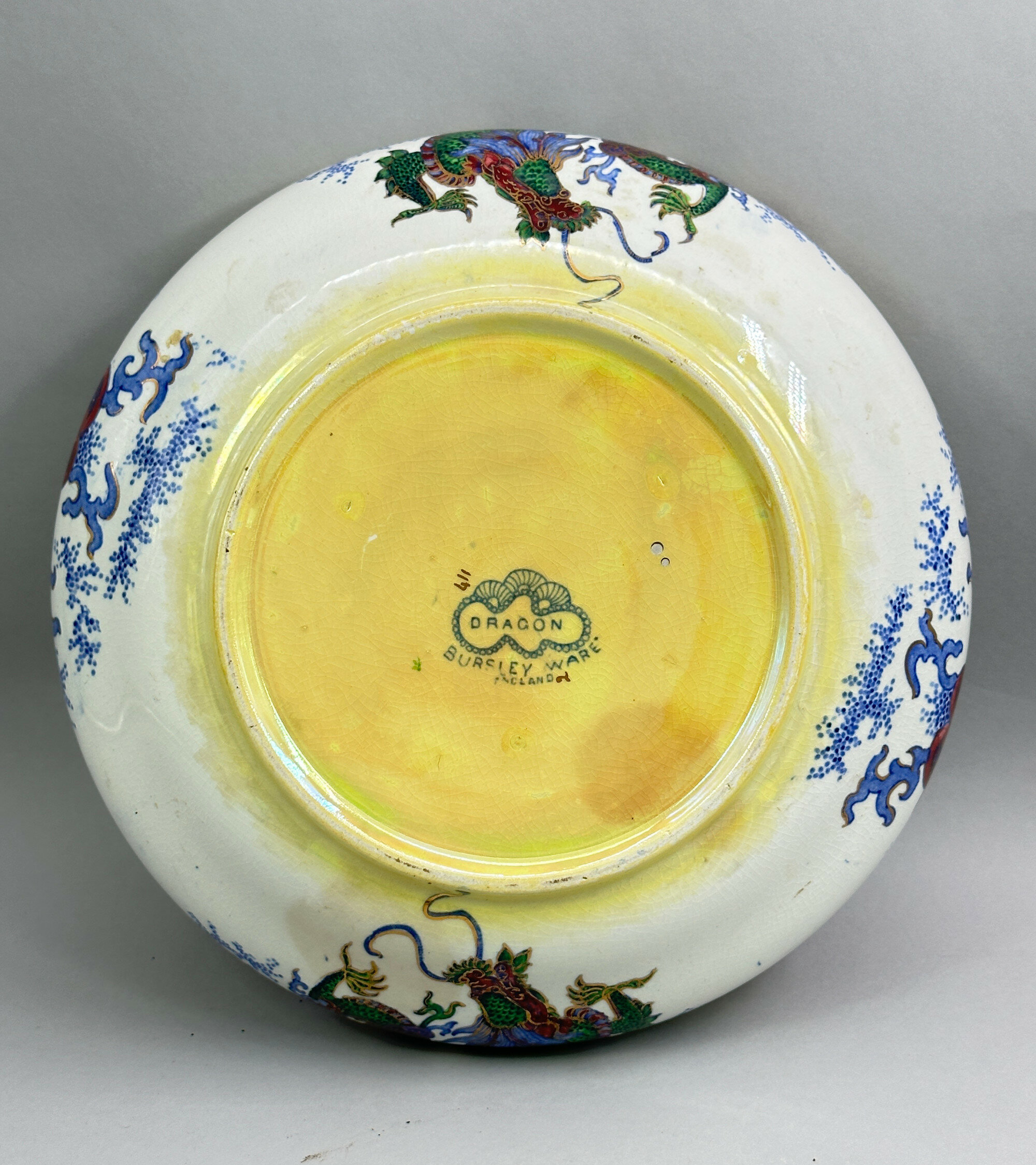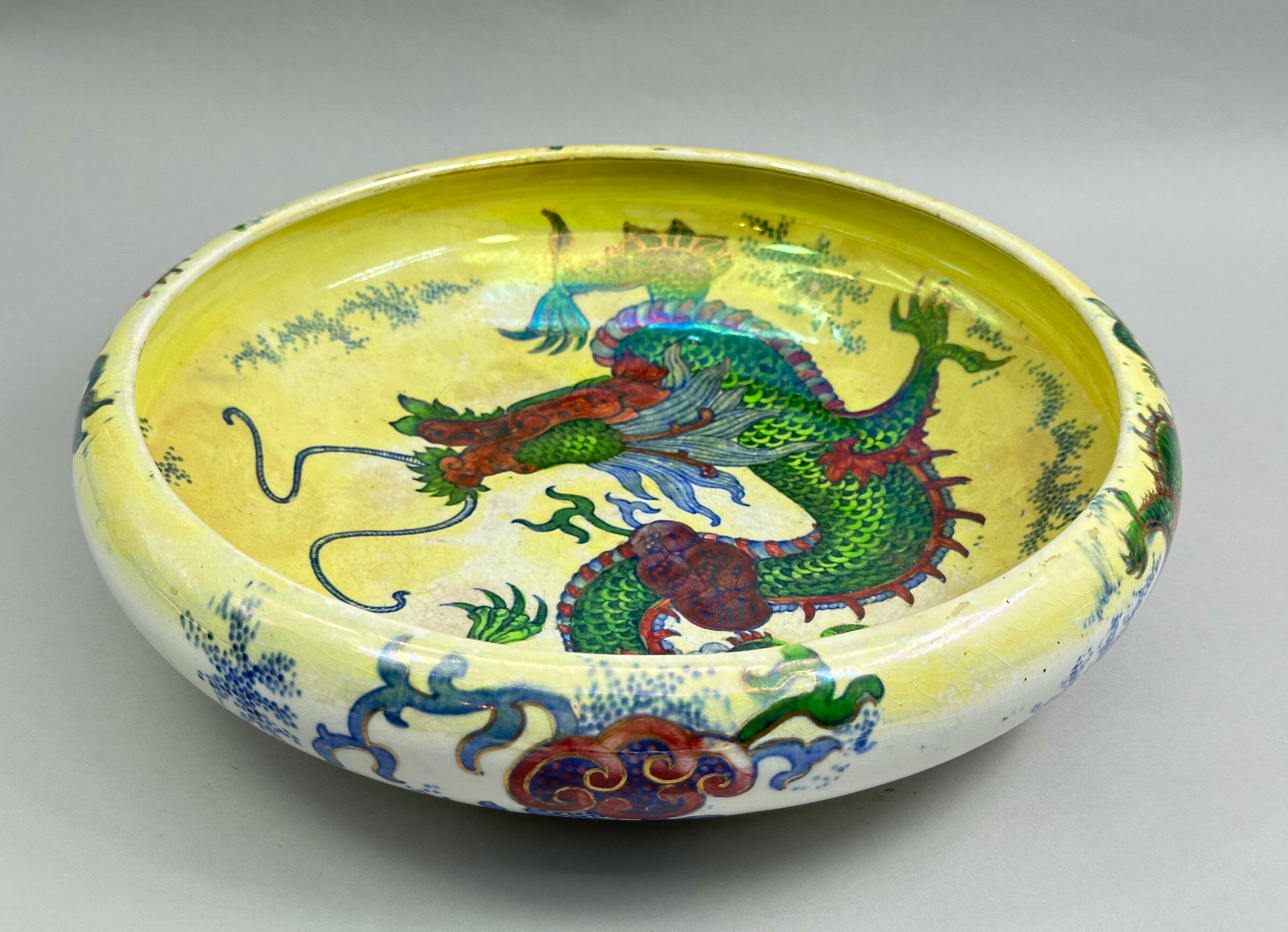 A shallow ceramic bowl of squat form with a turnover rim, resembling a Chinese brushwasher, the yellow lustre glaze with a feint craquelure and boldly decorated with an interior design of a dragon pursuing the flaming pearl amidst seaweed, the exterior with two similar dragons, all coloured in bright shades of red and green with the outline design in blue, the base glazed and with the mark ‘Dragon’ within a rococo style border and the manufacturer’s name ‘Bursley Ware England’. From 1910 to 1982, the firm Wood and Sons Ltd operated potteries at the Trent, New Wharf and Stanley Potteries Burslem. Throughout its history the firm produced high quality earthenware pieces aimed at the middle market, using a variety of brand names including Bursley Ware. Frederick Alfred Rhead, the Father of Charlotte Rhead, was a ceramicist and designer who worked for Bursley Ware in the 1920s and 1930s. The ‘Dragon’ pattern is one of his best known designs and was made in a variety of forms and colours including white and orange. The yellow glaze here is particularly effective and the piece combines Chinese inspired designs with an Art Deco twist to produce an object with decorative appeal even today.