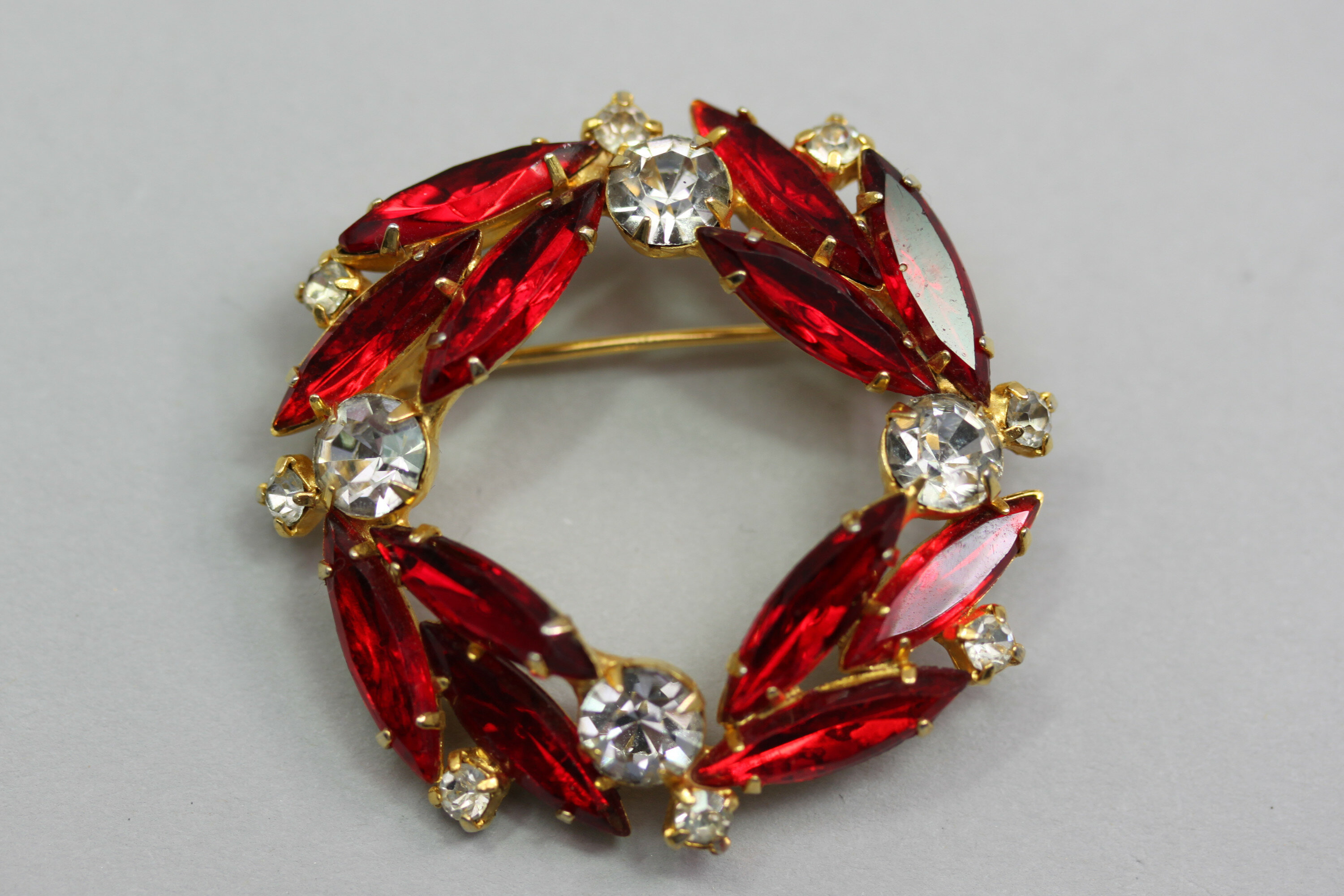 This is a lovely set of a matching necklace, earrings and brooch. All gold tone set with clear and red paste stones; the earrings are clip fastening and quite strong but also quite light so will be comfortable.| Size: | Brooch 4 cm diameter, Earrings 3 cm ht, Necklace 38 cm |