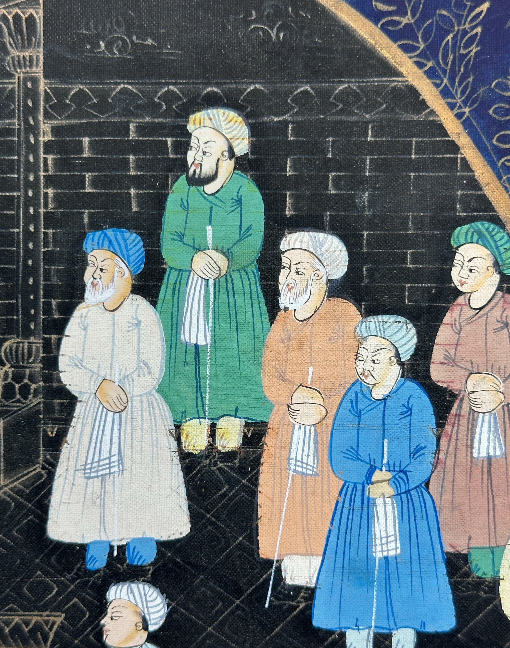A Mughal style gouache painting, the central roundel depicting a court figure scene with a dignitary seated in a pavilion surrounded by attendants, all within a walled enclosure, and the blue ground border with four further attendants, seated, with gilt foliage decoration. Gouache paint is similar to watercolour, but is modified to make it opaque. It was commonly used by Persian artists from the thirteenth century onwards. The style of painting here, though, suggests a dating to the C20th and Indian work in the Mughal Court style which was derived from Persian artists. The frame is modern.| Size: | 25cm x 32.5cm (including frame) |