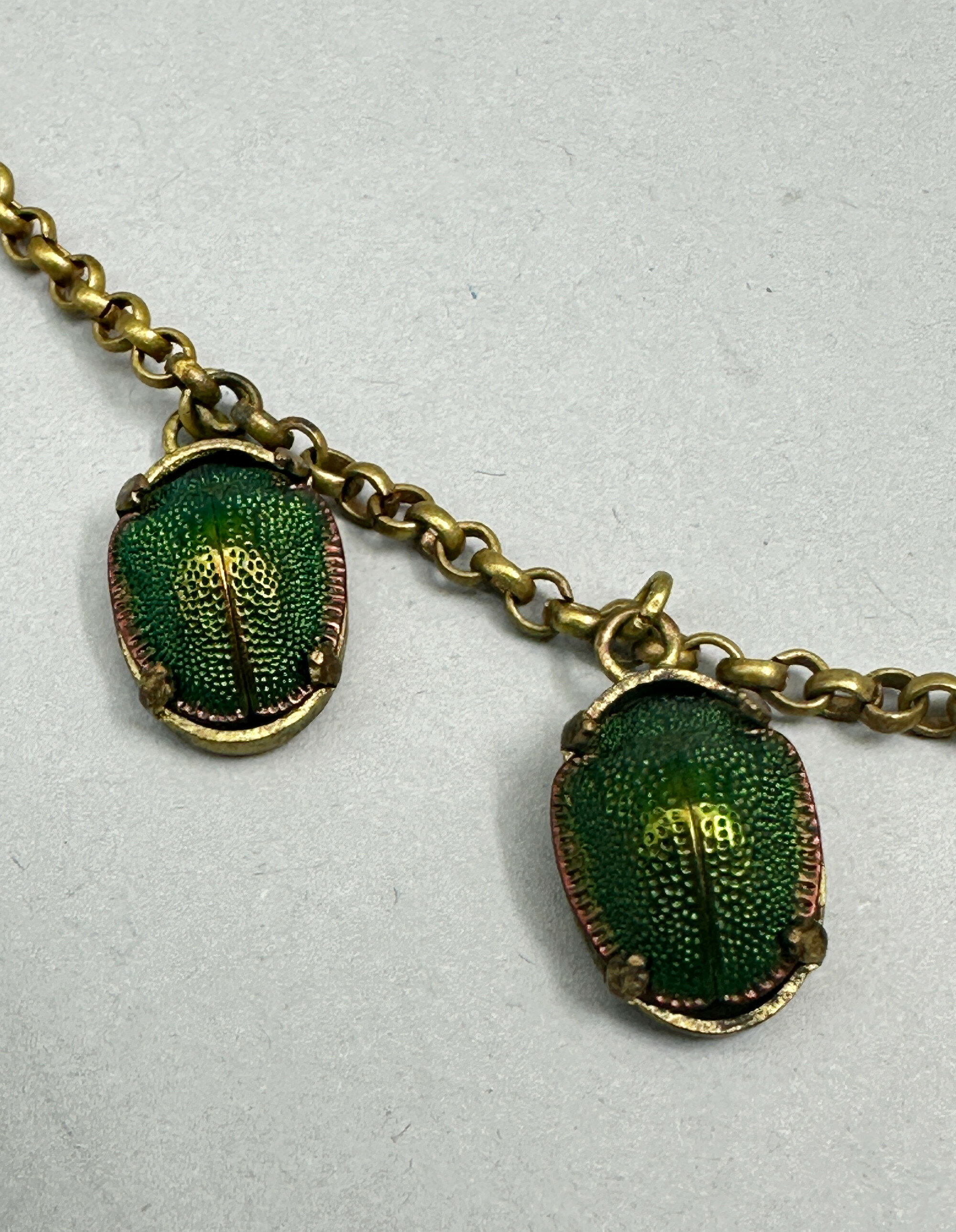 This is a gorgeous and rare necklace set with five real iridescent beetle drops in open back settings. The setting and chain are rolled gold and there is a barrel clasp closure. The Victorians loved this type of scarab jewellery due to the nod to Egyptian motifs and the use of real insects. This was aligned with the popularity of taxidermy decorations for the home.| Size: | The necklace is 36 cm long, drops measure 1.5 cm. As the necklace is quite short, please take this into consideration. Could be fitted with an extender. |