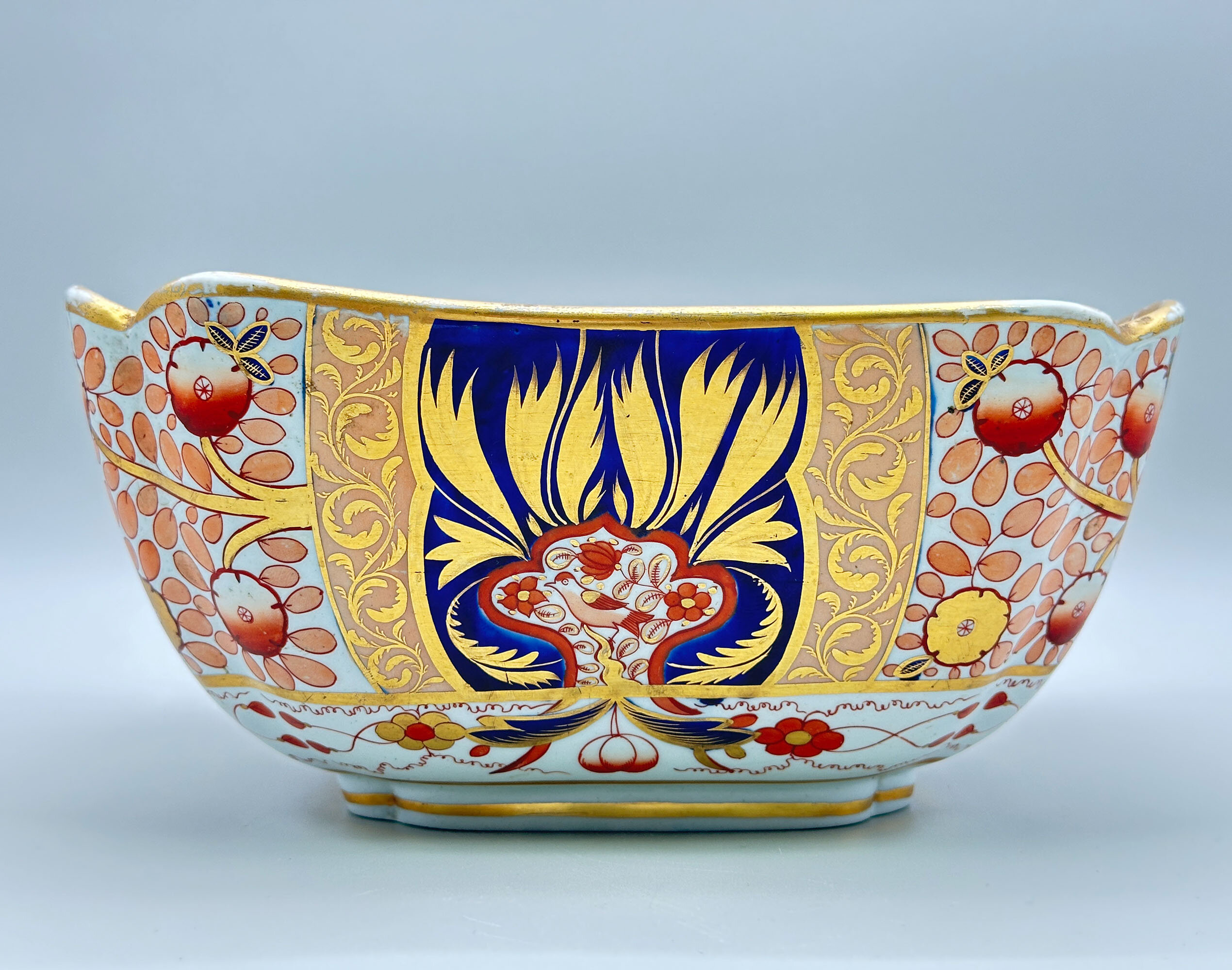 The square form bowl, indented at the corners and curving inwards towards the base, was a classic Chinese form and is usually referred to as a salad bowl. The standard Chinese dinner service would have had a pair of these, but the shape is rarely found in the English dinner wares made in imitation. Its occurrence here combined with a firmly dateable early nineteenth century pattern in an opulent design which has survived in a remarkable state of preservation makes this very much a ‘one off’ piece and a highly desirable addition to a collection of nineteenth century decorative ceramics.