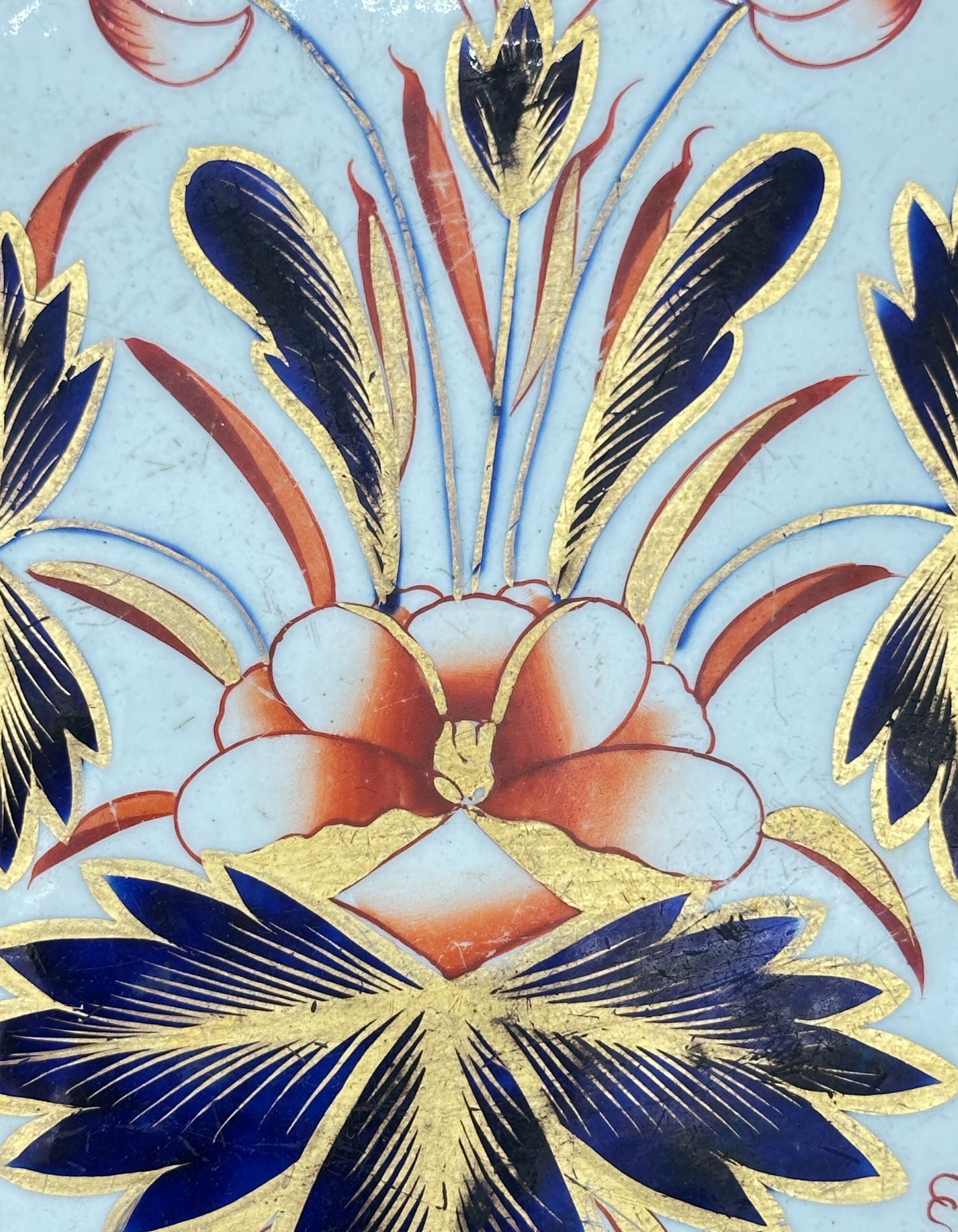 Spode is one of the great names amongst the English potteries of the eighteenth and nineteenth centuries. Founded by Josiah Spode in 1770 it saw under his leadership the development of innovatory techniques for transfer decoration onto earthenware and the production of bone china. But there was another important invention which was introduced by Josiah’s son, Josiah II, who took over the running of the firm after the death of his father in 1797. ‘The Times’ in 1817 referred to a range of ceramics now produced by the firm called ‘Stone China’ which it described as ‘newly invented’. There is some mystery about this. The technique of producing ‘stone china’ was invented by the sons of the Staffordshire potter John Turner and by repute Josiah Spode II bought their patent in 1805 when they went bankrupt. This conflicts with the reference in ‘The Times’ and according to Leonard Whiter in his authoritative book on Spode, examples of the ware decorated with patterns introduced before 1813, when it began to be manufactured in volume, ‘are rare in the extreme. I can recall seeing only one – a magnificent service in the freehand Imari-style pattern, 1409, introduced c1810’ (Leonard Whiter : Spode p191).The bowl featured here is indeed marked ‘1409’ (see image 8) alongside a form of the name ‘Spode’ which dates to before 1821 (Leonard Whiter : Spode p224). It most likely derives from the service which Whiter once saw complete but has now, presumably, been dispersed. The pattern with its vivid palette of red, blue and gold and floral decoration is a lavish reinterpretation of the ‘Imari’ wares which had been exported to the West in great quantities by the Chinese in the eighteenth century and the Japanese before them. These pieces took their name from their port of export in Japan, Imari; they were actually made at Arita in the former Hizen province. Amongst the wares exported by the Chinese were extensive dinner services and their popularity caused them to be copied and imitated by many of the English potteries from early 1800s onwards, indeed a near identical and contemporary version of this pattern was produced by Coalport.