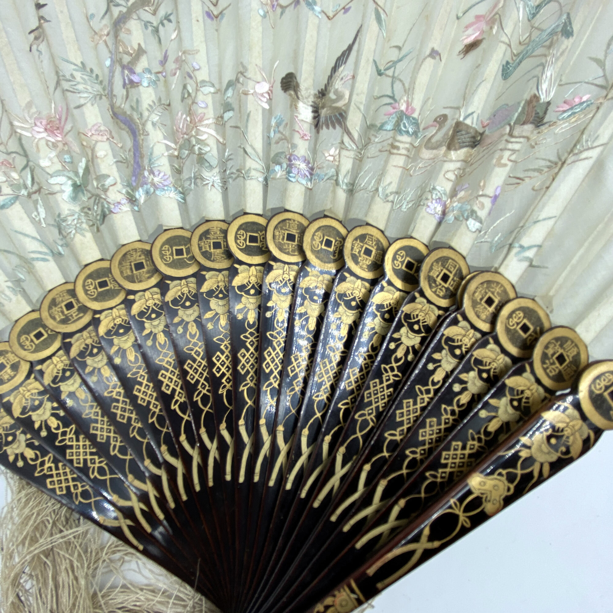 This is a very rare and beautiful fan comprising embroidered silk with a Chinioserie pattern of birds and foliage. The sticks are celluloid with a gold Chinese design. Comes in the original box marked Abaniqueria Malaga.| Size: | open 51 cm wide 30 cm long |