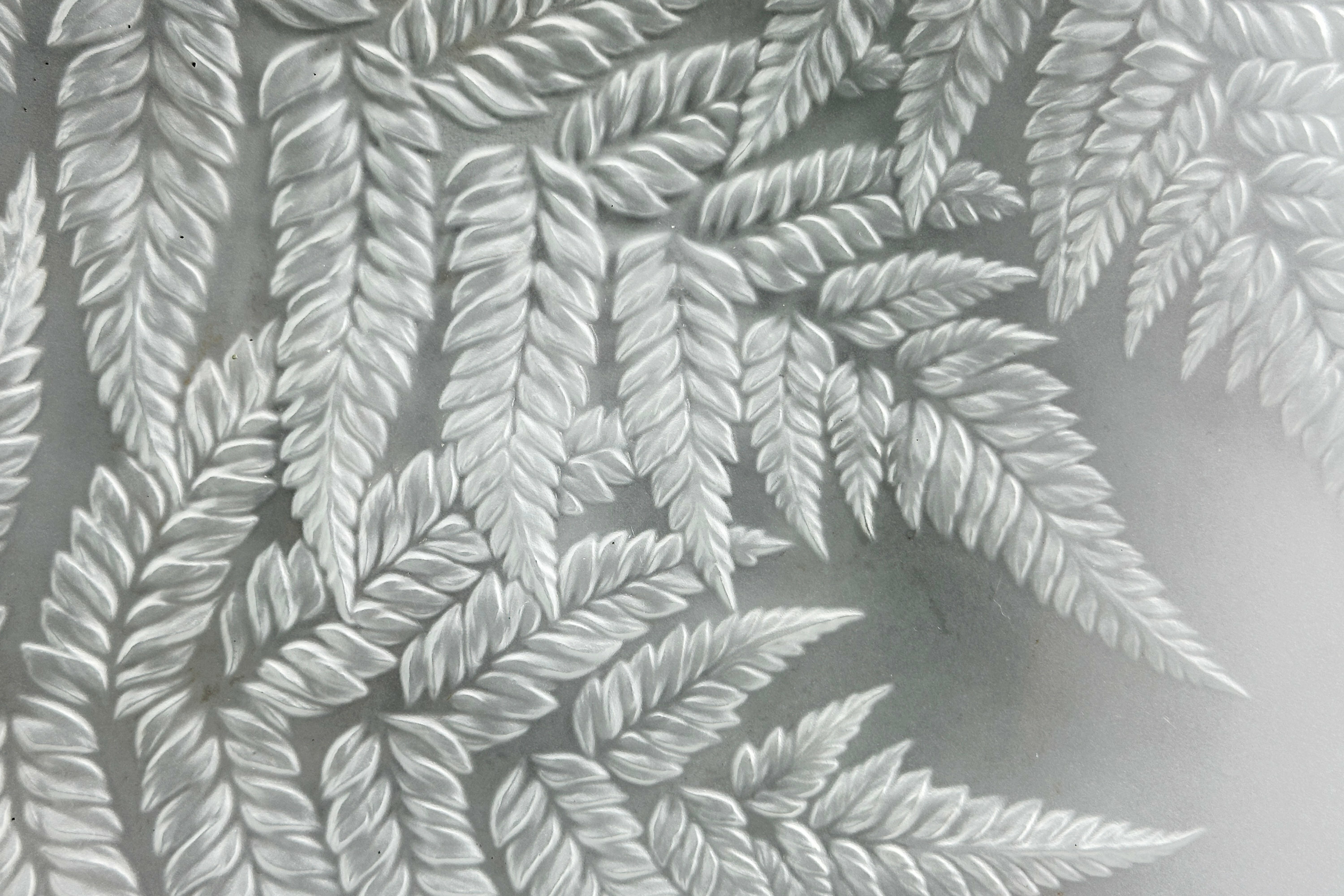 A Scandinavian glass dish of slightly irregular form decorated with sprays of fern and a pseudo Chinese seal mark. The form and technique and style of decoration of this piece resemble closely very similar dishes made in various designs by the well known Swedish firm Kosta Boda. None of these are marked but the designs are distinctive and this is most likely what we have here. These dishes seem to have been table ware and were made in a range of sizes; the dimensions here imply a serving dish. The decoration is formed by the hand pressing of the glass into a mould. The topside is smooth while the underside is modelled with the design. There is a well known series of Kosta dishes comprising a hand made set in the 'Party' pattern and designed by Ann & Goran Warff in 1975. The similarities here imply a similar dating.Kosta Boda, previously known as Kosta Glasbruk, is a Swedish glassmaking company founded by two foreign officers in Charles XII's army, Anders Koskull and Georg Bogislaus Staël von Holstein, in 1742.It is located in Kosta, Sweden. Early production consisted of window glass, chandeliers and drinking glasses. From the 1840s, the factory was at the forefront of new trends and technical developments, producing pressed glass, and in the 1880s setting up a new glass-cutting workshop. In 1903, the company merged with the Reijmyre glassworks but both retained their own names and Kosta went on to maintain its reputation as one of the leading Swedish manufacturers with a range of fine art glass and tableware by distinguished designers such as Vicke Lindstrand, artistic director from 1950-1973.