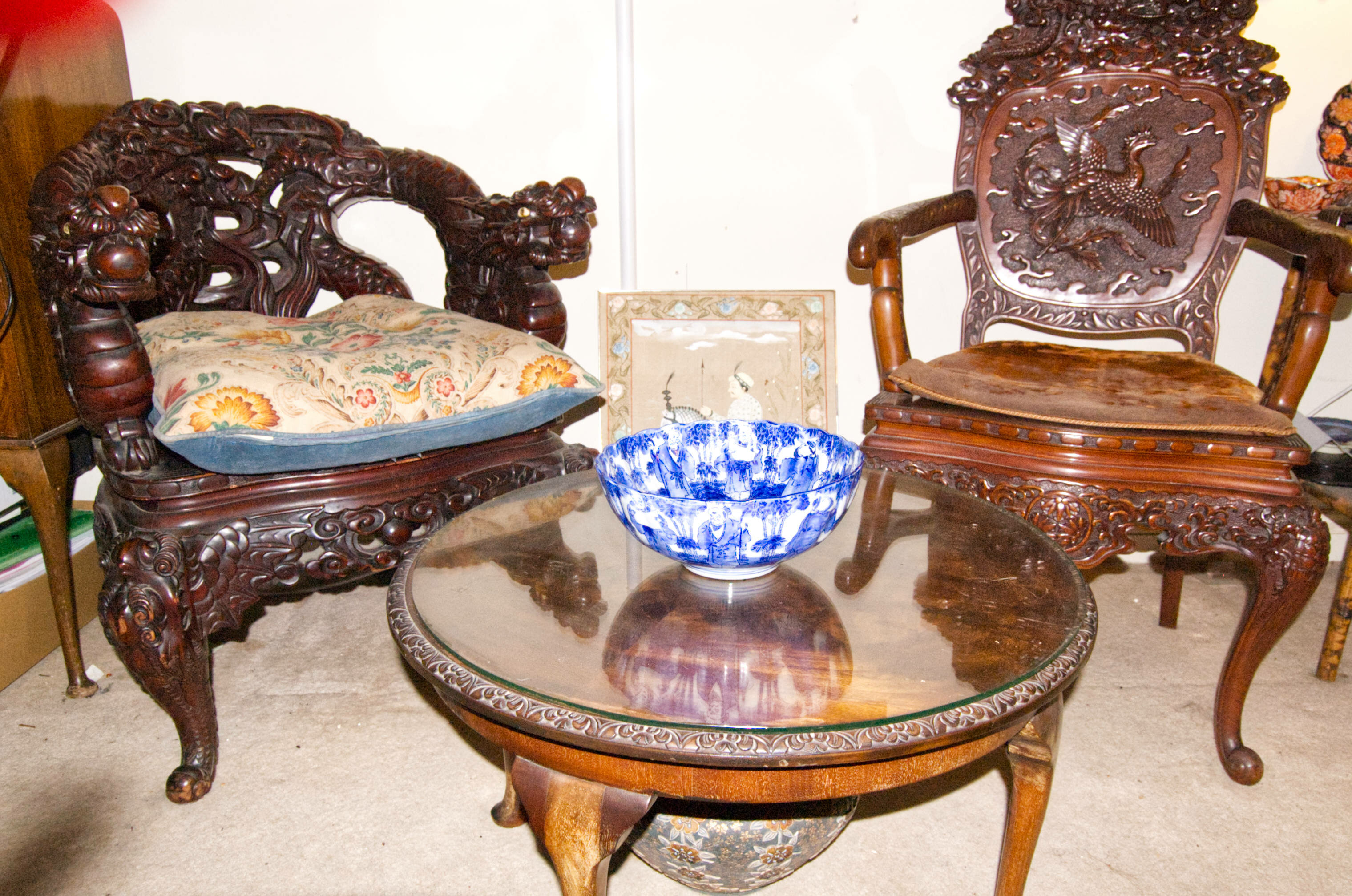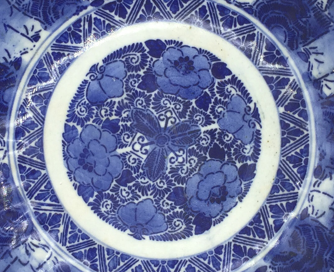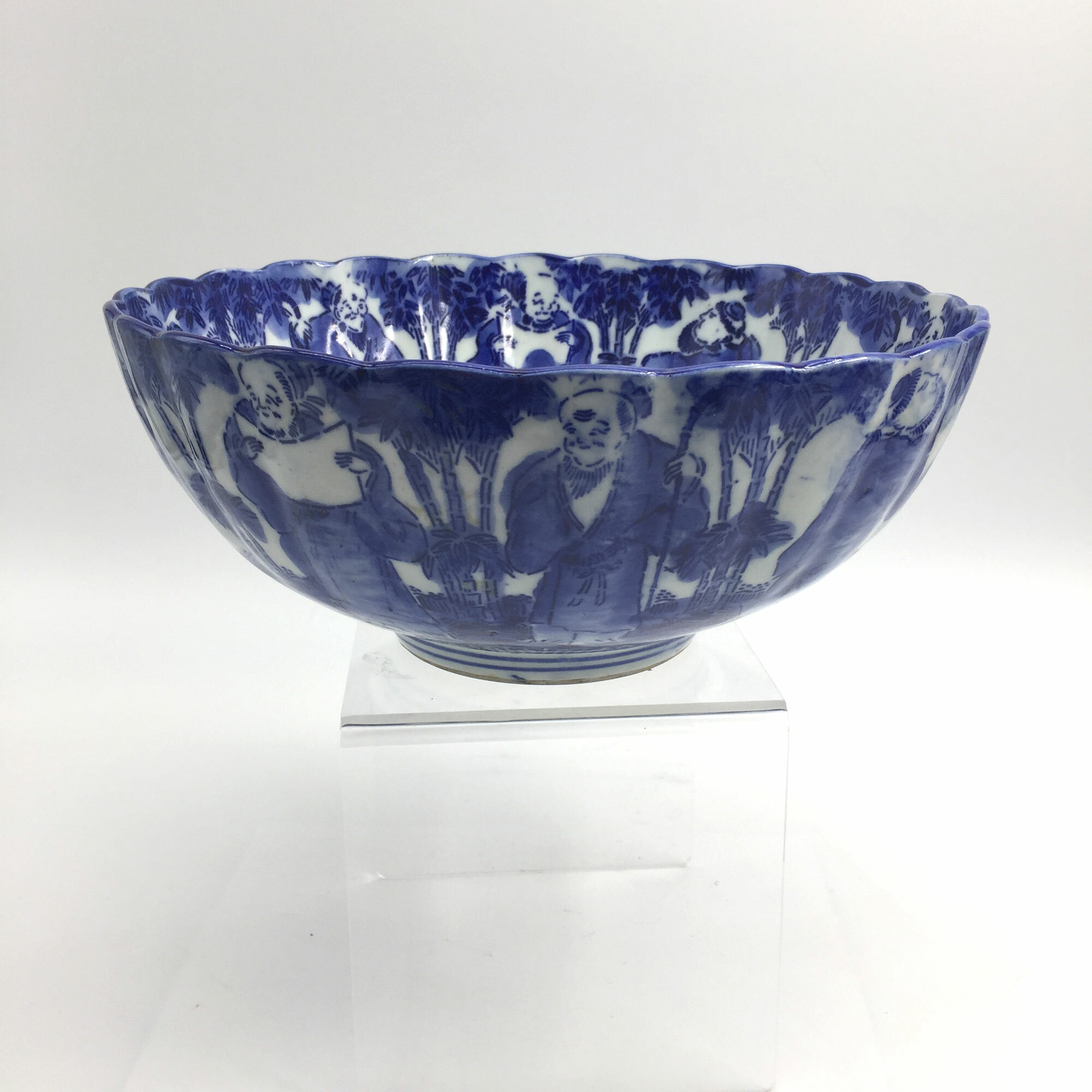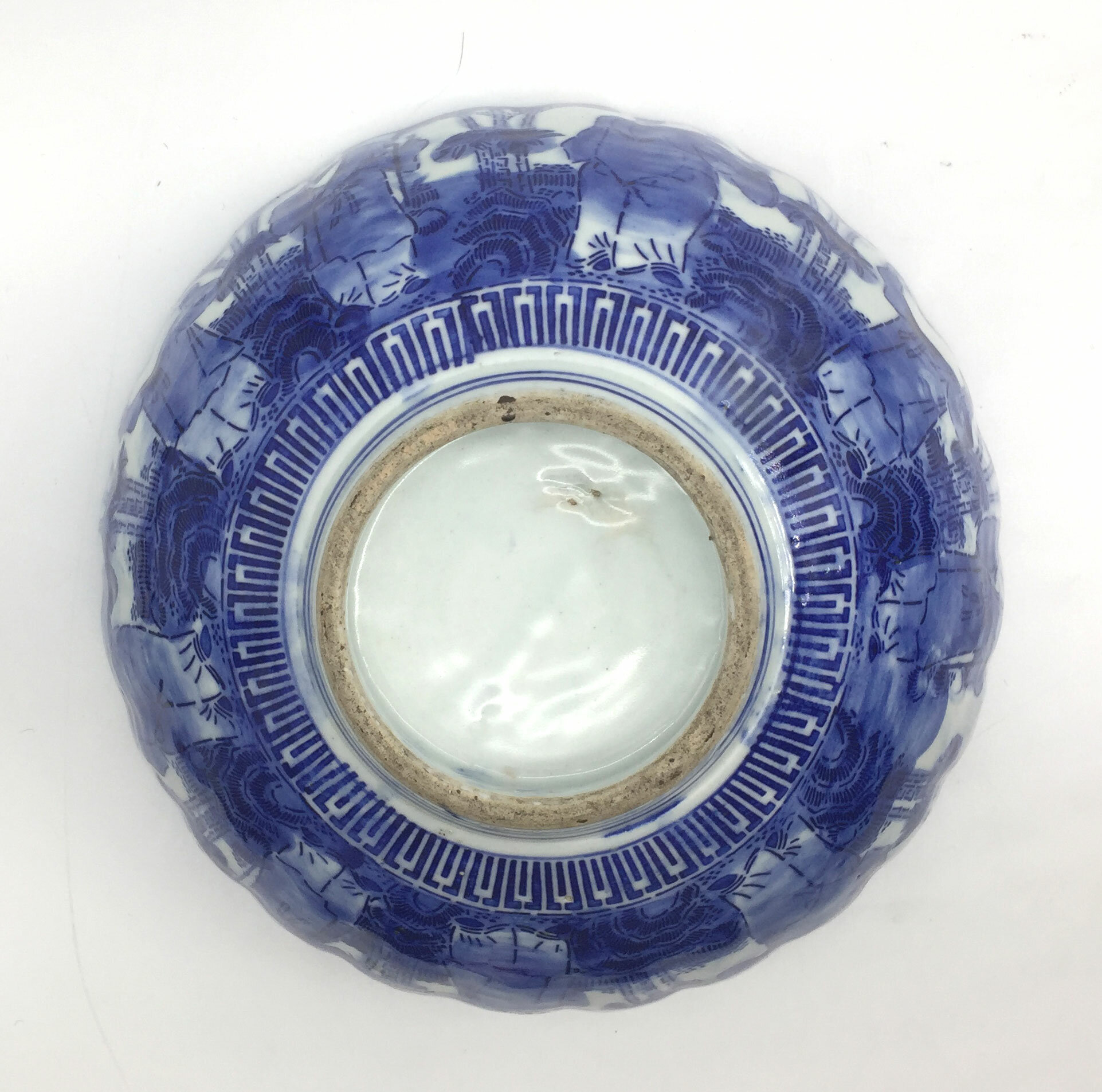 Japanese Arita Blue and White Bowl of shallow flaring form with a lightly lobed rim and a short foot, decorated in deep underglaze blue to the interior and exterior with a design of sages in a stylised landscape scene with bamboo and rocks, the centre of the interior with a roundel of stylised floral blooms and a border of repeating geometric design. This piece is typical of late nineteenth century wares made in Japan for export to the West and dates to the end of the Meiji period (1868-1912).| Size: | 25cm (diam) x 11 cm |