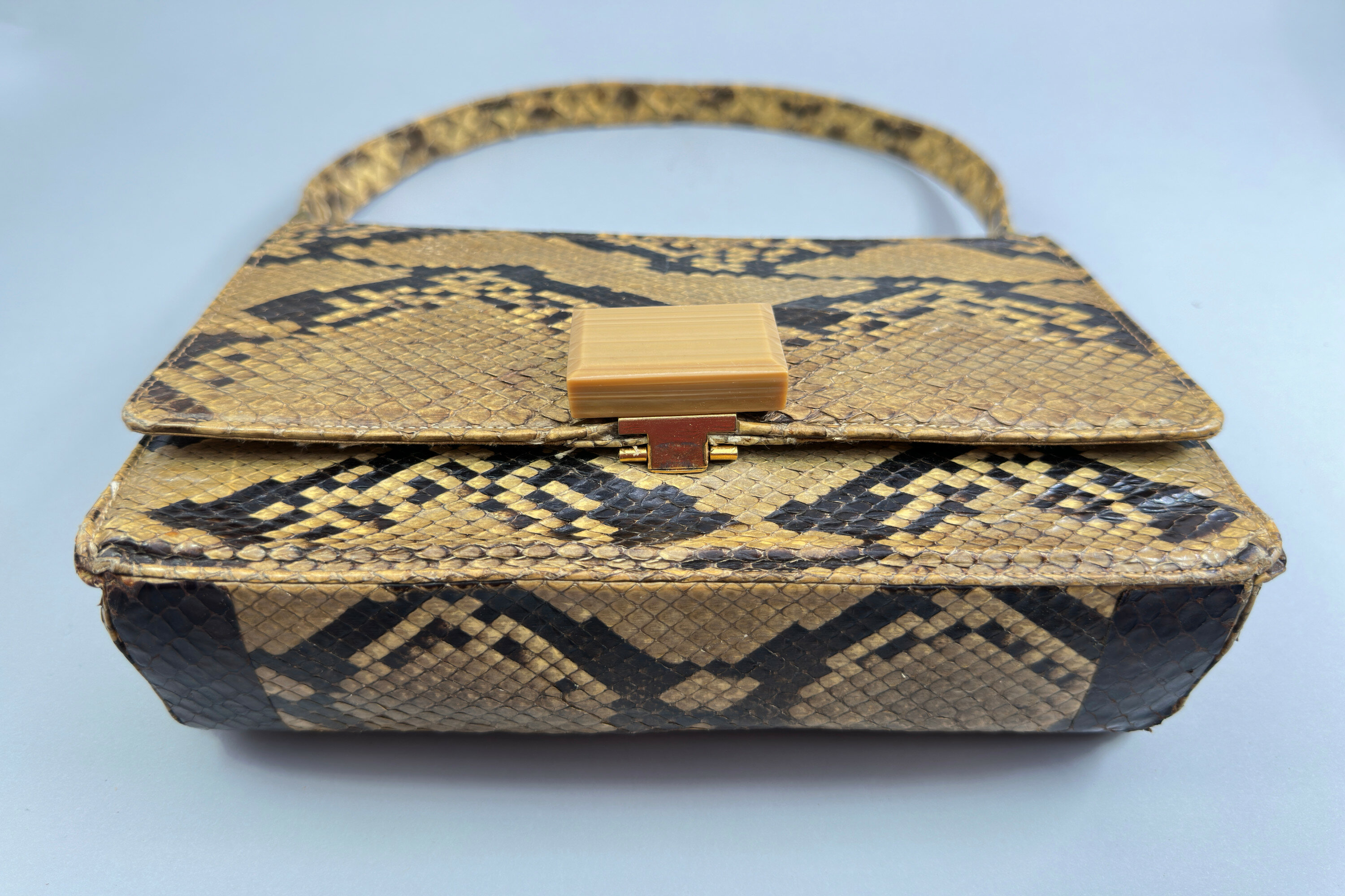 This is a very interesting bag that comprises python skin throughout. It is lined with taffeta and has python on the interior accents. It has an unusual wooden closure and a handle that is also covered in python skin and is in great condition. It is large enough for use any time day or evening.| Size: | 24.5cm (length) x 16.5cm (ht) x 7cm (max width) |