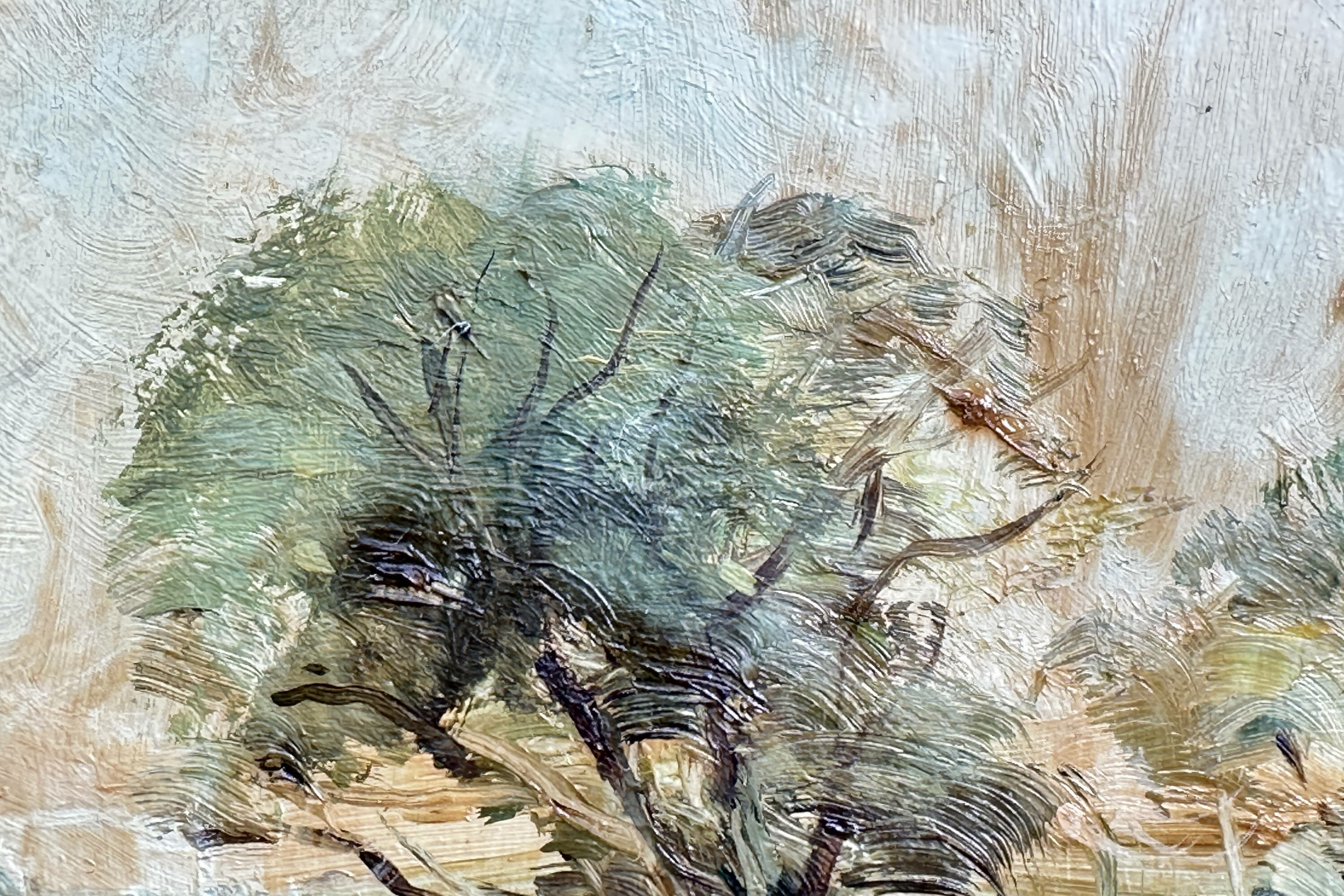 An oil painting on hardboard in impressionistic style of a landscape scene with trees, a field in the foreground and a river bank in the distance, signed, but illegibly in the bottom right corner. Doubtless the work of an amateur artist this presents an attractive scene employing the techniques of the ‘impressionist’ masters and rather more affordable than their work. The frame is simple but complementary. The use of hardboard suggests a dating to the 1950s or 1960s when that material was particularly in vogue. On the back can be made out the letters 'RICHARDSON' 'NO PIC' 'G' and the signature at the front may well be read as 'Richardson'. Many artists by that name are known but while this picture cannot be atrributed to any of them, the painter was clearly accomplished.| Size: | 24.5cm x 9.5cm x 2.5cm |