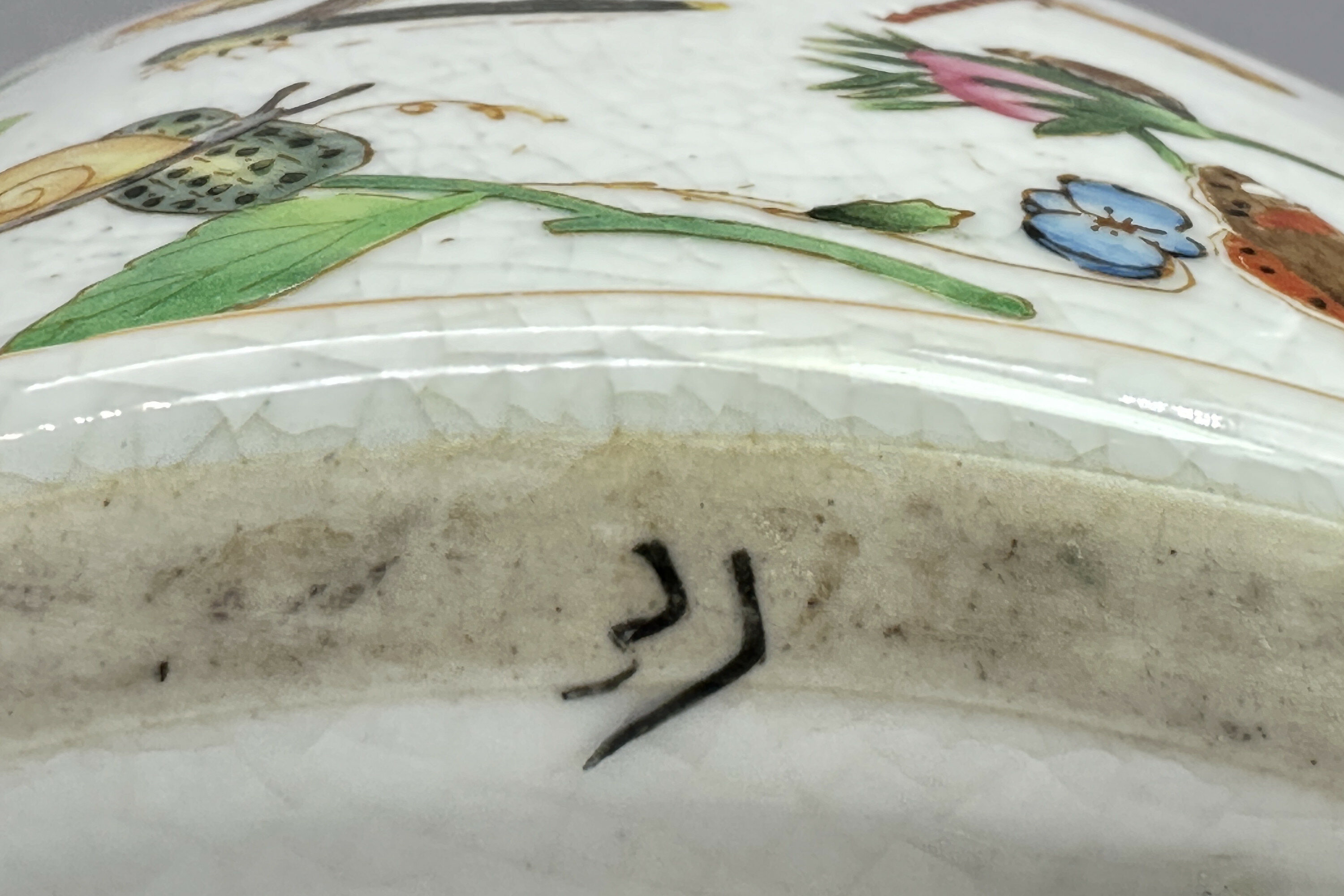 Two Chinese Export Style Jardinieres, each of deep oval form with wavy edge rims, one with rococo style handles in pink enamel and the other with lion head mask handles in iron red and mustard yellow, both similarly decorated in polychrome with insects, butterflies and flowers, the interior of the first with a floral spray and of the second with fish. Each has a slight craquelure effect to the glaze which is probably intentional and both have glazed bases with numbers applied to the biscuit foot.The form here is a miniature version of the Chinese ‘Monteith’ first produced in the early to mid eighteenth century. The wavy rim was designed to hold the stems of glasses which were stood to cool in iced water placed in the interior. The style of the decoration is in Chinese Export taste as well, but dating here is to the C20th probably around the 1960s. Some similar examples have Chinese seal marks and one the name of a Chinese manufacturer implying that these pieces were most likely made in China but this does not assist with establishing their age. Purely decorative objects then with no intent to deceive but amusing creations in themselves and pleasing to a contemporary eye.