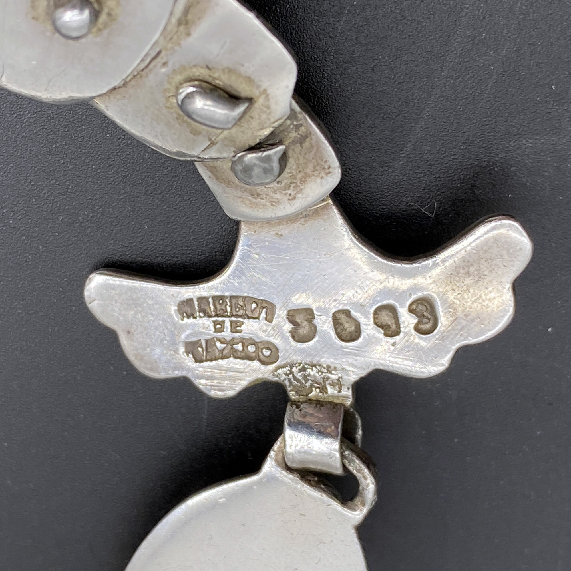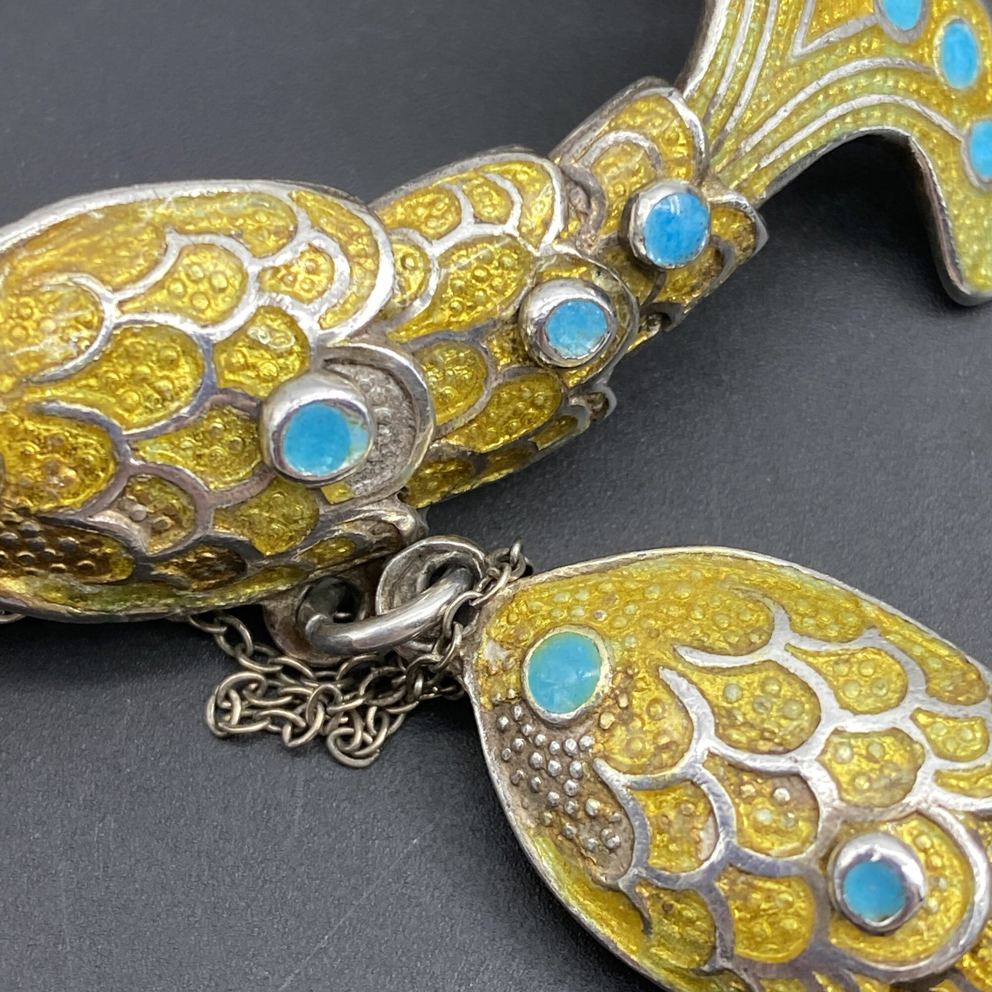This is a very robust bracelet comprising 4 connecting articulated fish in enamel and sliver with a fully articulated fish hanging with the safety chain that looks like it has been caught on the chain. Made in the famous Taxco workshops in Mexico started by William Spratling in the 1930s. He is known as the Father of Mexican Silver.| Size: | 22 cm long, the fish that drops measures 5 cm long |